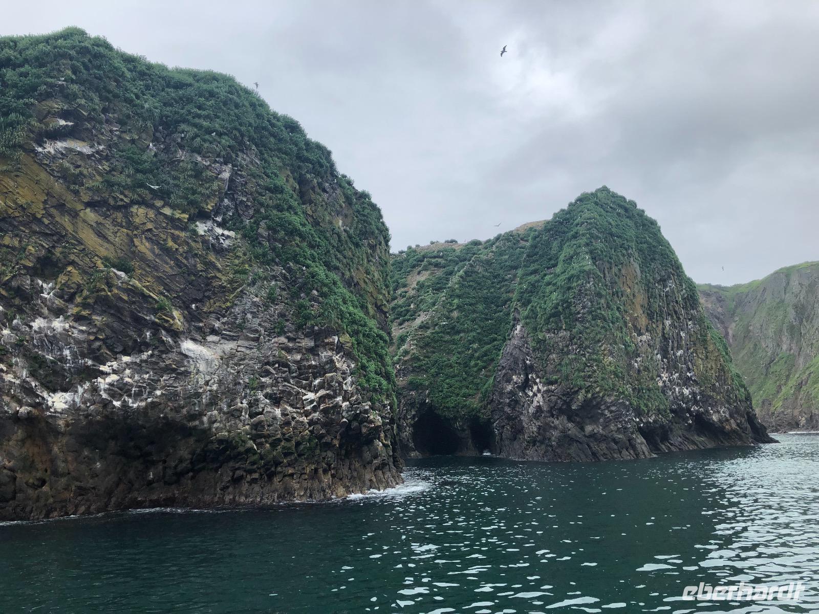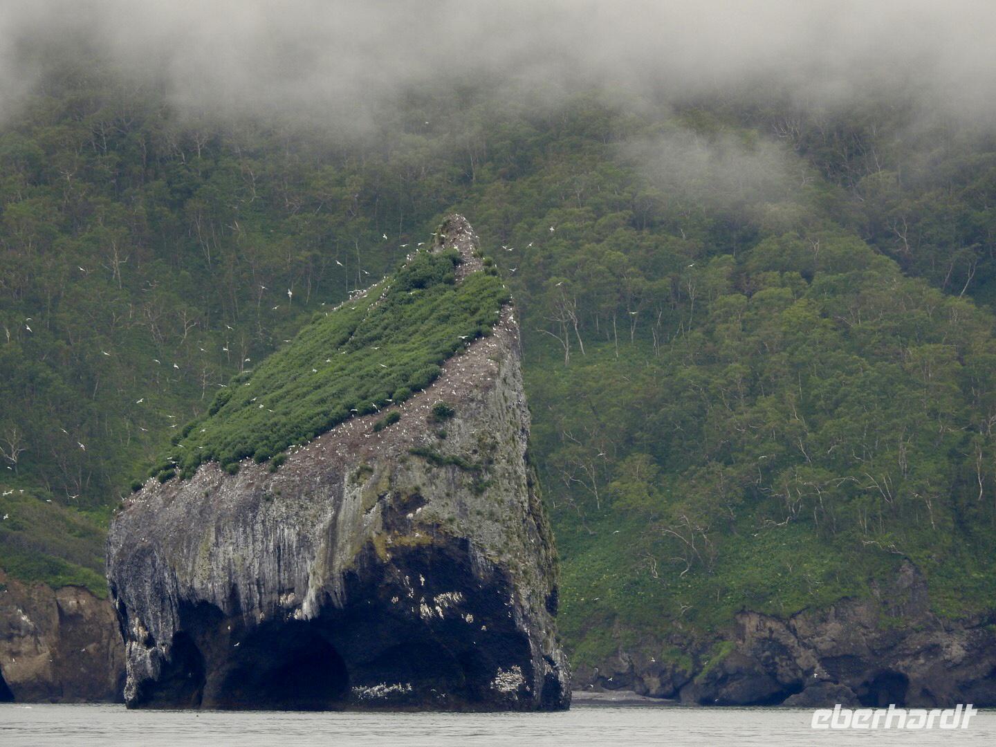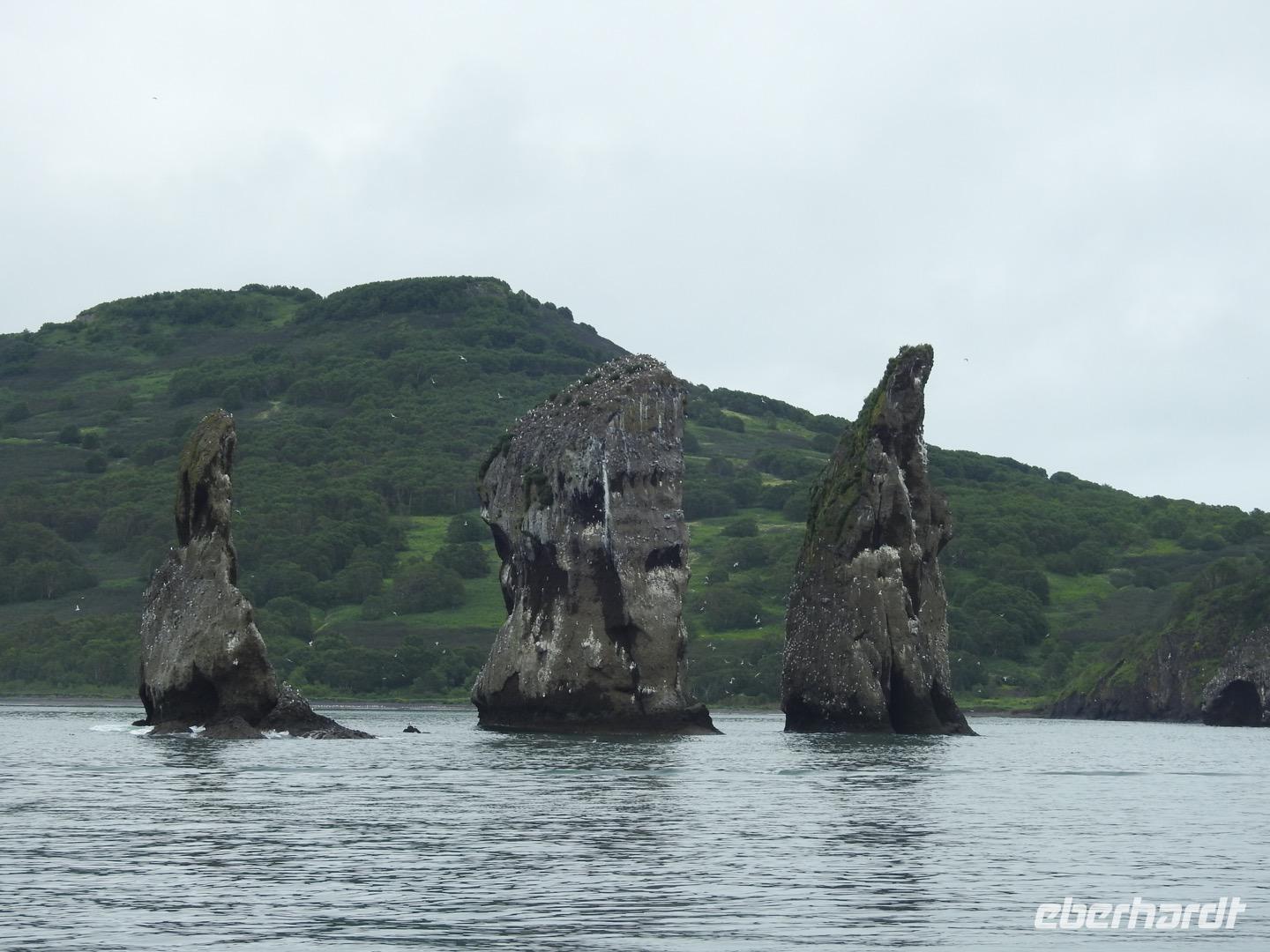 Wir fahren noch weiter auf den Pazifik hinaus und erblicken schon von Weitem die Felsnadeln namens DREI BRÜDER.Unterwegs beobachten wir Seehunde, die putzig ihre Köpfe aus dem Wasser strecken und Papageientaucher, die recht fotoscheu sind. Kaum hat man den Apparat auf sie gerichtet, verschwinden sie unter Wasser. Wir erreichen die Vogelinsel Starickow, auf der hunderte Möwen leben. Entsprechend ist der Lärmpegel.