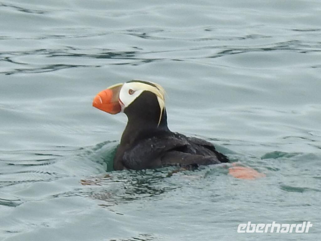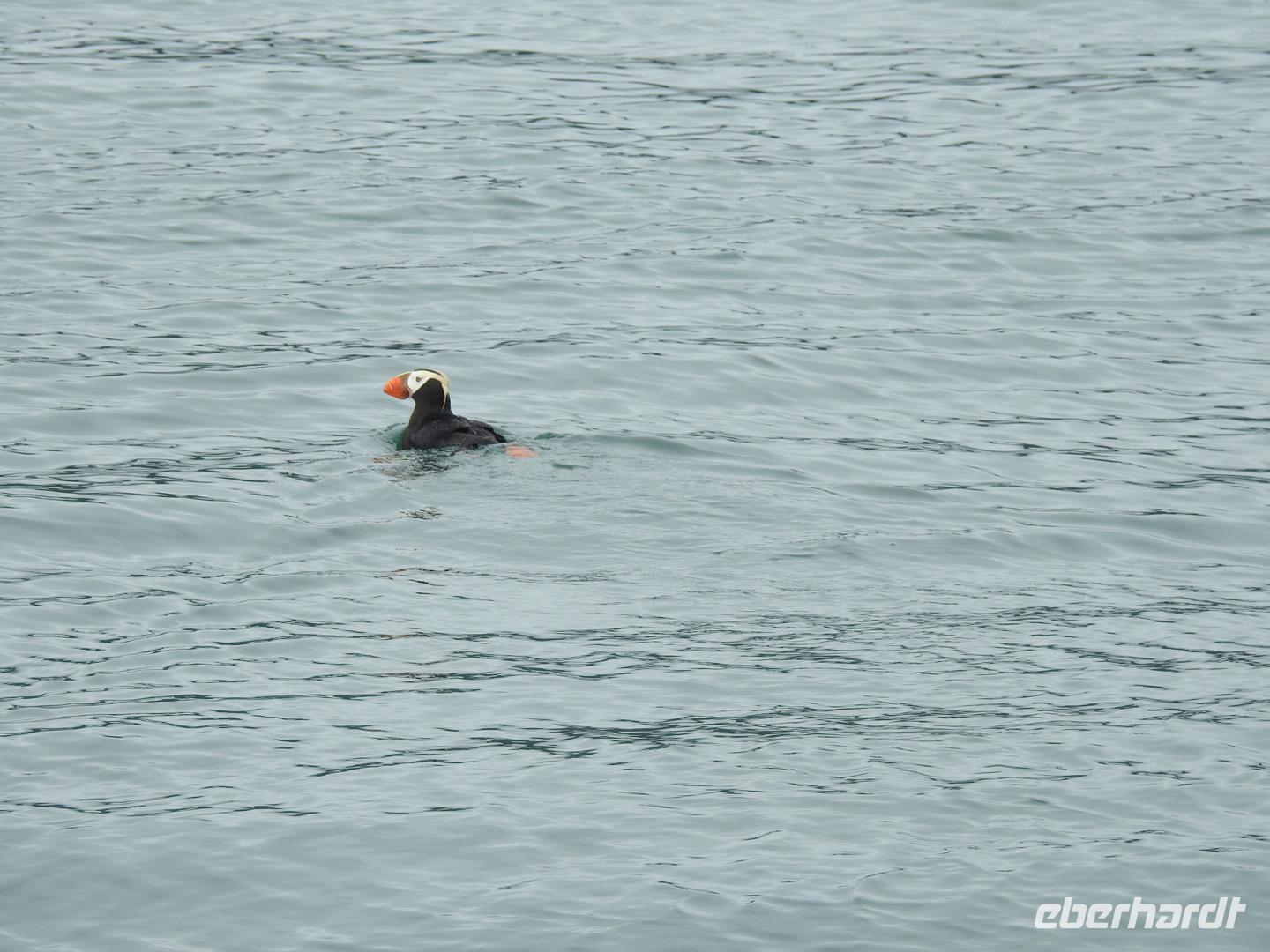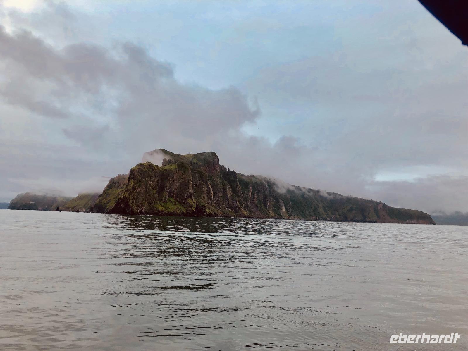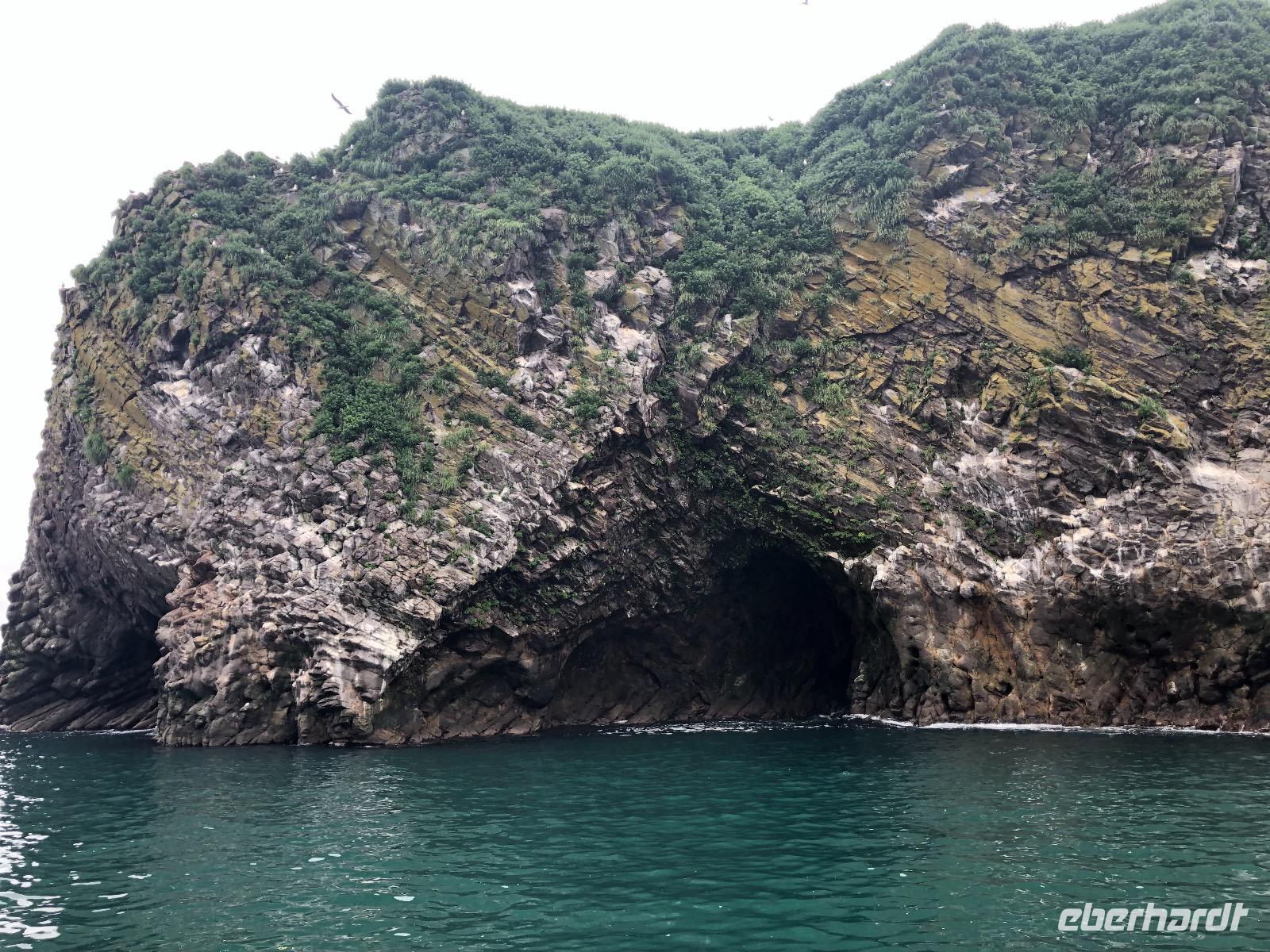 Wir fahren noch weiter auf den Pazifik hinaus und erblicken schon von Weitem die Felsnadeln namens DREI BRÜDER.Unterwegs beobachten wir Seehunde, die putzig ihre Köpfe aus dem Wasser strecken und Papageientaucher, die recht fotoscheu sind. Kaum hat man den Apparat auf sie gerichtet, verschwinden sie unter Wasser. Wir erreichen die Vogelinsel Starickow, auf der hunderte Möwen leben. Entsprechend ist der Lärmpegel.