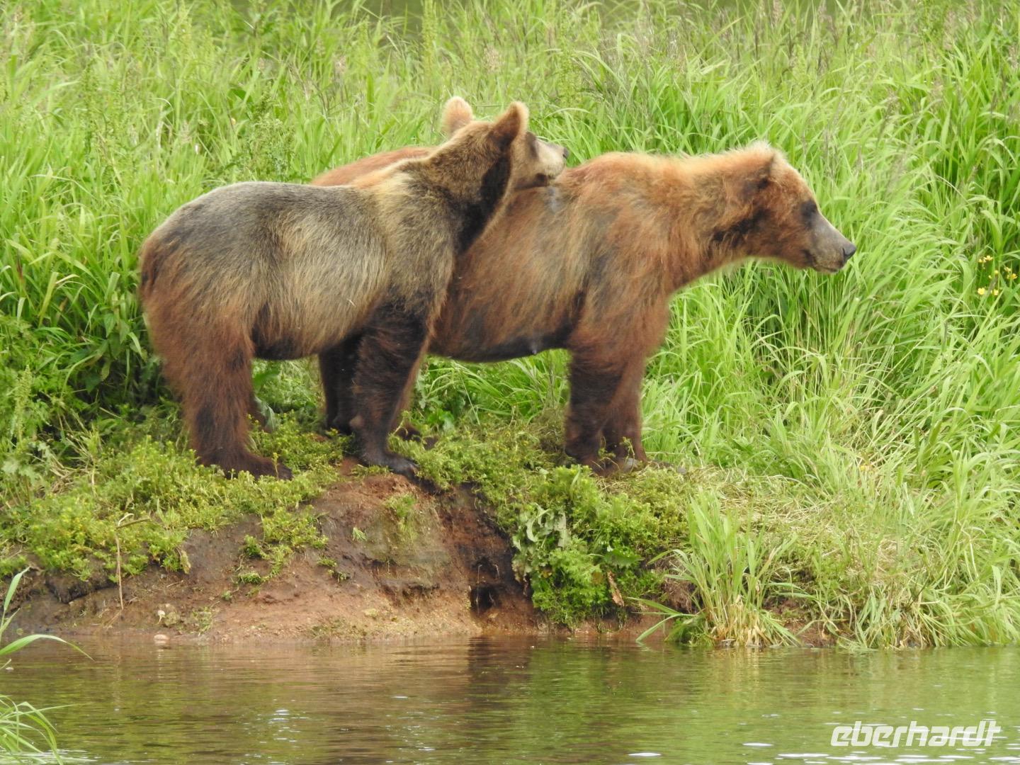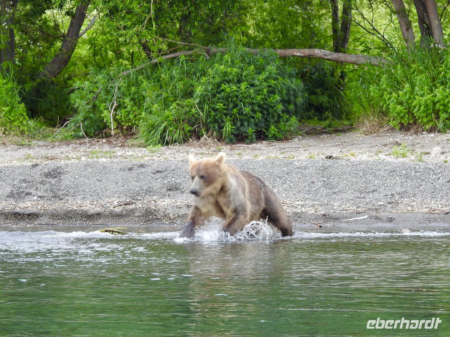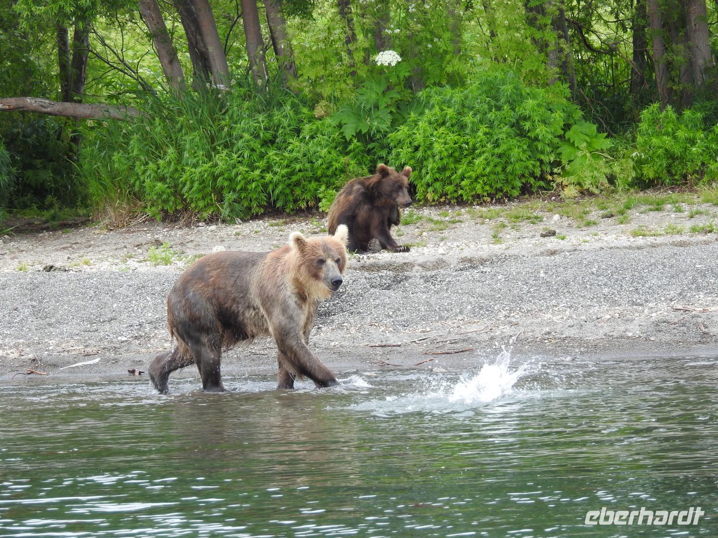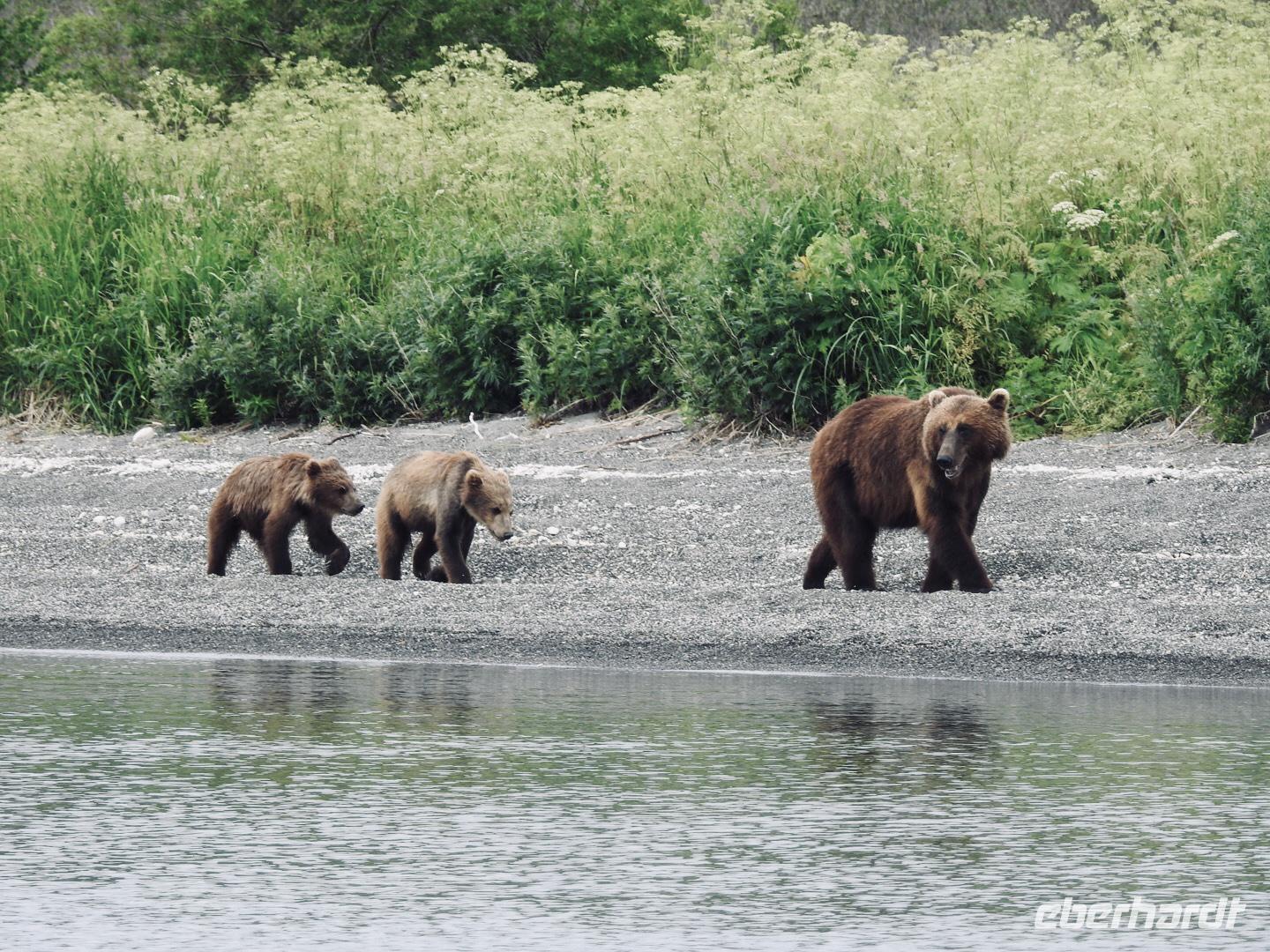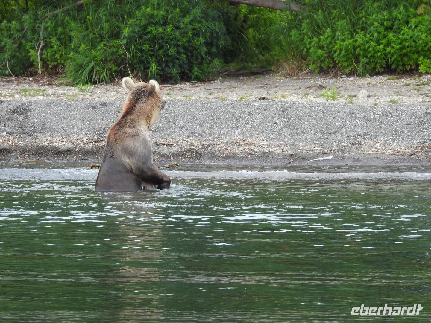 Alternativ dazu konnte bereits im Voraus die Teilnahme an einem ganztägigen Ausflug gebucht werden. Etwa die Hälfte der Gruppe hat dieses Angebot genutzt. Bereits 7.45 Uhr wartet unser Bus vor dem Hotel und bringt uns zum Flughafen. Dies ist nicht der Flughafen, auf dem wir angekommen sind, sondern ein privater Helikopterflughafen. In der modernen Wartehalle bekommen wir jeder ein Band mit der Nummer 279. Dies wird auch die Nummer unseres Hubschraubers sein. Zuerst wird noch eine andere Gruppe abgefertigt, dann werden wir aufgerufen. Jetzt heißt es, schnell sein, wenn man einen Fensterplatz haben möchte. Irgendwann haben sich alle in den Bauch des Hubschraubers und auf die kleinen Bänke gezwängt und unsere russische Reiseleiterin, die heute für uns und die anderen 12 Passagiere zuständig ist, beginnt mit der Belehrung, was man alles nicht darf und unterlassen sollte. Dann bekommen wir alle Ohrenschutz und einen Bonbon und schon hebt der Hubschrauber ab. In einer seltsamen Schräglage starten wir, aber alles ist ok. Wir fliegen über große Waldgebiete, nur ab uns zu tauchen mal ein paar Häuser auf. In den Tälern hängen die Wolken und auf den Berghängen liegen restliche Schneefelder. Nach einer Stunde Flug sehen wir den Kurilensee und an seinen Ufern bereits die ersten Bären. Doch bevor wir sie direkt bewundern können, vergeht noch etwas Zeit. Wir steigen aus und werden von einem Ranger in Empfang genommen. Wir laufen durch ein Camp, das mit Stromleitungen gesichert ist. Nach einem kurzen Spaziergang erreichen wir einen Steg und am Ufer des Flusses, der in den Kurilensee fließt und über den der Steg oder die Brücke führt, tummelt sich eine Bärenfamilie. Auf dem Steg taucht auf einmal ein Bär auf und nach kurzer Zeit hat er sich einen Lachs aus dem Fluss gefischt. Diese Darbietung war bestimmt für uns. Wir laufen zurück zum See und werden in zwei Gruppen aufgeteilt. In unser Boot passen 11 Personen, aber mit den Schwimmwesten am Leib, wird es ganz schön eng. Mit einem Affenzahn braust unser Schiff über den Kurilensee, bald wird uns auch klar, warum. Unsere Guides wissen, wo sich am Ufer die Bären tummeln. Wir haben etwa eine halbe Stunde Zeit zum Schauen, Staunen und Fotografieren.