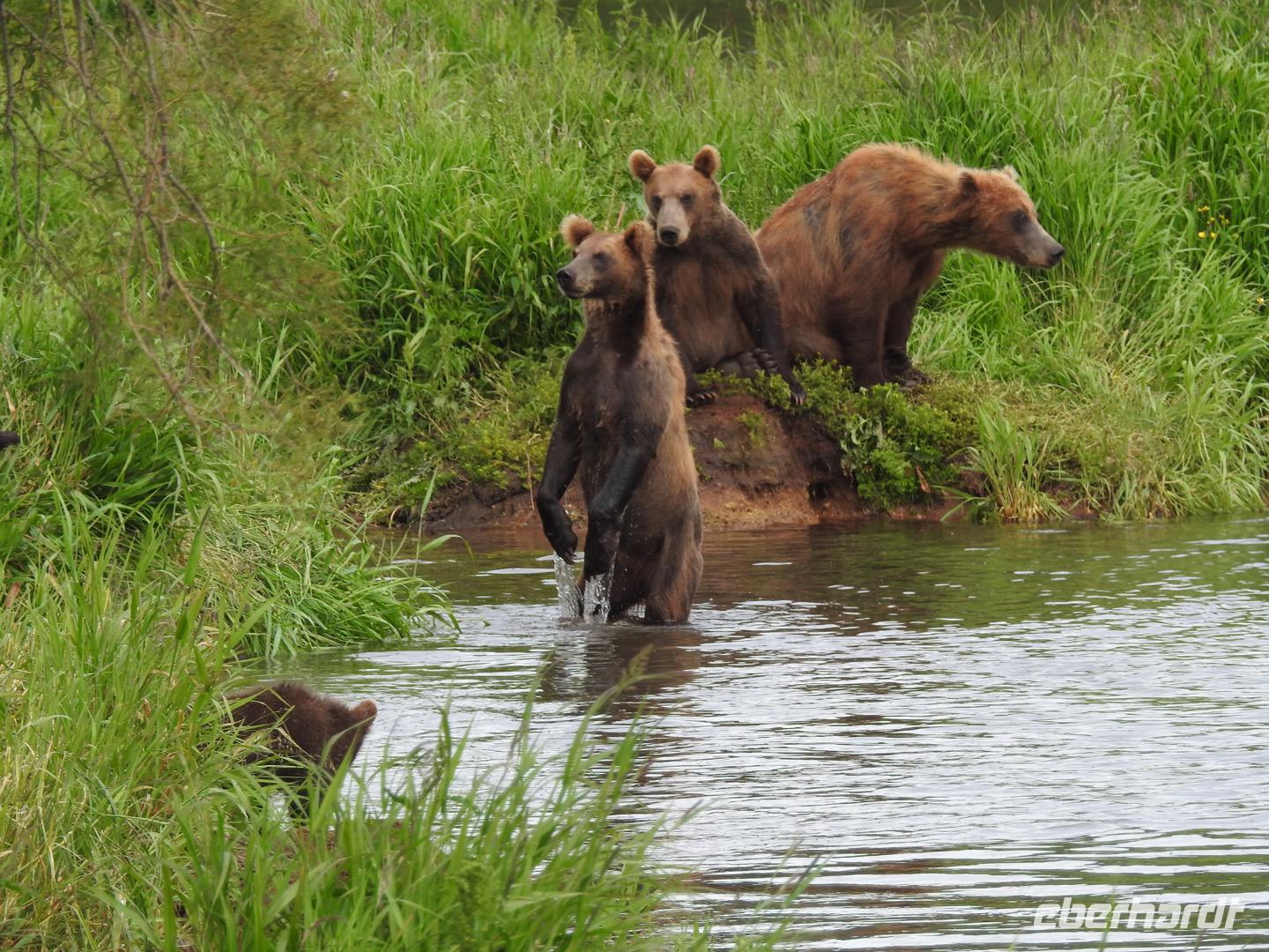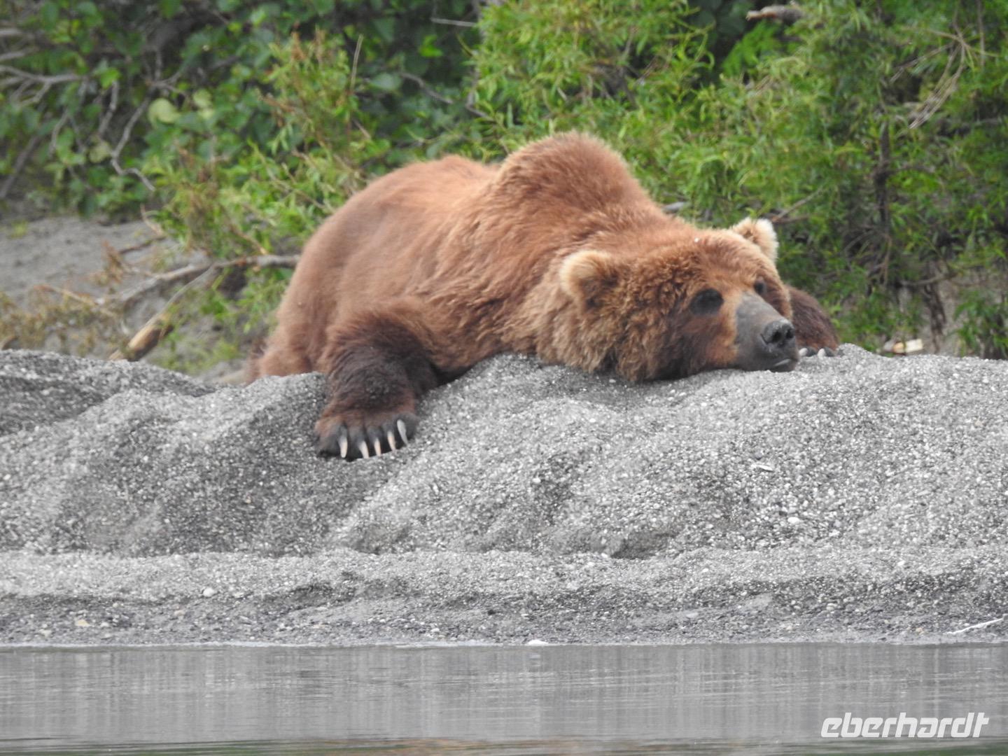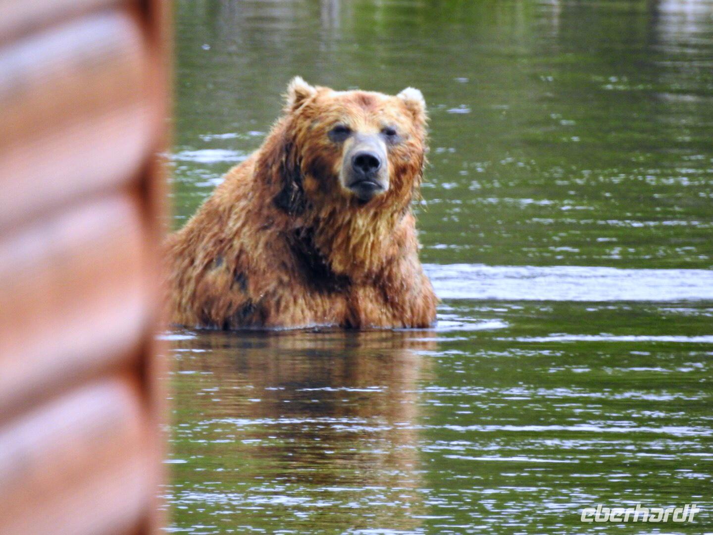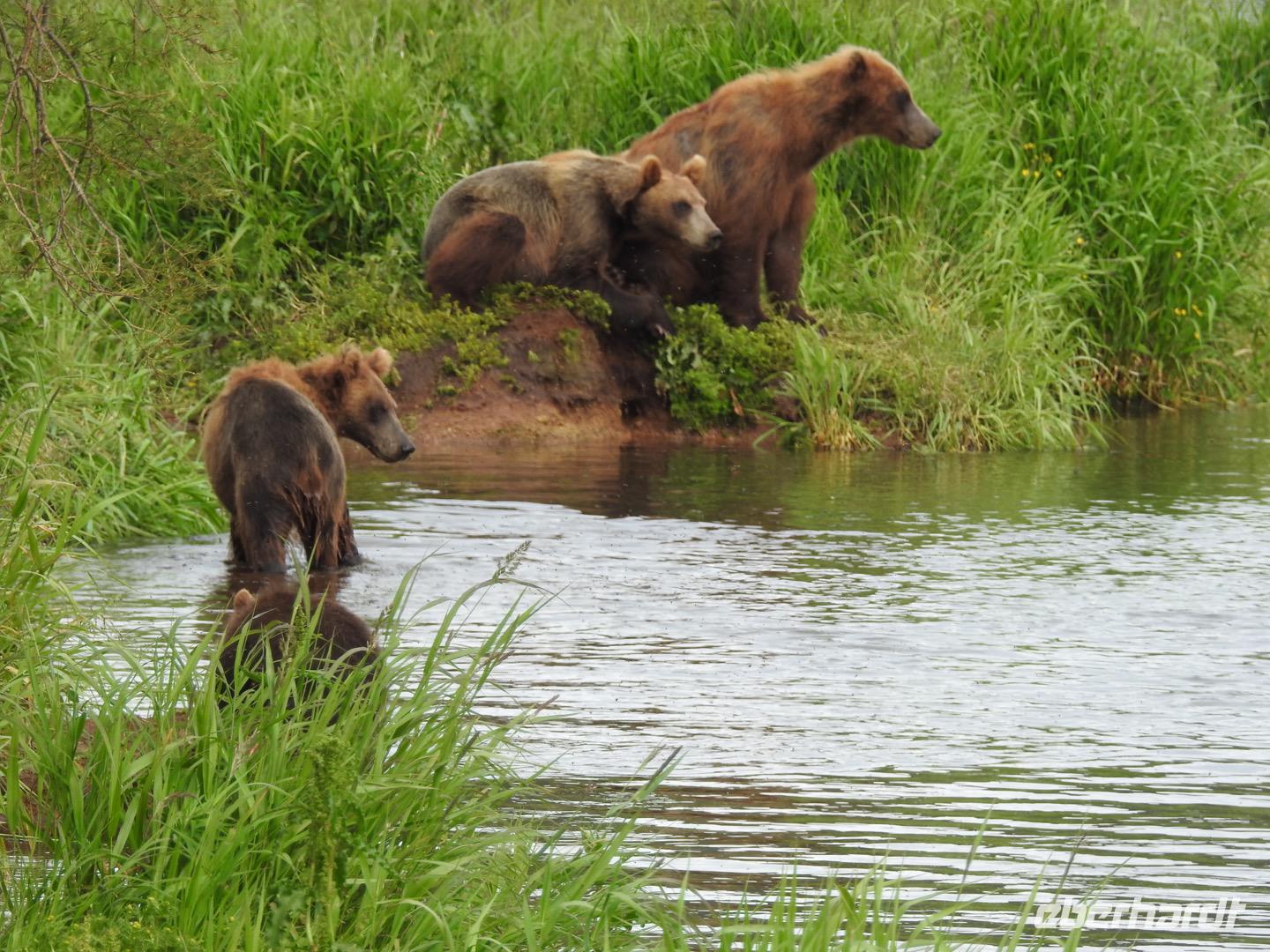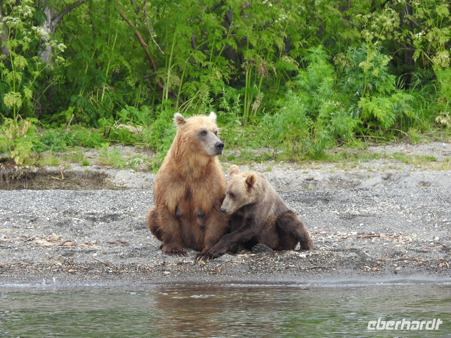 Alternativ dazu konnte bereits im Voraus die Teilnahme an einem ganztägigen Ausflug gebucht werden. Etwa die Hälfte der Gruppe hat dieses Angebot genutzt. Bereits 7.45 Uhr wartet unser Bus vor dem Hotel und bringt uns zum Flughafen. Dies ist nicht der Flughafen, auf dem wir angekommen sind, sondern ein privater Helikopterflughafen. In der modernen Wartehalle bekommen wir jeder ein Band mit der Nummer 279. Dies wird auch die Nummer unseres Hubschraubers sein. Zuerst wird noch eine andere Gruppe abgefertigt, dann werden wir aufgerufen. Jetzt heißt es, schnell sein, wenn man einen Fensterplatz haben möchte. Irgendwann haben sich alle in den Bauch des Hubschraubers und auf die kleinen Bänke gezwängt und unsere russische Reiseleiterin, die heute für uns und die anderen 12 Passagiere zuständig ist, beginnt mit der Belehrung, was man alles nicht darf und unterlassen sollte. Dann bekommen wir alle Ohrenschutz und einen Bonbon und schon hebt der Hubschrauber ab. In einer seltsamen Schräglage starten wir, aber alles ist ok. Wir fliegen über große Waldgebiete, nur ab uns zu tauchen mal ein paar Häuser auf. In den Tälern hängen die Wolken und auf den Berghängen liegen restliche Schneefelder. Nach einer Stunde Flug sehen wir den Kurilensee und an seinen Ufern bereits die ersten Bären. Doch bevor wir sie direkt bewundern können, vergeht noch etwas Zeit. Wir steigen aus und werden von einem Ranger in Empfang genommen. Wir laufen durch ein Camp, das mit Stromleitungen gesichert ist. Nach einem kurzen Spaziergang erreichen wir einen Steg und am Ufer des Flusses, der in den Kurilensee fließt und über den der Steg oder die Brücke führt, tummelt sich eine Bärenfamilie. Auf dem Steg taucht auf einmal ein Bär auf und nach kurzer Zeit hat er sich einen Lachs aus dem Fluss gefischt. Diese Darbietung war bestimmt für uns. Wir laufen zurück zum See und werden in zwei Gruppen aufgeteilt. In unser Boot passen 11 Personen, aber mit den Schwimmwesten am Leib, wird es ganz schön eng. Mit einem Affenzahn braust unser Schiff über den Kurilensee, bald wird uns auch klar, warum. Unsere Guides wissen, wo sich am Ufer die Bären tummeln. Wir haben etwa eine halbe Stunde Zeit zum Schauen, Staunen und Fotografieren.