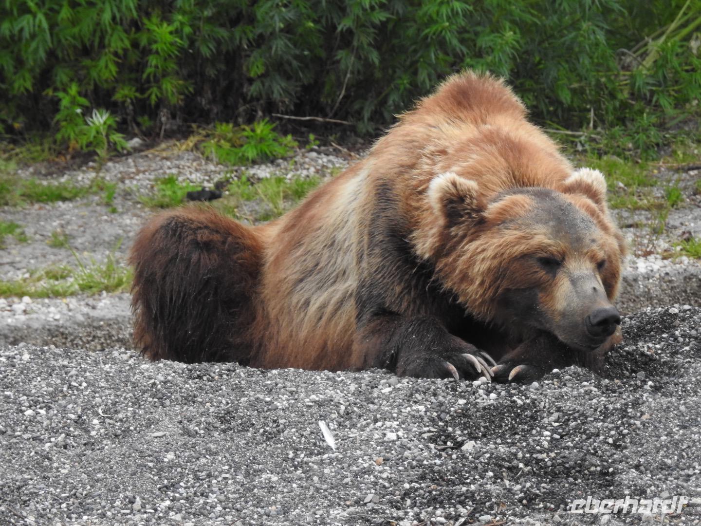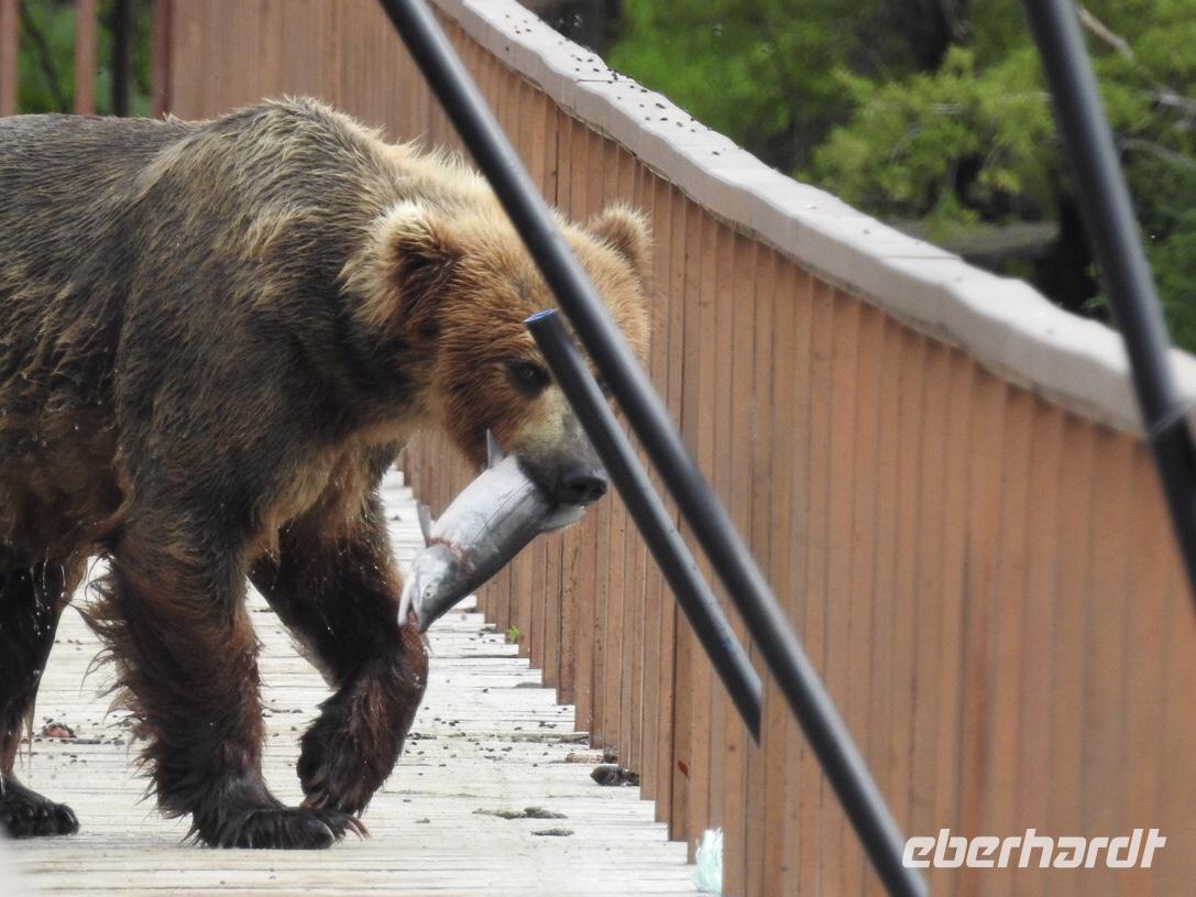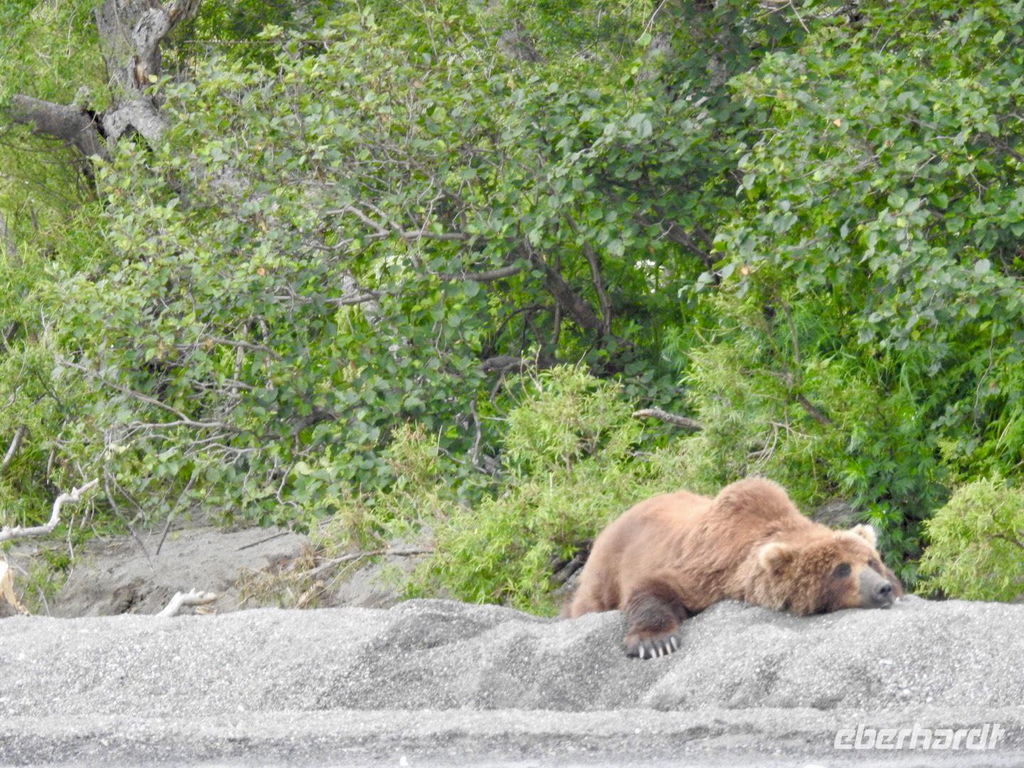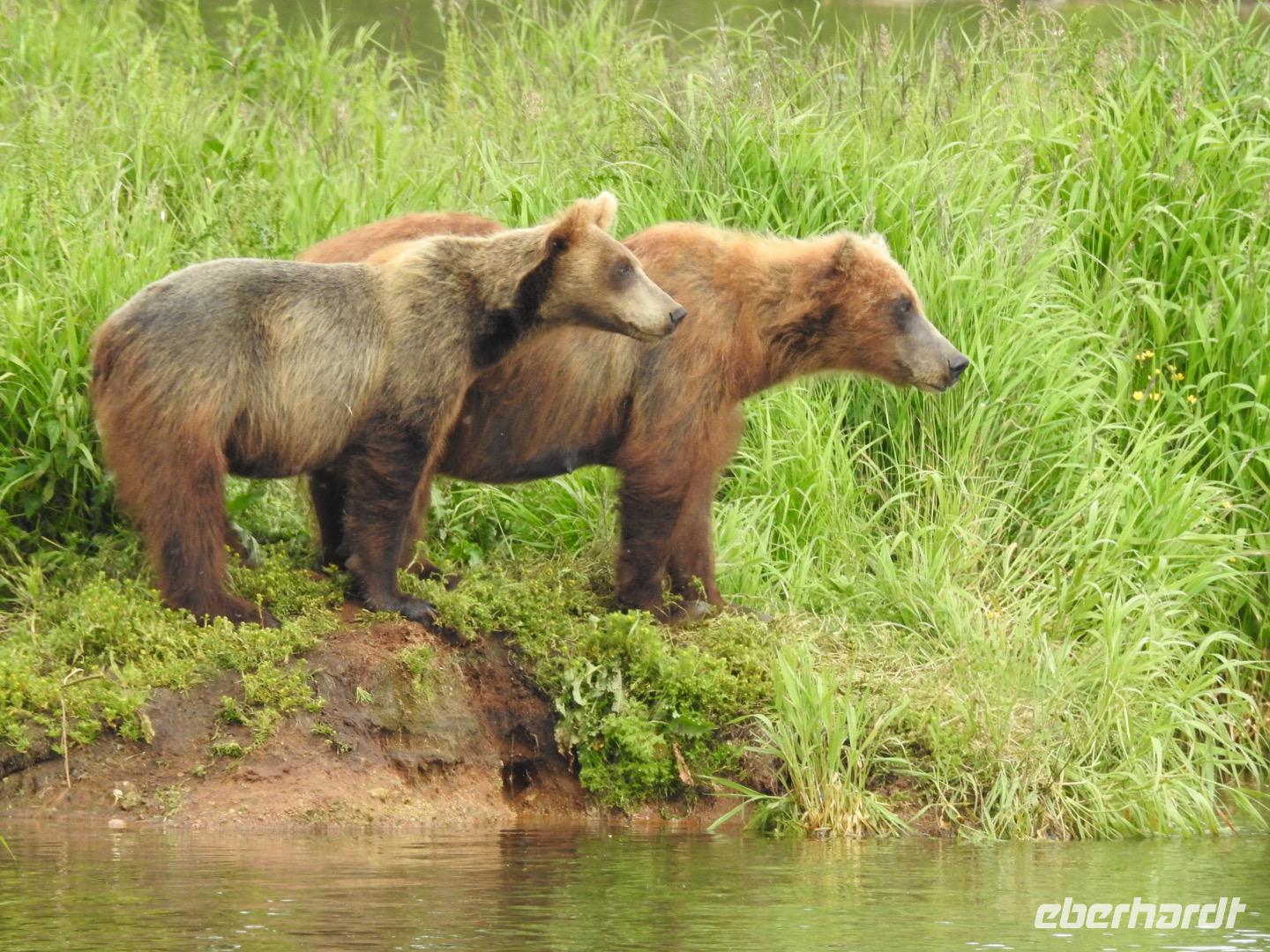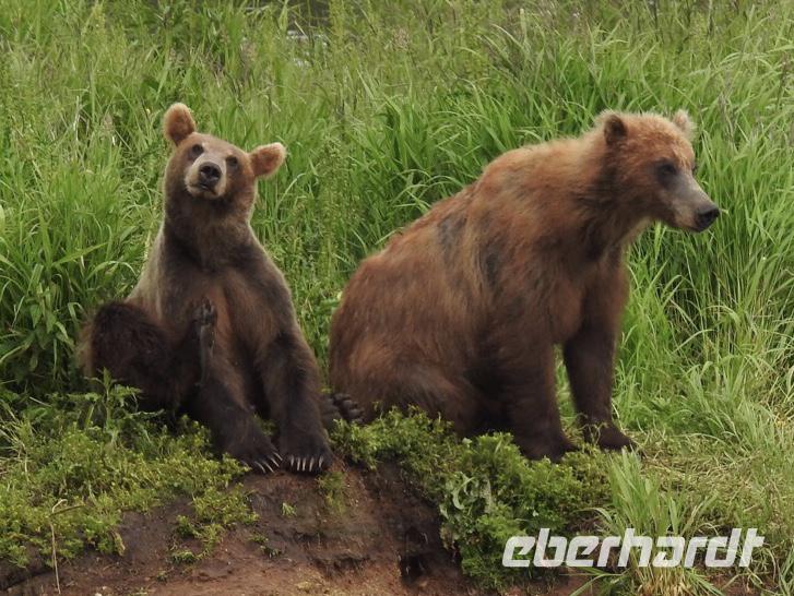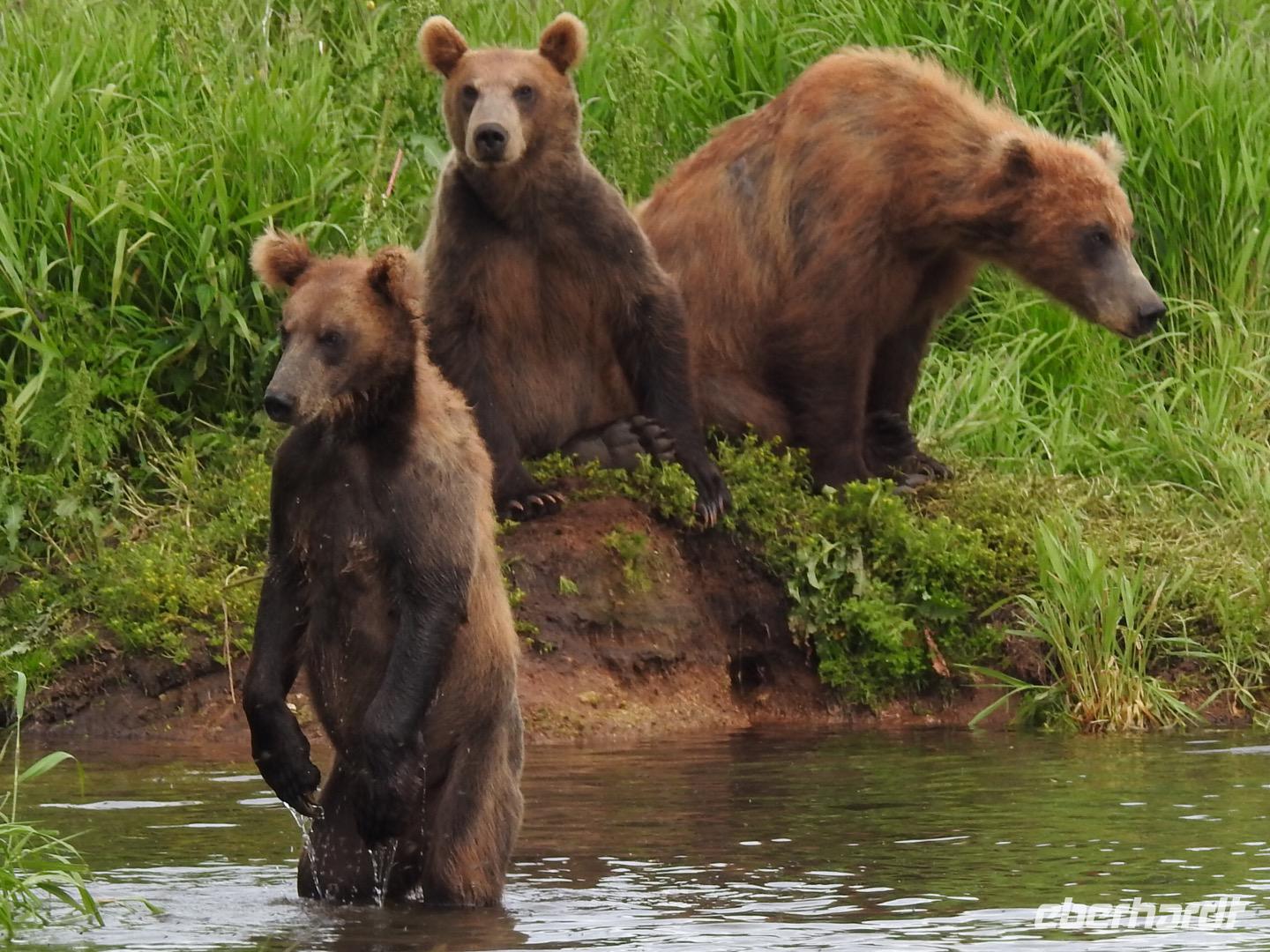 Alternativ dazu konnte bereits im Voraus die Teilnahme an einem ganztägigen Ausflug gebucht werden. Etwa die Hälfte der Gruppe hat dieses Angebot genutzt. Bereits 7.45 Uhr wartet unser Bus vor dem Hotel und bringt uns zum Flughafen. Dies ist nicht der Flughafen, auf dem wir angekommen sind, sondern ein privater Helikopterflughafen. In der modernen Wartehalle bekommen wir jeder ein Band mit der Nummer 279. Dies wird auch die Nummer unseres Hubschraubers sein. Zuerst wird noch eine andere Gruppe abgefertigt, dann werden wir aufgerufen. Jetzt heißt es, schnell sein, wenn man einen Fensterplatz haben möchte. Irgendwann haben sich alle in den Bauch des Hubschraubers und auf die kleinen Bänke gezwängt und unsere russische Reiseleiterin, die heute für uns und die anderen 12 Passagiere zuständig ist, beginnt mit der Belehrung, was man alles nicht darf und unterlassen sollte. Dann bekommen wir alle Ohrenschutz und einen Bonbon und schon hebt der Hubschrauber ab. In einer seltsamen Schräglage starten wir, aber alles ist ok. Wir fliegen über große Waldgebiete, nur ab uns zu tauchen mal ein paar Häuser auf. In den Tälern hängen die Wolken und auf den Berghängen liegen restliche Schneefelder. Nach einer Stunde Flug sehen wir den Kurilensee und an seinen Ufern bereits die ersten Bären. Doch bevor wir sie direkt bewundern können, vergeht noch etwas Zeit. Wir steigen aus und werden von einem Ranger in Empfang genommen. Wir laufen durch ein Camp, das mit Stromleitungen gesichert ist. Nach einem kurzen Spaziergang erreichen wir einen Steg und am Ufer des Flusses, der in den Kurilensee fließt und über den der Steg oder die Brücke führt, tummelt sich eine Bärenfamilie. Auf dem Steg taucht auf einmal ein Bär auf und nach kurzer Zeit hat er sich einen Lachs aus dem Fluss gefischt. Diese Darbietung war bestimmt für uns. Wir laufen zurück zum See und werden in zwei Gruppen aufgeteilt. In unser Boot passen 11 Personen, aber mit den Schwimmwesten am Leib, wird es ganz schön eng. Mit einem Affenzahn braust unser Schiff über den Kurilensee, bald wird uns auch klar, warum. Unsere Guides wissen, wo sich am Ufer die Bären tummeln. Wir haben etwa eine halbe Stunde Zeit zum Schauen, Staunen und Fotografieren.