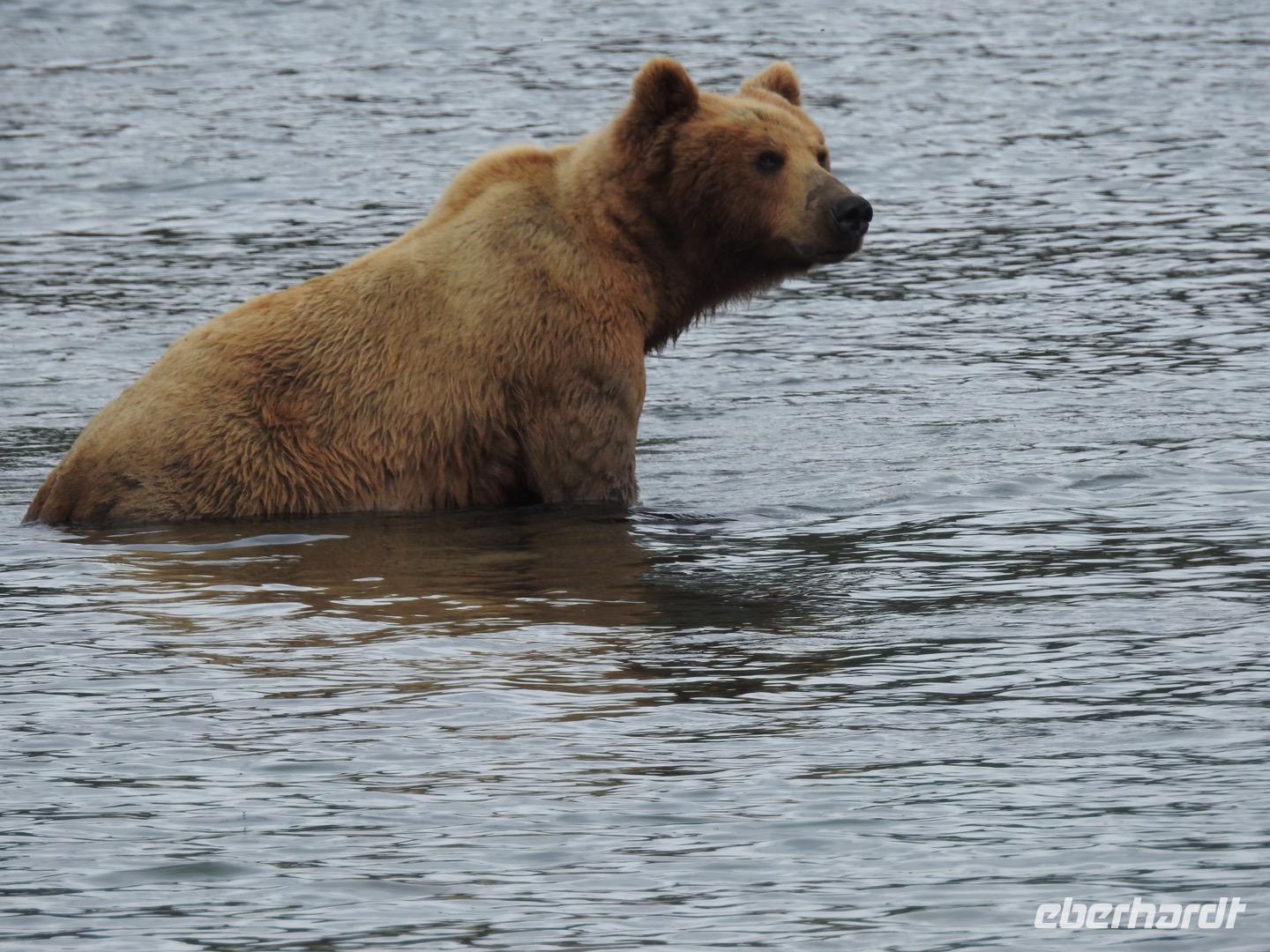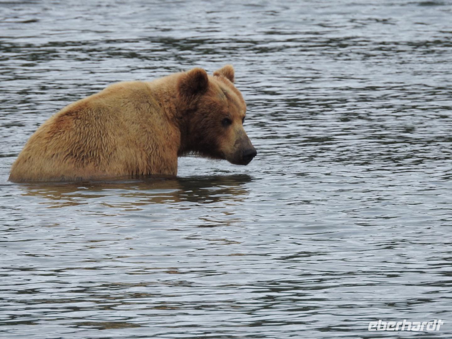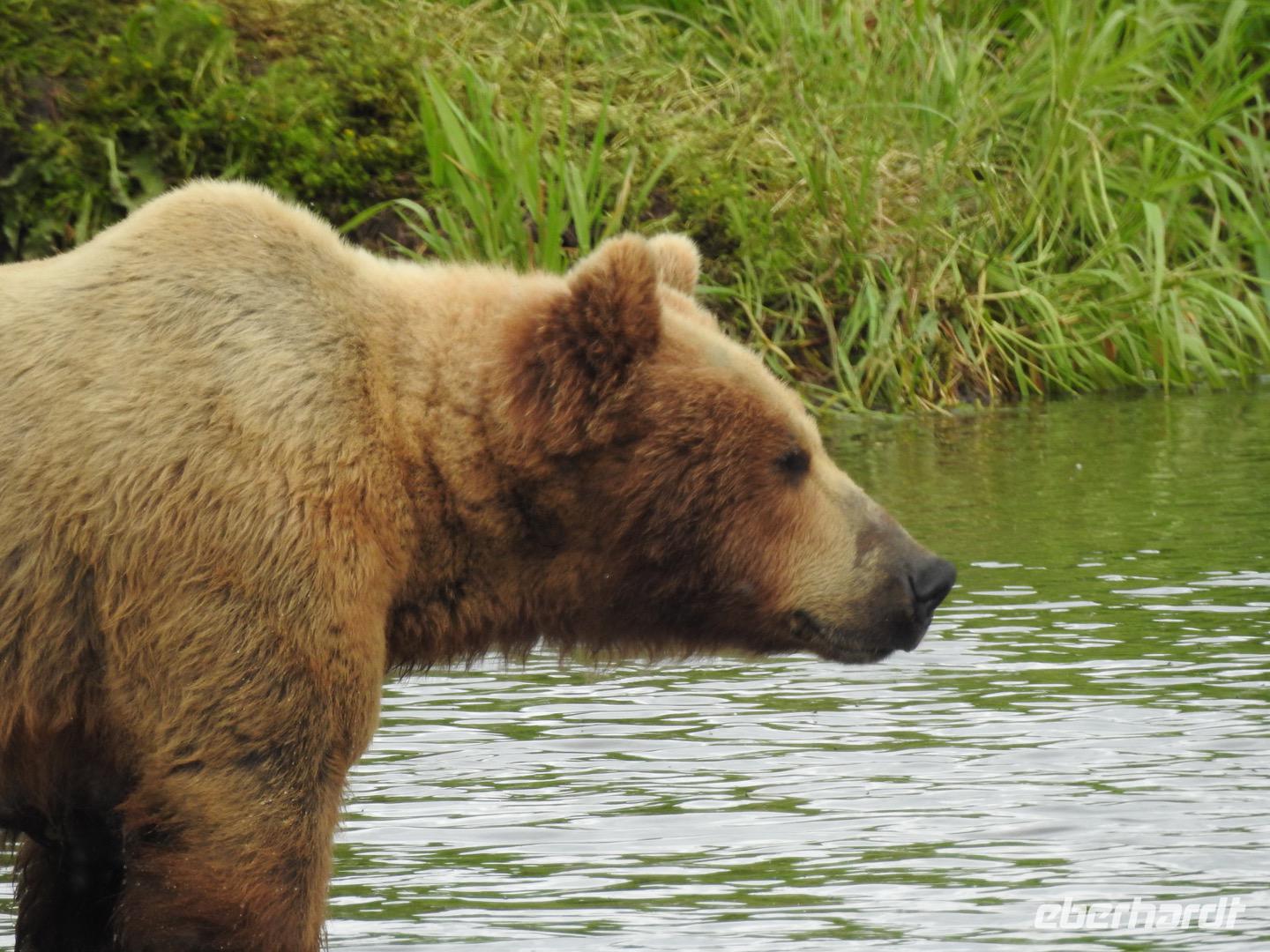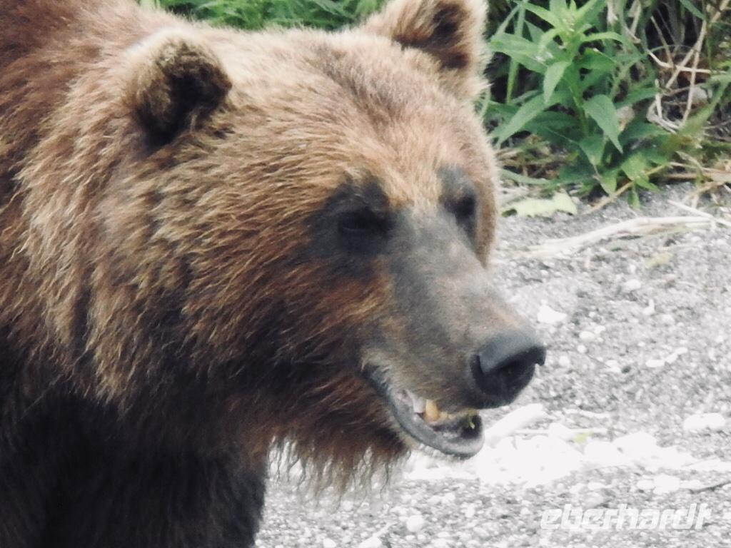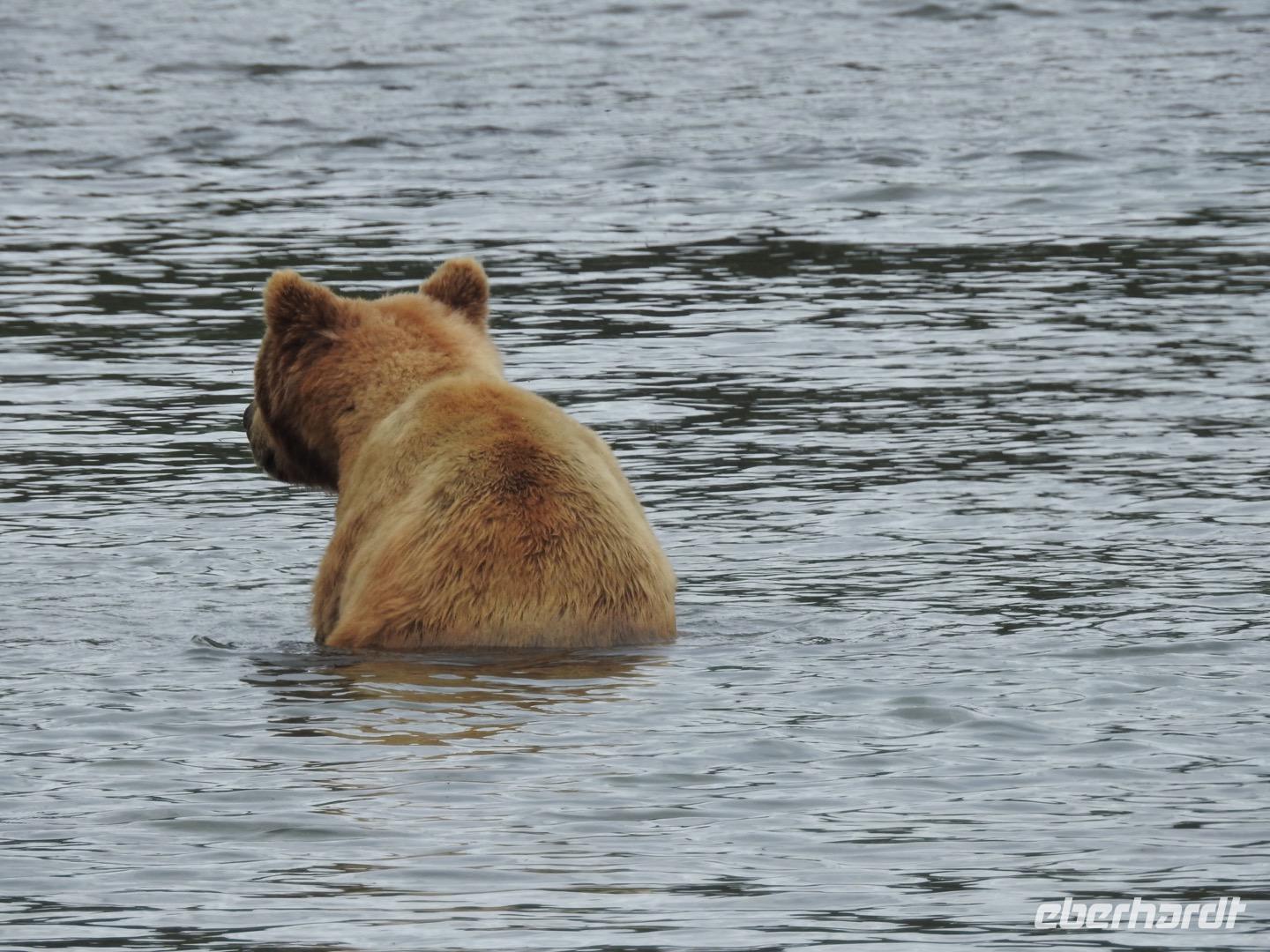 Alternativ dazu konnte bereits im Voraus die Teilnahme an einem ganztägigen Ausflug gebucht werden. Etwa die Hälfte der Gruppe hat dieses Angebot genutzt. Bereits 7.45 Uhr wartet unser Bus vor dem Hotel und bringt uns zum Flughafen. Dies ist nicht der Flughafen, auf dem wir angekommen sind, sondern ein privater Helikopterflughafen. In der modernen Wartehalle bekommen wir jeder ein Band mit der Nummer 279. Dies wird auch die Nummer unseres Hubschraubers sein. Zuerst wird noch eine andere Gruppe abgefertigt, dann werden wir aufgerufen. Jetzt heißt es, schnell sein, wenn man einen Fensterplatz haben möchte. Irgendwann haben sich alle in den Bauch des Hubschraubers und auf die kleinen Bänke gezwängt und unsere russische Reiseleiterin, die heute für uns und die anderen 12 Passagiere zuständig ist, beginnt mit der Belehrung, was man alles nicht darf und unterlassen sollte. Dann bekommen wir alle Ohrenschutz und einen Bonbon und schon hebt der Hubschrauber ab. In einer seltsamen Schräglage starten wir, aber alles ist ok. Wir fliegen über große Waldgebiete, nur ab uns zu tauchen mal ein paar Häuser auf. In den Tälern hängen die Wolken und auf den Berghängen liegen restliche Schneefelder. Nach einer Stunde Flug sehen wir den Kurilensee und an seinen Ufern bereits die ersten Bären. Doch bevor wir sie direkt bewundern können, vergeht noch etwas Zeit. Wir steigen aus und werden von einem Ranger in Empfang genommen. Wir laufen durch ein Camp, das mit Stromleitungen gesichert ist. Nach einem kurzen Spaziergang erreichen wir einen Steg und am Ufer des Flusses, der in den Kurilensee fließt und über den der Steg oder die Brücke führt, tummelt sich eine Bärenfamilie. Auf dem Steg taucht auf einmal ein Bär auf und nach kurzer Zeit hat er sich einen Lachs aus dem Fluss gefischt. Diese Darbietung war bestimmt für uns. Wir laufen zurück zum See und werden in zwei Gruppen aufgeteilt. In unser Boot passen 11 Personen, aber mit den Schwimmwesten am Leib, wird es ganz schön eng. Mit einem Affenzahn braust unser Schiff über den Kurilensee, bald wird uns auch klar, warum. Unsere Guides wissen, wo sich am Ufer die Bären tummeln. Wir haben etwa eine halbe Stunde Zeit zum Schauen, Staunen und Fotografieren.
