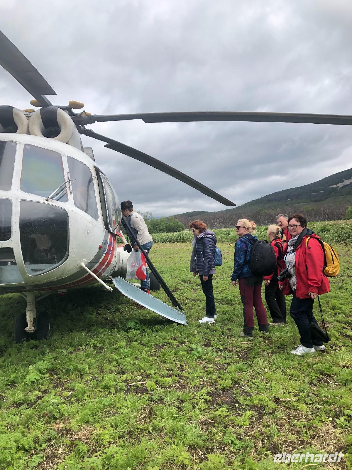 Wir fliegen weiter und landen diesmal am Kraterrand des Ksudach Vulkans. Zwischen den steil herabfallenden Vulkanwänden liegt ein tiefblauer See. Außer uns, befindet sich hier eine weitere Gruppe mit einem anderen Hubschrauber und wir beobachten, wie dieser sich nach Abflug in den Krater stürzt und tief überfliegt. Das macht unser Hubschrauber auch gleich mit uns. Erstaunlicherweise vertragen das alle gut. Den letzten Stopp legen wir an den Thermalquellen Khodutka Hot Springs ein. Ein Bad ist theoretisch möglich, allerdings ist das Wasser sehr heiß, heute ca. 45 Grad, manchmal noch heißer, so dass man nicht hineingehen kann. Wir bekommen ein Lunchpaket und Getränke und nach einer Stunde Pause fliegen wir zurück. Gegen 15 Uhr sind wir wieder im Hotel.
