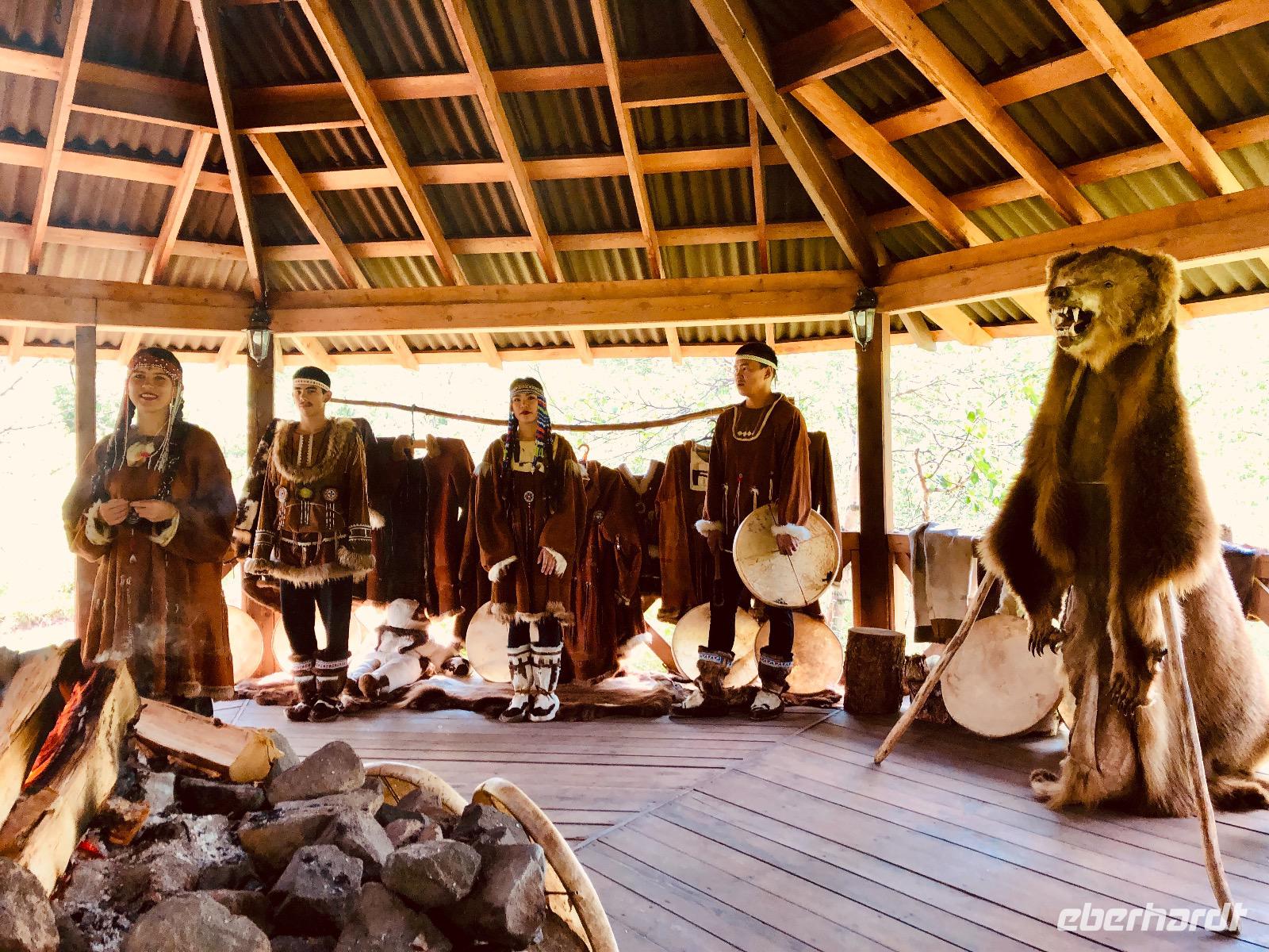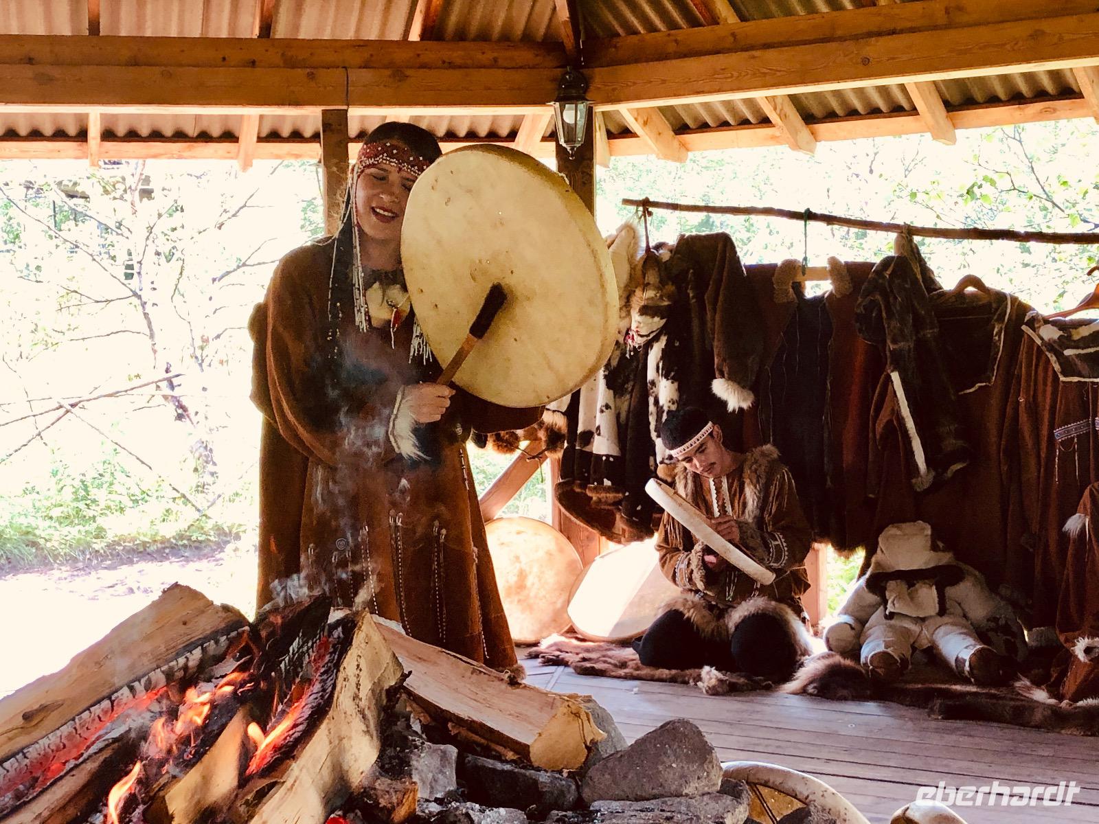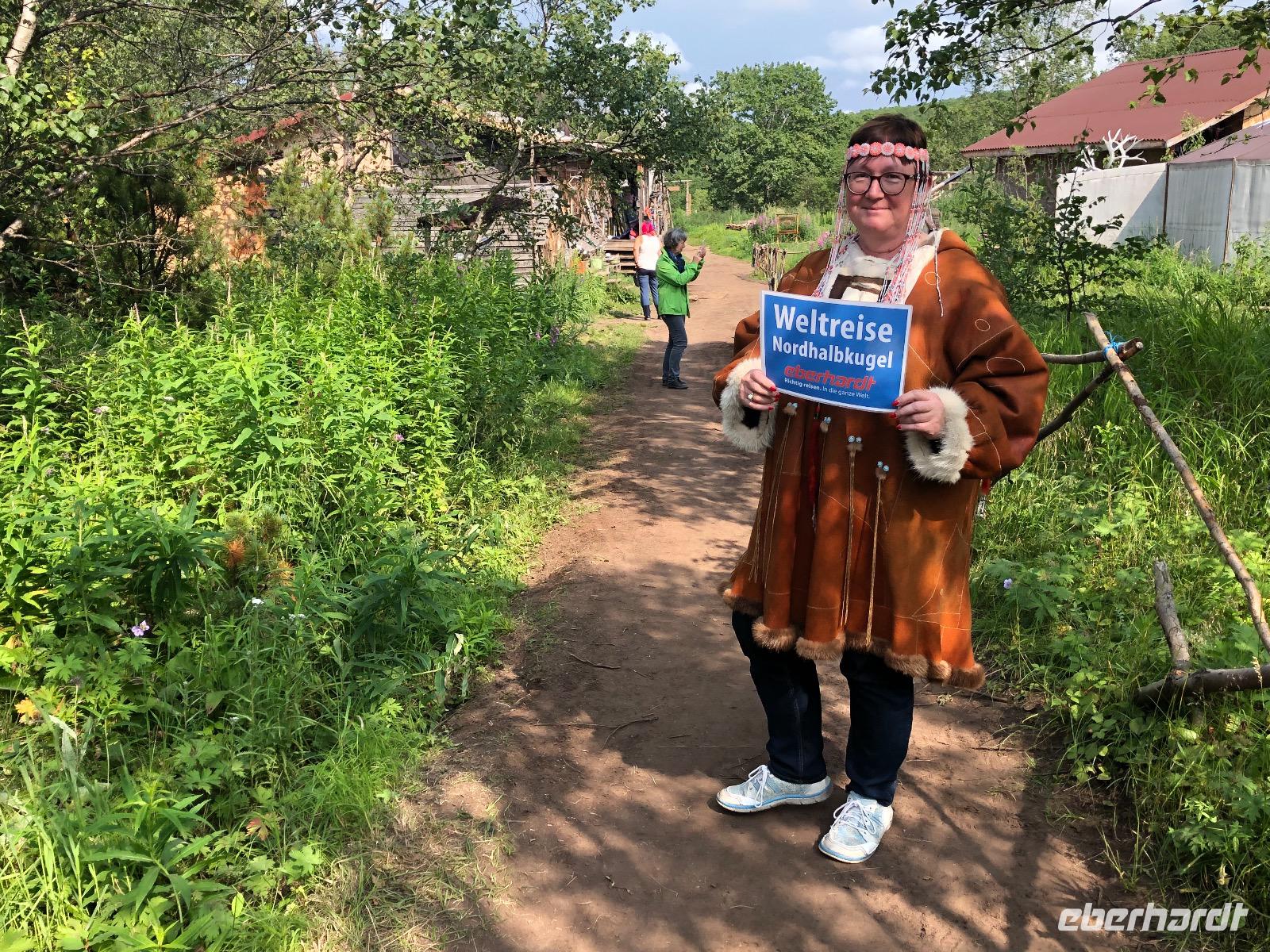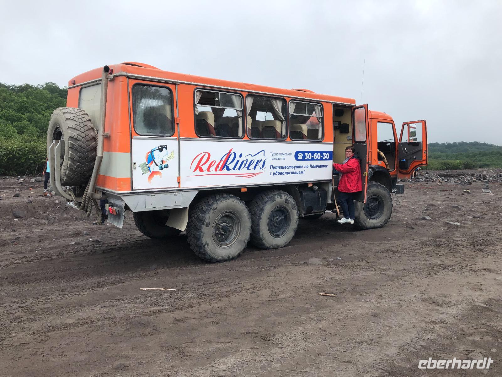 Vor unserem Hotel steht ein 6WD Fahrzeug. Das ist eine Art Monstertruck oder eine Mischung zwischen LKW und Bus mit sechs riesigen Rädern. Wir werden gebeten, einzusteigen. Zusätzlich zu Maria, unserer Reiseleiterin in Kamtschatka, begleiten uns heute eine Köchin und Alexander, der Guide für Wanderungen am Vulkan. Mit lautem Hallo nehmen wir Platz und die Fahrt beginnt. Am Anfang geht es noch über asphaltierte Straßen aber nach circa einer Stunde biegen wir ab auf unwegsames Gelände. Bald darauf wird es noch abenteuerlicher. Wir durchqueren ein ausgetrocknetes Flussbett. Die Wände sind schwarz und Überreste eines Vulkanausbruchs vor vielen Jahren. Wir rumpeln und pumpeln so durch das Flussbett und werden ziemlich durchgeschüttelt. Einige Male müssen wir Abschnitte überqueren, die uns für unseren Bus sehr schmal erscheinen und die am Fenster Sitzenden werden etwas weiß um die Nase. Wir legen einen kurzen Stopp ein an einer Stelle, wo es viele Steinmännchen gibt. Keine Frage, dass wir ebenfalls unser Steinmännchen bauen. Nun ist es nicht mehr weit bis zum Camp. Am Fuße des Vulkans.... unternehmen wir eine Wanderung, naja, es ist eher ein Spaziergang. Eine dicke weiße Wolke folgt uns auf dem Fuße, im wahrsten Sinne des Wortes. Der Berg Kamel, zu dem wir laufen wollen, war eben noch zu sehen, doch nun ist er verschwunden, so wie alle Berge und Vulkane, die sich ringsherum befinden. Wir erfreuen uns an den zahlreichen Zieselmäusen, die sich hier herumtreiben und kaum ängstlich sind. Sie sind es gewohnt, von den Besuchern mit Keksen und Weißbrot gefüttert zu werden. Erstaunlich sind auch all die Blümchen, die in der Vulkanerde wachsen. Unser Guide Alexander ist traurig, hätte er uns doch gern die fantastische Aussicht erklärt. Wir beschließen, umzukehren. Im Camp ist der Tisch schon gedeckt. Gurken und Tomatenscheiben, verschiedene Brotsorten, Kekse und Konfekt sind bereits auf dem Tisch. Heiß gereicht wird dagegen die Suppe, es ist Bortscht, ein russisches Gericht, das wir inzwischen schon kennen. Nach dem Mittagessen steigen wir wieder in unser 6WD Gefährt und setzen unseren Weg fort. Fast scheint es uns, dass der Weg noch unebener ist als auf der Hinfahrt. Am Nachmittag besuchen wir eine Familie, die sich mit der Aufzucht von Schlittenhunden beschäftigt. Zuerst aber werden wir in traditionellen Kleidern und mit Musik begrüßt. Man bittet uns in eine Hütte, in der in der Mitte ein Feuer lodert. Auf Rentierfellen nehmen wir Platz und lauschen dem Gesang der jungen Männer und Frauen. Sie stellen sich als Ureinwohner vor und berichten von ihrem Leben, stellen ihre Kleidung und ihre Musikinstrumente vor. Die Kleidung besteht aus Rentierfell. Warum? Weil es vor Kälte und Nässe schützt. Es gibt Kleidung für den Alltag und schön geschmückte für festliche Anlässe. Sie zeigen uns ihre schönen Mützen und Stiefel und ein Werkzeug, mit dem die Rentierfelle gegerbt werden. Dann wird wieder gesungen und getanzt. Einige Tanzschritte stellen die einheimischen Tiere dar und wir sollen erraten, um welche es sich handelt. Unter uns sind doch einige Experten, die gut im Raten sind. Nun bekommen wir alle eine Trommel in die Hand gedrückt und unter Anleitung erschallt eine fröhliches Getrommel. Nach weiteren Tänzen und Liedern, werden wir mit den traditionellen Gewändern bekleidet und dürfen uns damit nach Herzenslust Fotografieren. Im Anschluss daran geht es endlich zu den Schlittenhunden, für einige Gäste einer der am meisten erwarteten Programmpunkte. In bzw. vor vierundzwanzig Hundehütten haben es sich die Burschen bequem gemacht. Alle suchen den Schatten und dösen vor sich hin. Wir erfahren viel über die Arbeit mit den Hunden. Viele Fragen werden gestellt, das Interesse ist groß. Als wir dabei sind, die Schlitten zu betrachten, fängt auf einmal ein Hund an zu jaulen und die anderen stimmen mit ein, es wird ein richtiges Konzert. Wir erfahren, das dies die Art der Hunde ist, nachzufragen, ob es bitte zum Training geht. Diese Show wiederholt sich, als es darum geht, dass sechs Hunde mit unseren Gästen eine Ausfahrt machen dürfen. Alle Hunde wollen sofort los und als die sechs ausgewählten eingespannt sind, erfolgt ein gemeinsames enttäuschtes Heulen. Wir werden noch zum Abendessen eingeladen, neben einer Gemüsesuppe, deren Fleischeinlage wohl etwas zu kurz im Kochwasser lag, gibt es ein traditionelles Brot mit Beeren in Vanillesoße.
