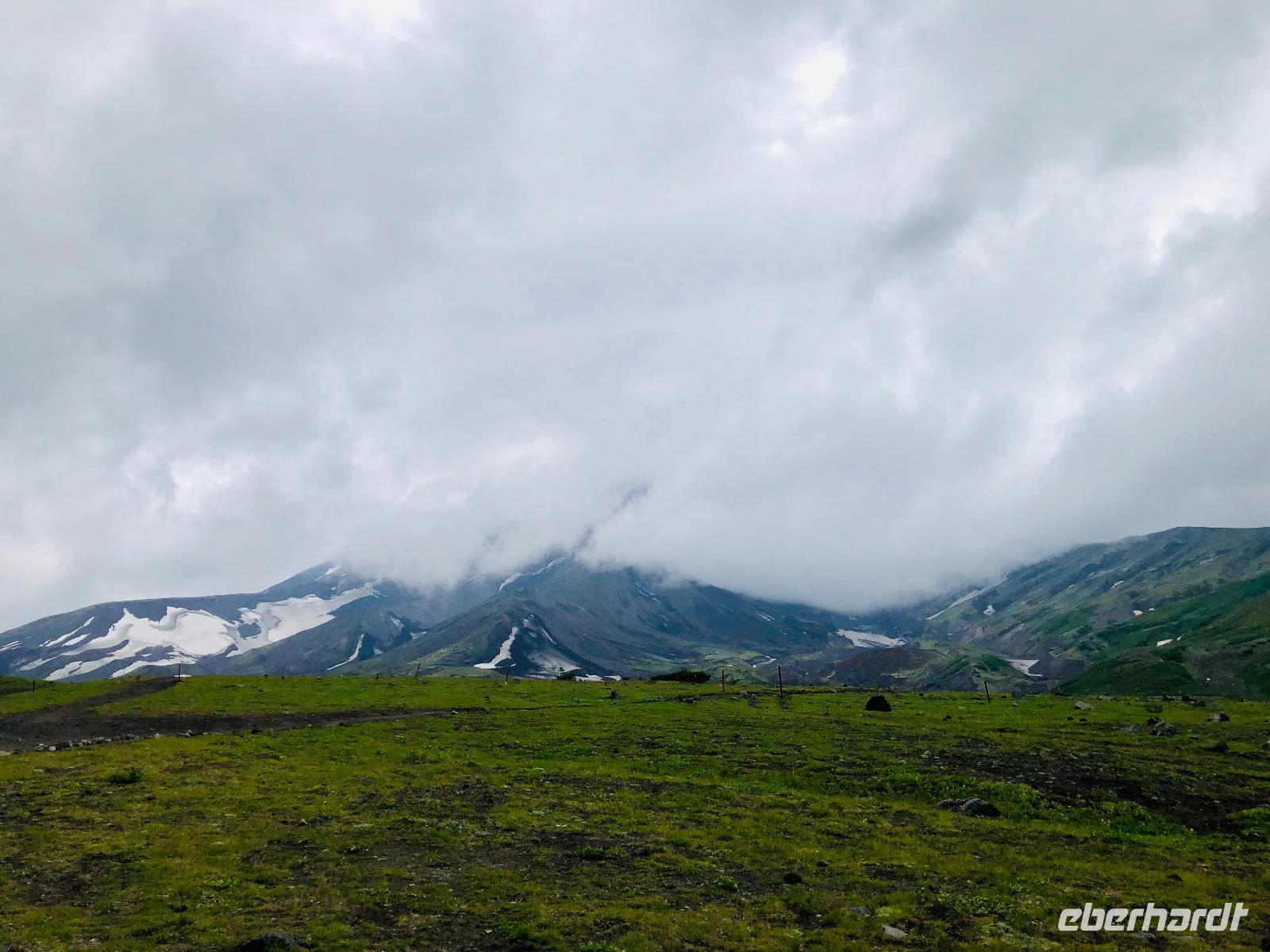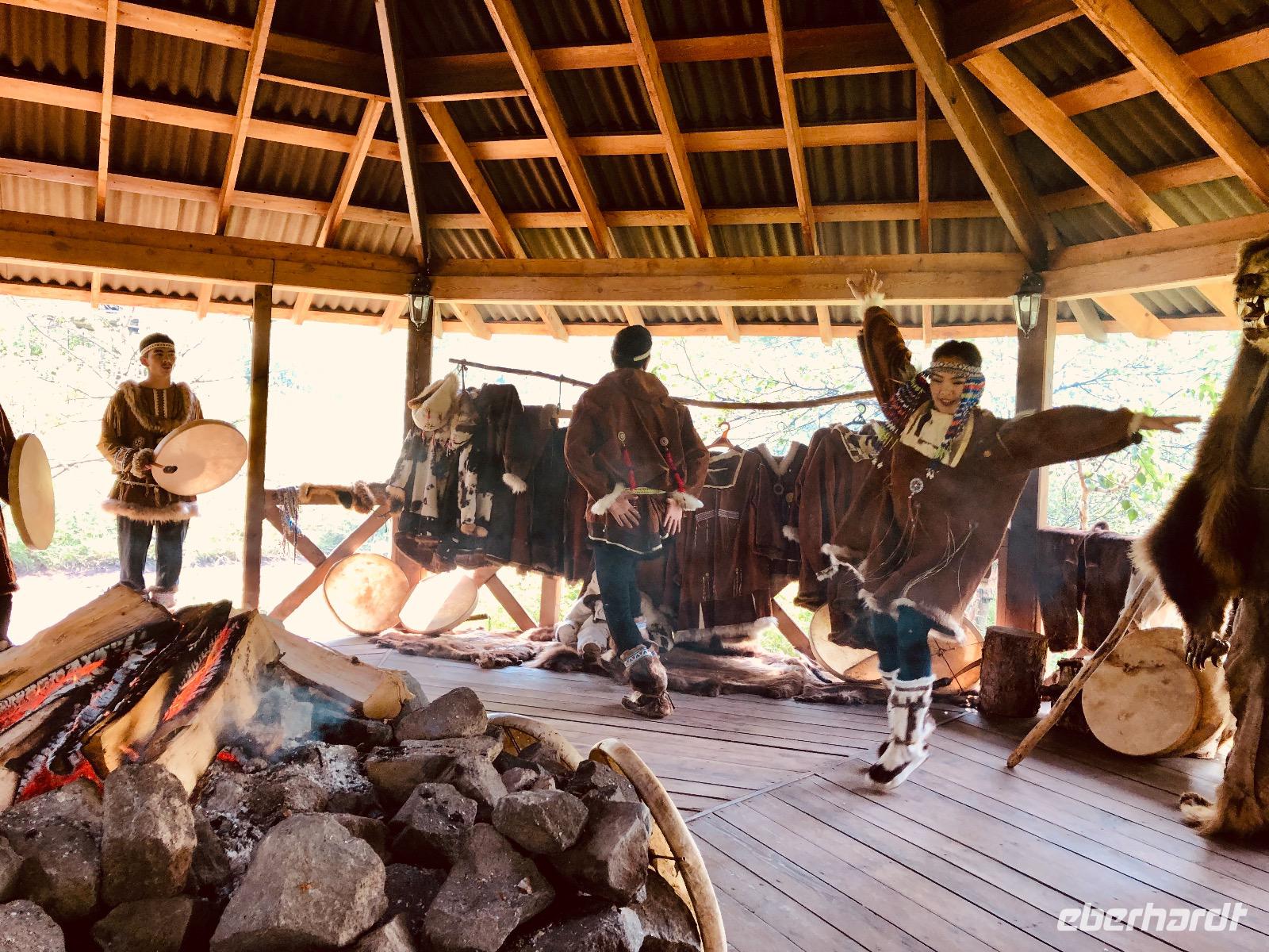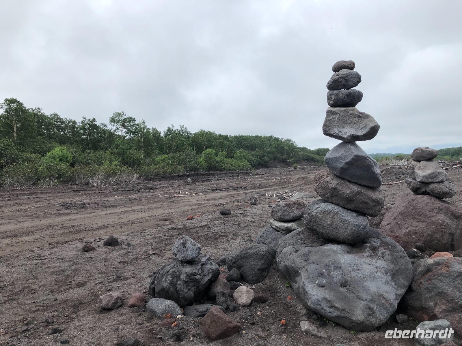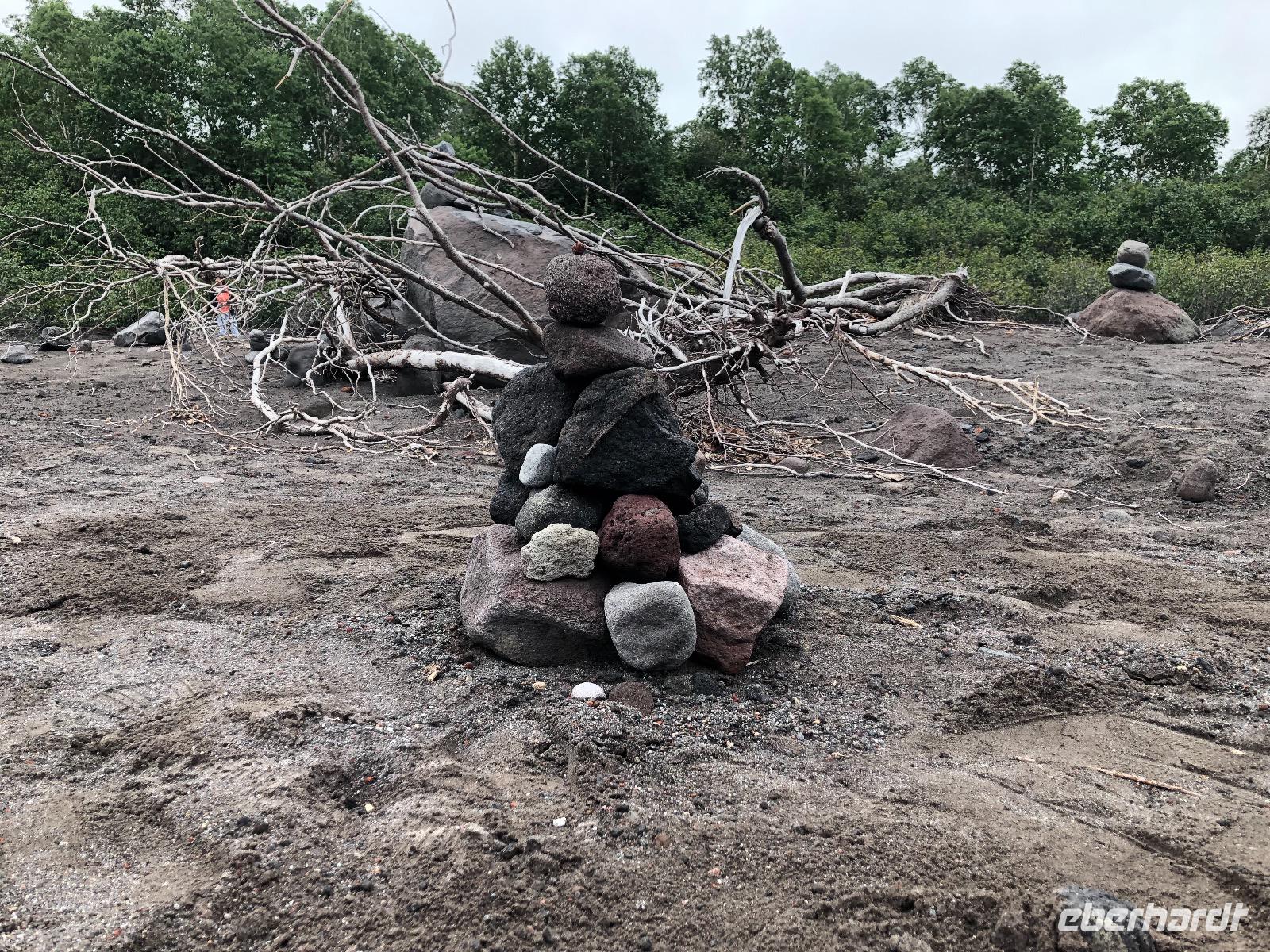 Vor unserem Hotel steht ein 6WD Fahrzeug. Das ist eine Art Monstertruck oder eine Mischung zwischen LKW und Bus mit sechs riesigen Rädern. Wir werden gebeten, einzusteigen. Zusätzlich zu Maria, unserer Reiseleiterin in Kamtschatka, begleiten uns heute eine Köchin und Alexander, der Guide für Wanderungen am Vulkan. Mit lautem Hallo nehmen wir Platz und die Fahrt beginnt. Am Anfang geht es noch über asphaltierte Straßen aber nach circa einer Stunde biegen wir ab auf unwegsames Gelände. Bald darauf wird es noch abenteuerlicher. Wir durchqueren ein ausgetrocknetes Flussbett. Die Wände sind schwarz und Überreste eines Vulkanausbruchs vor vielen Jahren. Wir rumpeln und pumpeln so durch das Flussbett und werden ziemlich durchgeschüttelt. Einige Male müssen wir Abschnitte überqueren, die uns für unseren Bus sehr schmal erscheinen und die am Fenster Sitzenden werden etwas weiß um die Nase. Wir legen einen kurzen Stopp ein an einer Stelle, wo es viele Steinmännchen gibt. Keine Frage, dass wir ebenfalls unser Steinmännchen bauen. Nun ist es nicht mehr weit bis zum Camp. Am Fuße des Vulkans.... unternehmen wir eine Wanderung, naja, es ist eher ein Spaziergang. Eine dicke weiße Wolke folgt uns auf dem Fuße, im wahrsten Sinne des Wortes. Der Berg Kamel, zu dem wir laufen wollen, war eben noch zu sehen, doch nun ist er verschwunden, so wie alle Berge und Vulkane, die sich ringsherum befinden. Wir erfreuen uns an den zahlreichen Zieselmäusen, die sich hier herumtreiben und kaum ängstlich sind. Sie sind es gewohnt, von den Besuchern mit Keksen und Weißbrot gefüttert zu werden. Erstaunlich sind auch all die Blümchen, die in der Vulkanerde wachsen. Unser Guide Alexander ist traurig, hätte er uns doch gern die fantastische Aussicht erklärt. Wir beschließen, umzukehren. Im Camp ist der Tisch schon gedeckt. Gurken und Tomatenscheiben, verschiedene Brotsorten, Kekse und Konfekt sind bereits auf dem Tisch. Heiß gereicht wird dagegen die Suppe, es ist Bortscht, ein russisches Gericht, das wir inzwischen schon kennen. Nach dem Mittagessen steigen wir wieder in unser 6WD Gefährt und setzen unseren Weg fort. Fast scheint es uns, dass der Weg noch unebener ist als auf der Hinfahrt. Am Nachmittag besuchen wir eine Familie, die sich mit der Aufzucht von Schlittenhunden beschäftigt. Zuerst aber werden wir in traditionellen Kleidern und mit Musik begrüßt. Man bittet uns in eine Hütte, in der in der Mitte ein Feuer lodert. Auf Rentierfellen nehmen wir Platz und lauschen dem Gesang der jungen Männer und Frauen. Sie stellen sich als Ureinwohner vor und berichten von ihrem Leben, stellen ihre Kleidung und ihre Musikinstrumente vor. Die Kleidung besteht aus Rentierfell. Warum? Weil es vor Kälte und Nässe schützt. Es gibt Kleidung für den Alltag und schön geschmückte für festliche Anlässe. Sie zeigen uns ihre schönen Mützen und Stiefel und ein Werkzeug, mit dem die Rentierfelle gegerbt werden. Dann wird wieder gesungen und getanzt. Einige Tanzschritte stellen die einheimischen Tiere dar und wir sollen erraten, um welche es sich handelt. Unter uns sind doch einige Experten, die gut im Raten sind. Nun bekommen wir alle eine Trommel in die Hand gedrückt und unter Anleitung erschallt eine fröhliches Getrommel. Nach weiteren Tänzen und Liedern, werden wir mit den traditionellen Gewändern bekleidet und dürfen uns damit nach Herzenslust Fotografieren. Im Anschluss daran geht es endlich zu den Schlittenhunden, für einige Gäste einer der am meisten erwarteten Programmpunkte. In bzw. vor vierundzwanzig Hundehütten haben es sich die Burschen bequem gemacht. Alle suchen den Schatten und dösen vor sich hin. Wir erfahren viel über die Arbeit mit den Hunden. Viele Fragen werden gestellt, das Interesse ist groß. Als wir dabei sind, die Schlitten zu betrachten, fängt auf einmal ein Hund an zu jaulen und die anderen stimmen mit ein, es wird ein richtiges Konzert. Wir erfahren, das dies die Art der Hunde ist, nachzufragen, ob es bitte zum Training geht. Diese Show wiederholt sich, als es darum geht, dass sechs Hunde mit unseren Gästen eine Ausfahrt machen dürfen. Alle Hunde wollen sofort los und als die sechs ausgewählten eingespannt sind, erfolgt ein gemeinsames enttäuschtes Heulen. Wir werden noch zum Abendessen eingeladen, neben einer Gemüsesuppe, deren Fleischeinlage wohl etwas zu kurz im Kochwasser lag, gibt es ein traditionelles Brot mit Beeren in Vanillesoße.