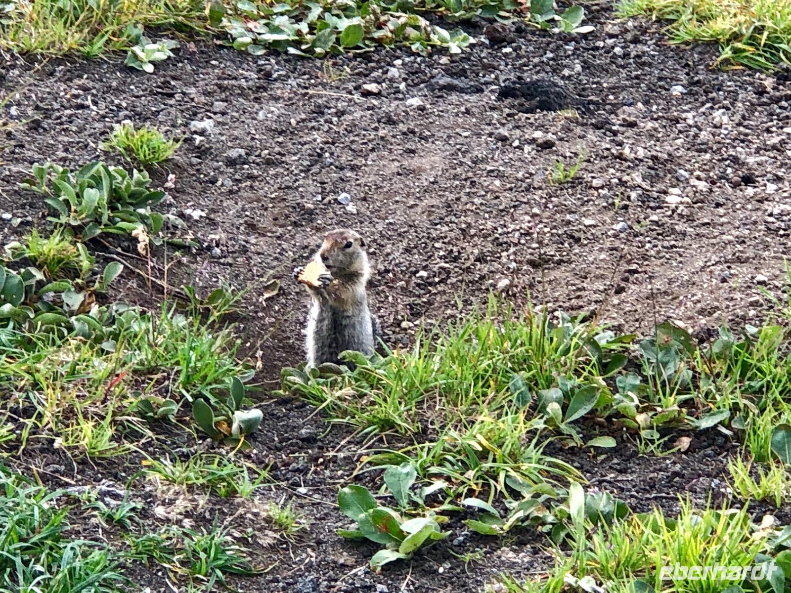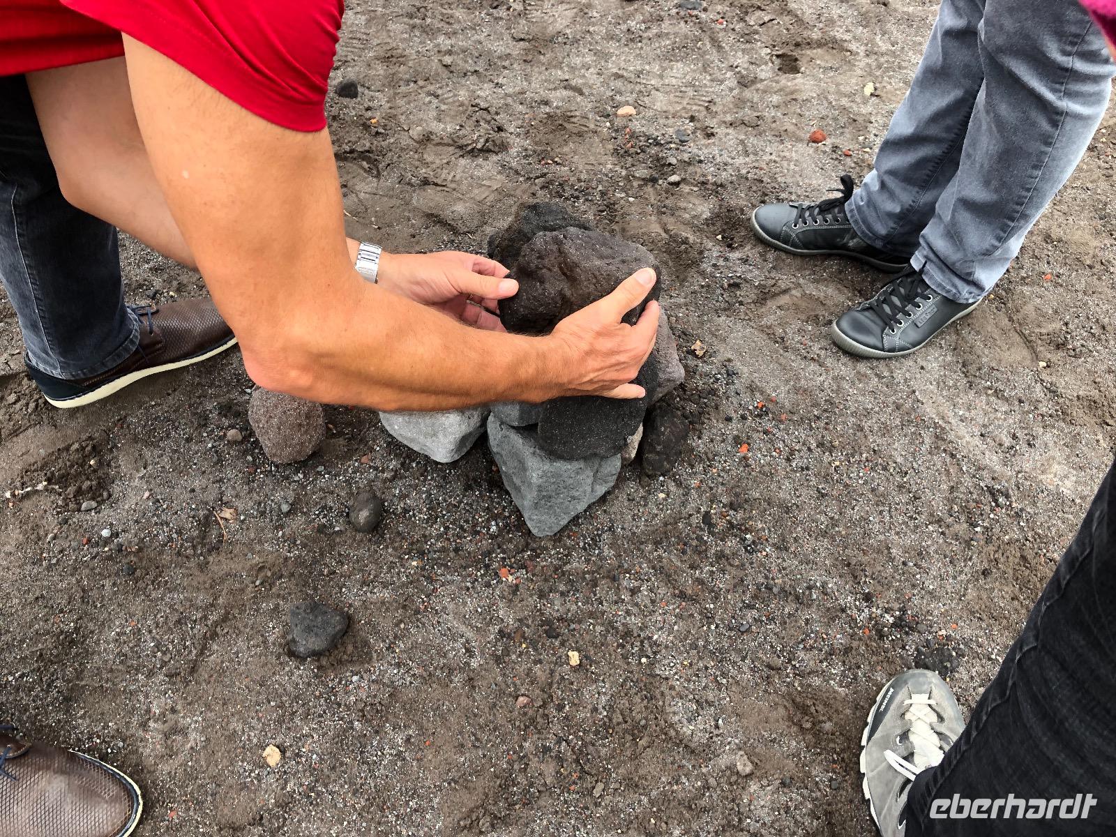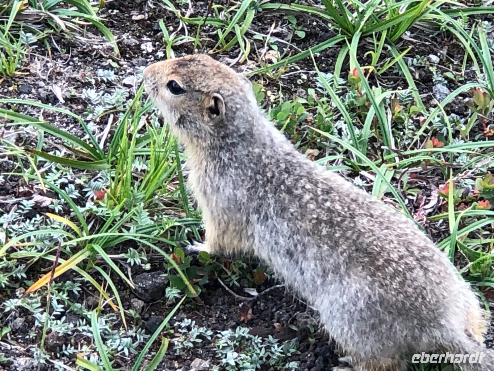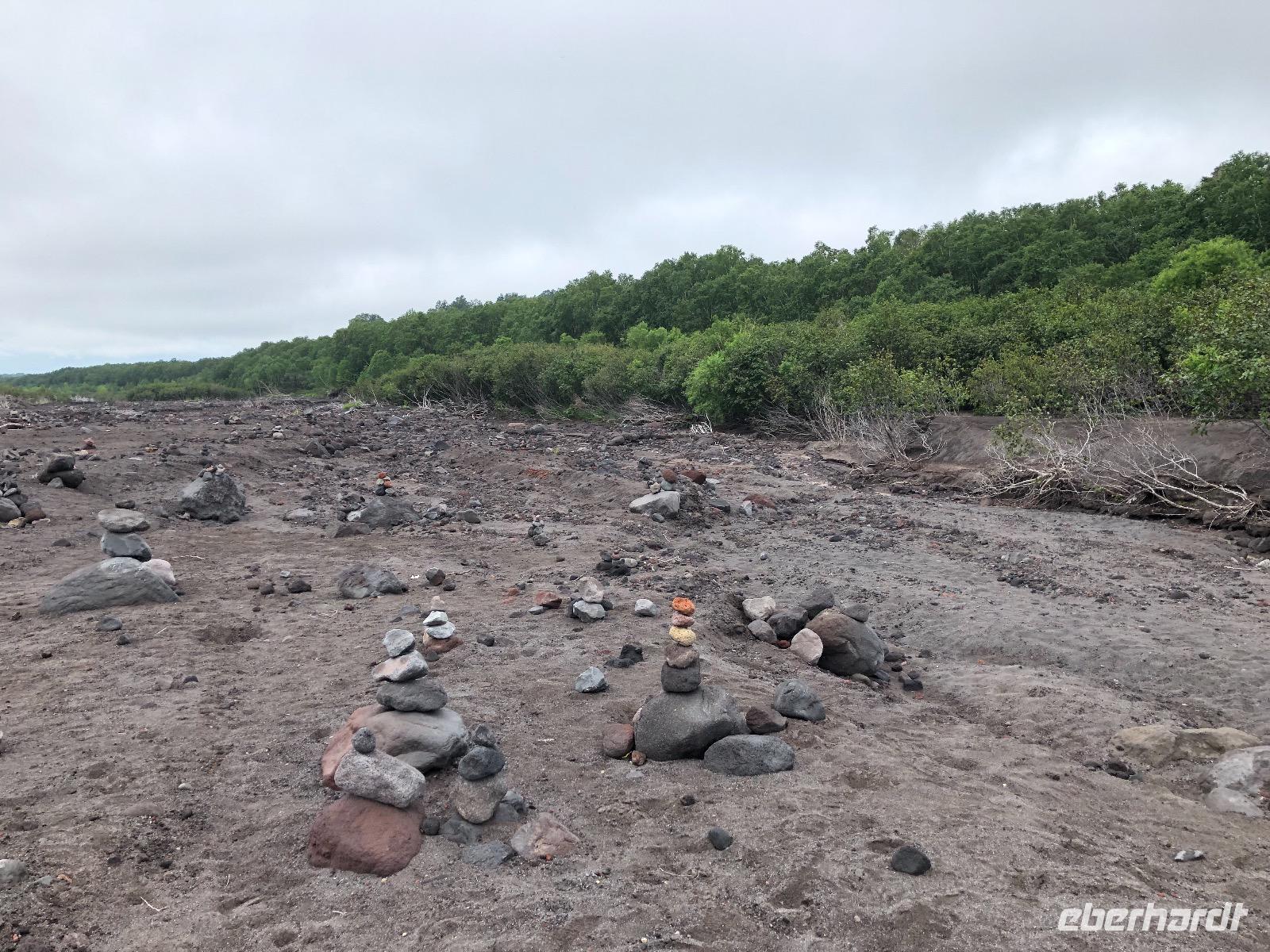 Vor unserem Hotel steht ein 6WD Fahrzeug. Das ist eine Art Monstertruck oder eine Mischung zwischen LKW und Bus mit sechs riesigen Rädern. Wir werden gebeten, einzusteigen. Zusätzlich zu Maria, unserer Reiseleiterin in Kamtschatka, begleiten uns heute eine Köchin und Alexander, der Guide für Wanderungen am Vulkan. Mit lautem Hallo nehmen wir Platz und die Fahrt beginnt. Am Anfang geht es noch über asphaltierte Straßen aber nach circa einer Stunde biegen wir ab auf unwegsames Gelände. Bald darauf wird es noch abenteuerlicher. Wir durchqueren ein ausgetrocknetes Flussbett. Die Wände sind schwarz und Überreste eines Vulkanausbruchs vor vielen Jahren. Wir rumpeln und pumpeln so durch das Flussbett und werden ziemlich durchgeschüttelt. Einige Male müssen wir Abschnitte überqueren, die uns für unseren Bus sehr schmal erscheinen und die am Fenster Sitzenden werden etwas weiß um die Nase. Wir legen einen kurzen Stopp ein an einer Stelle, wo es viele Steinmännchen gibt. Keine Frage, dass wir ebenfalls unser Steinmännchen bauen. Nun ist es nicht mehr weit bis zum Camp. Am Fuße des Vulkans.... unternehmen wir eine Wanderung, naja, es ist eher ein Spaziergang. Eine dicke weiße Wolke folgt uns auf dem Fuße, im wahrsten Sinne des Wortes. Der Berg Kamel, zu dem wir laufen wollen, war eben noch zu sehen, doch nun ist er verschwunden, so wie alle Berge und Vulkane, die sich ringsherum befinden. Wir erfreuen uns an den zahlreichen Zieselmäusen, die sich hier herumtreiben und kaum ängstlich sind. Sie sind es gewohnt, von den Besuchern mit Keksen und Weißbrot gefüttert zu werden. Erstaunlich sind auch all die Blümchen, die in der Vulkanerde wachsen. Unser Guide Alexander ist traurig, hätte er uns doch gern die fantastische Aussicht erklärt. Wir beschließen, umzukehren. Im Camp ist der Tisch schon gedeckt. Gurken und Tomatenscheiben, verschiedene Brotsorten, Kekse und Konfekt sind bereits auf dem Tisch. Heiß gereicht wird dagegen die Suppe, es ist Bortscht, ein russisches Gericht, das wir inzwischen schon kennen. Nach dem Mittagessen steigen wir wieder in unser 6WD Gefährt und setzen unseren Weg fort. Fast scheint es uns, dass der Weg noch unebener ist als auf der Hinfahrt. Am Nachmittag besuchen wir eine Familie, die sich mit der Aufzucht von Schlittenhunden beschäftigt. Zuerst aber werden wir in traditionellen Kleidern und mit Musik begrüßt. Man bittet uns in eine Hütte, in der in der Mitte ein Feuer lodert. Auf Rentierfellen nehmen wir Platz und lauschen dem Gesang der jungen Männer und Frauen. Sie stellen sich als Ureinwohner vor und berichten von ihrem Leben, stellen ihre Kleidung und ihre Musikinstrumente vor. Die Kleidung besteht aus Rentierfell. Warum? Weil es vor Kälte und Nässe schützt. Es gibt Kleidung für den Alltag und schön geschmückte für festliche Anlässe. Sie zeigen uns ihre schönen Mützen und Stiefel und ein Werkzeug, mit dem die Rentierfelle gegerbt werden. Dann wird wieder gesungen und getanzt. Einige Tanzschritte stellen die einheimischen Tiere dar und wir sollen erraten, um welche es sich handelt. Unter uns sind doch einige Experten, die gut im Raten sind. Nun bekommen wir alle eine Trommel in die Hand gedrückt und unter Anleitung erschallt eine fröhliches Getrommel. Nach weiteren Tänzen und Liedern, werden wir mit den traditionellen Gewändern bekleidet und dürfen uns damit nach Herzenslust Fotografieren. Im Anschluss daran geht es endlich zu den Schlittenhunden, für einige Gäste einer der am meisten erwarteten Programmpunkte. In bzw. vor vierundzwanzig Hundehütten haben es sich die Burschen bequem gemacht. Alle suchen den Schatten und dösen vor sich hin. Wir erfahren viel über die Arbeit mit den Hunden. Viele Fragen werden gestellt, das Interesse ist groß. Als wir dabei sind, die Schlitten zu betrachten, fängt auf einmal ein Hund an zu jaulen und die anderen stimmen mit ein, es wird ein richtiges Konzert. Wir erfahren, das dies die Art der Hunde ist, nachzufragen, ob es bitte zum Training geht. Diese Show wiederholt sich, als es darum geht, dass sechs Hunde mit unseren Gästen eine Ausfahrt machen dürfen. Alle Hunde wollen sofort los und als die sechs ausgewählten eingespannt sind, erfolgt ein gemeinsames enttäuschtes Heulen. Wir werden noch zum Abendessen eingeladen, neben einer Gemüsesuppe, deren Fleischeinlage wohl etwas zu kurz im Kochwasser lag, gibt es ein traditionelles Brot mit Beeren in Vanillesoße.
