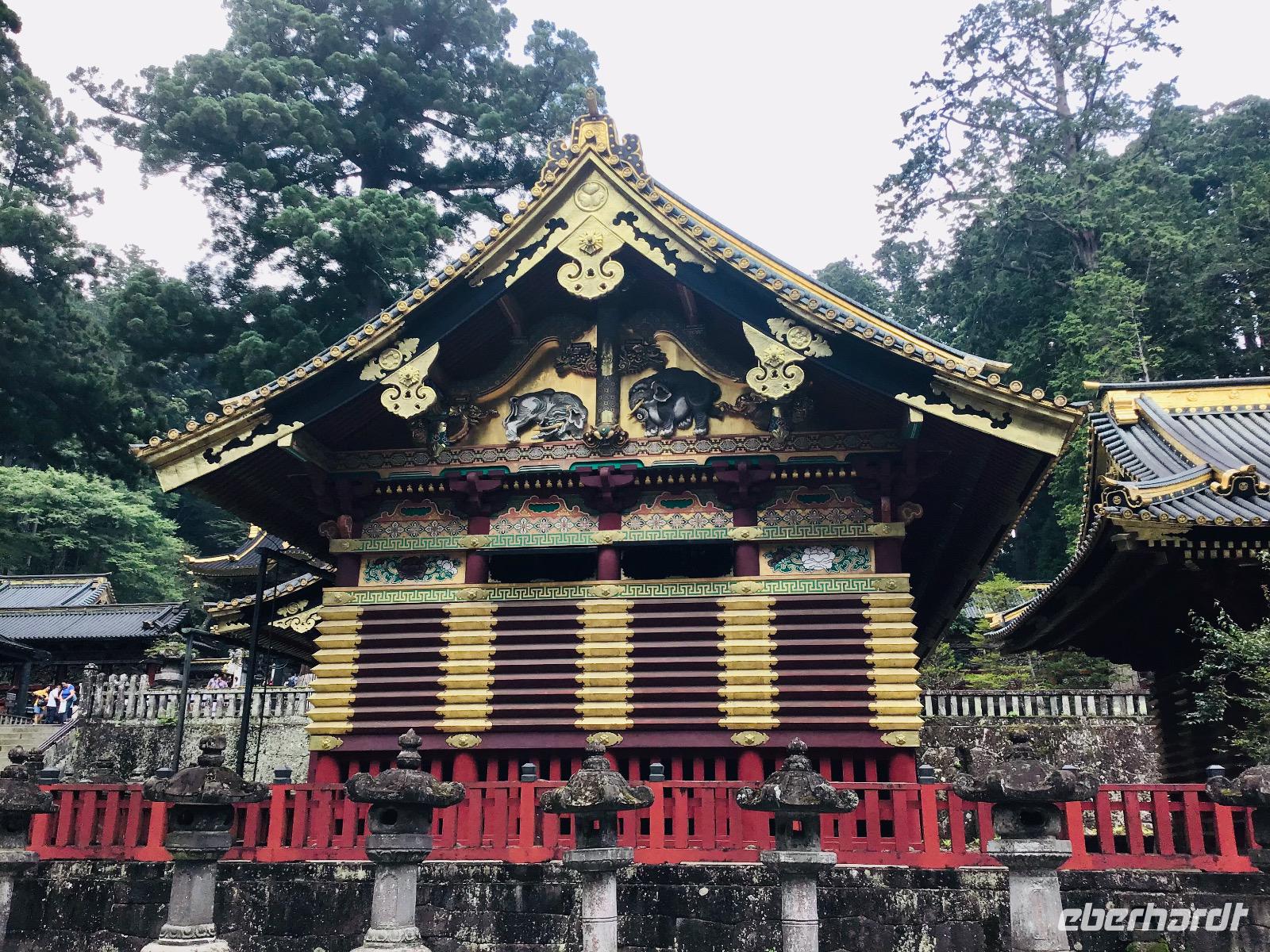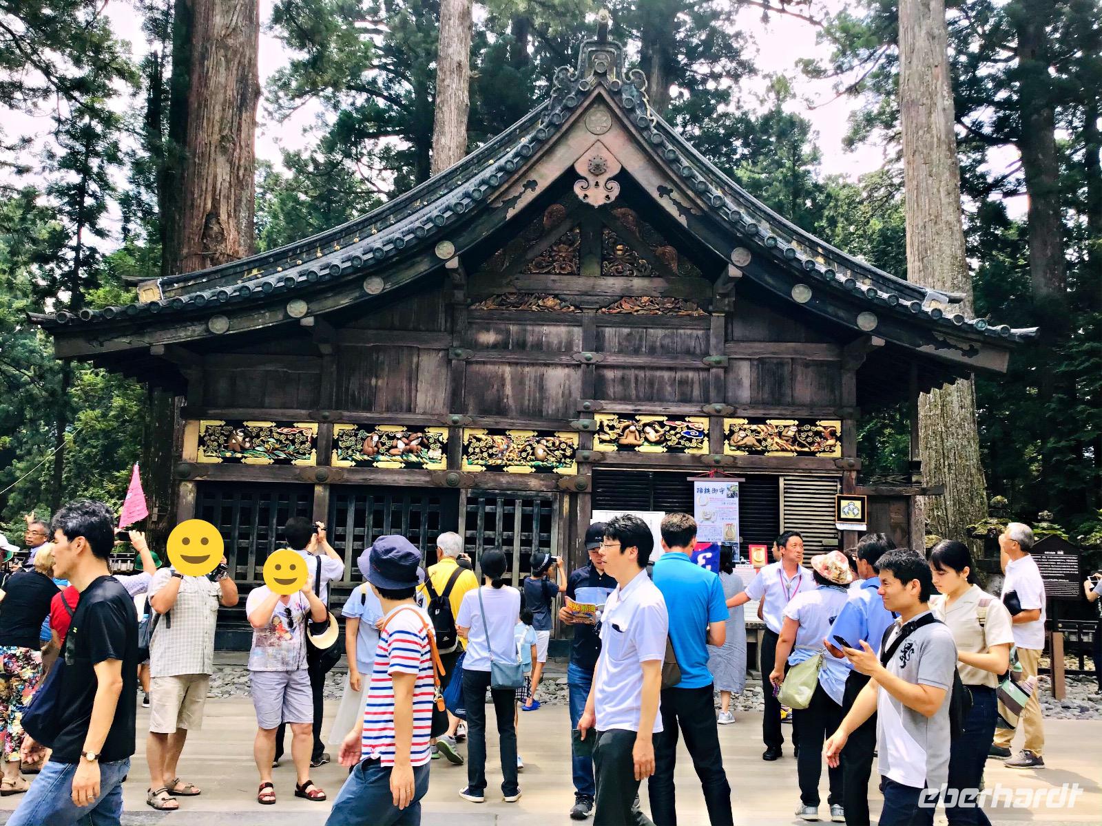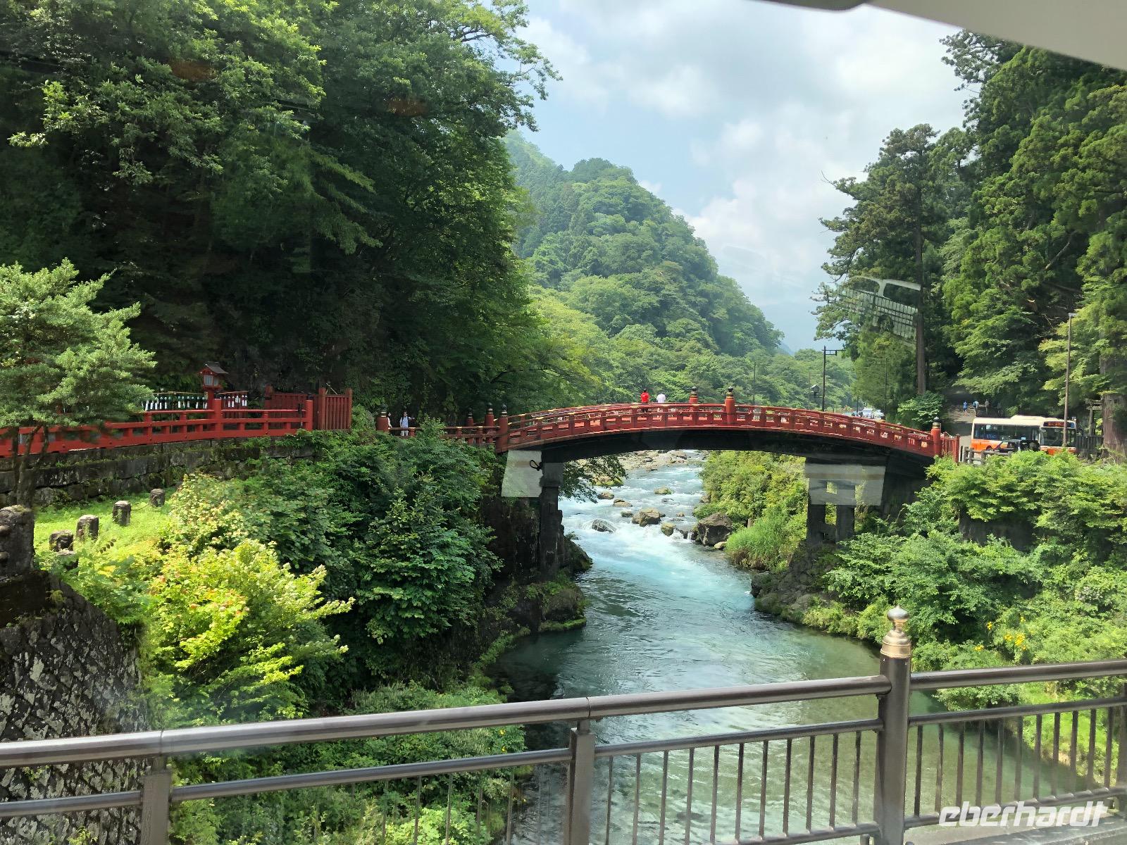 Frühstück gibt es ab 6.45 Uhr, um acht beginnt unsere Fahrt zum Nikko Nationalpark. Unterwegs bekommen wir einen Eindruck von der Größe Tokios, wir sehen den Tokio Tower und den Skytree, die beiden Fernsehtürme der Stadt. Später fahren wir am Tsumidafluss entlang, den viele Brücken überqueren. An seinen Ufern spielen junge Leute Baseball oder joggen, es ist Sonntag. Gegen elf erreichen wir Nikkon. Beliebtes Fotomotiv ist bei der Einfahrt zum Nationalpark die Heilige rote Brücke. Während es in Tokio brüllend heiß ist, herrschen hier angenehme Temperaturen. Wir fahren durch die kilometerlange Zedernallee, die direkt zum Toshogu Schrein führt. Die Zedern sind dreihundert Jahre alt, hoch und spenden heute angenehmen Schatten. Der Toshogu Schrein, den wir nun besuchen, ist dem Gründer des Tokugawa Iseyasu (1542 - 1616) gewidmet. Er wurde 1663 von seinem Enkel erbaut. Unser Besuch beginnt an der fünfstöckigen Pagode, die 35 Meter hoch ist, rot und golden lackiert und schwarze Türen hat. Der Heilige Stall, in dem sich heute kein lebendiges Pferd aufhält, wird der Giebel von den drei weltberühmten Affen geschmückt. Sie hören nichts Böses, sie sehen nichts Böses und sie sagen nichts Böses.