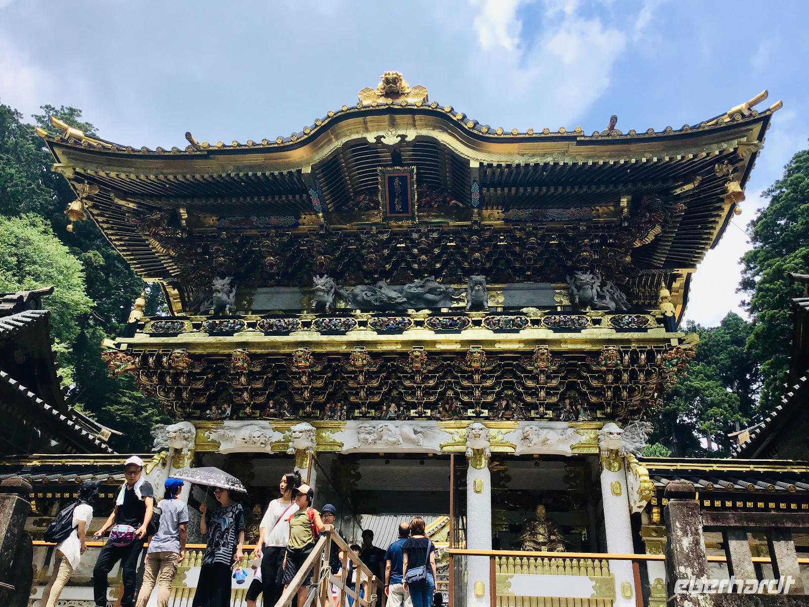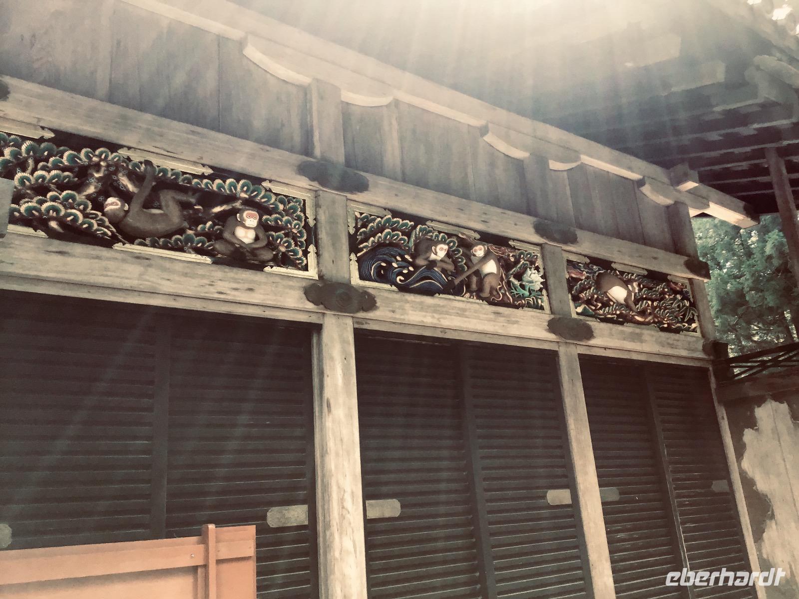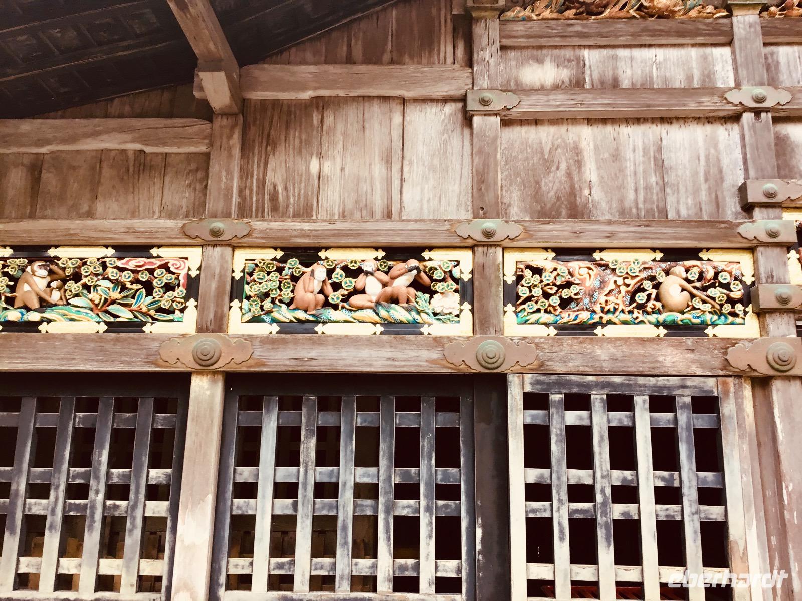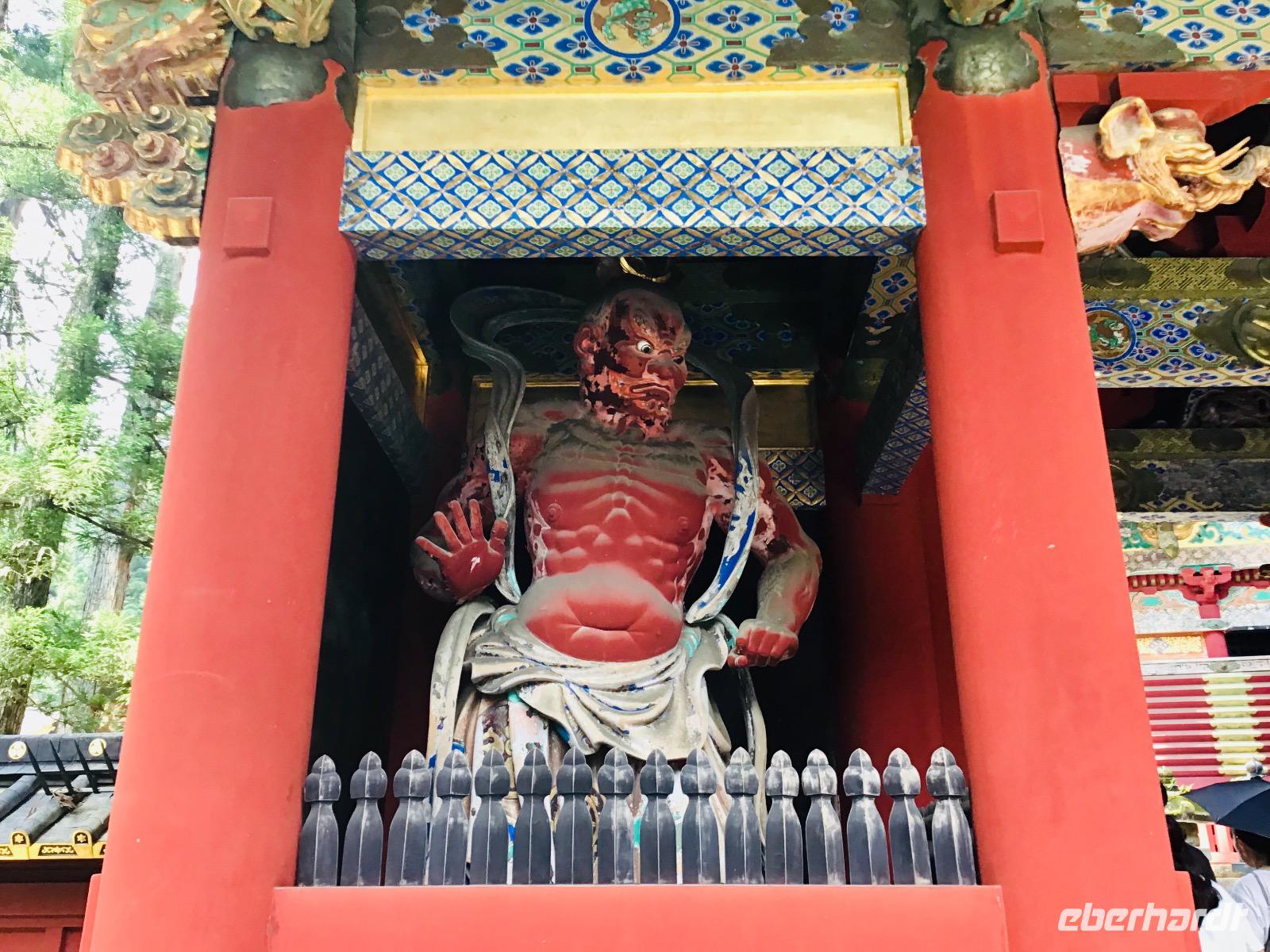 Frühstück gibt es ab 6.45 Uhr, um acht beginnt unsere Fahrt zum Nikko Nationalpark. Unterwegs bekommen wir einen Eindruck von der Größe Tokios, wir sehen den Tokio Tower und den Skytree, die beiden Fernsehtürme der Stadt. Später fahren wir am Tsumidafluss entlang, den viele Brücken überqueren. An seinen Ufern spielen junge Leute Baseball oder joggen, es ist Sonntag. Gegen elf erreichen wir Nikkon. Beliebtes Fotomotiv ist bei der Einfahrt zum Nationalpark die Heilige rote Brücke. Während es in Tokio brüllend heiß ist, herrschen hier angenehme Temperaturen. Wir fahren durch die kilometerlange Zedernallee, die direkt zum Toshogu Schrein führt. Die Zedern sind dreihundert Jahre alt, hoch und spenden heute angenehmen Schatten. Der Toshogu Schrein, den wir nun besuchen, ist dem Gründer des Tokugawa Iseyasu (1542 - 1616) gewidmet. Er wurde 1663 von seinem Enkel erbaut. Unser Besuch beginnt an der fünfstöckigen Pagode, die 35 Meter hoch ist, rot und golden lackiert und schwarze Türen hat. Der Heilige Stall, in dem sich heute kein lebendiges Pferd aufhält, wird der Giebel von den drei weltberühmten Affen geschmückt. Sie hören nichts Böses, sie sehen nichts Böses und sie sagen nichts Böses.
