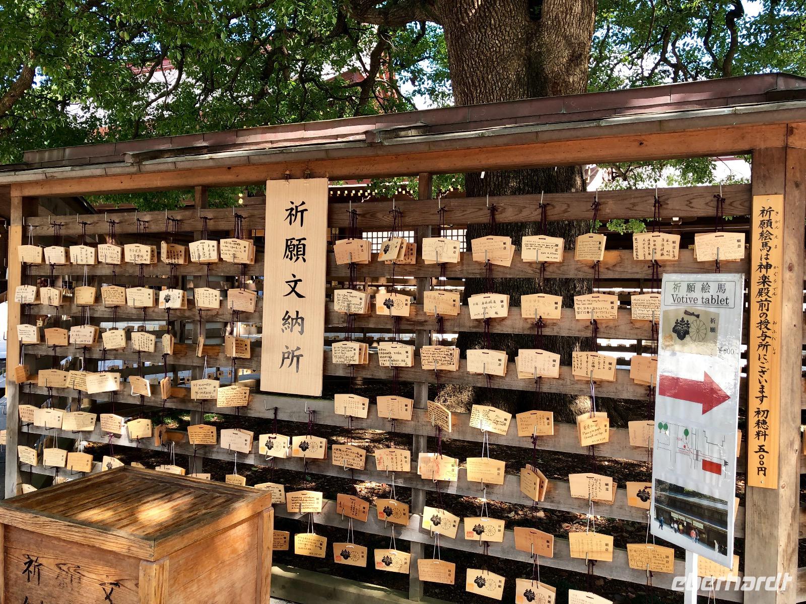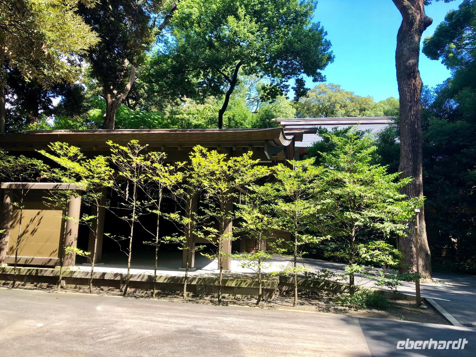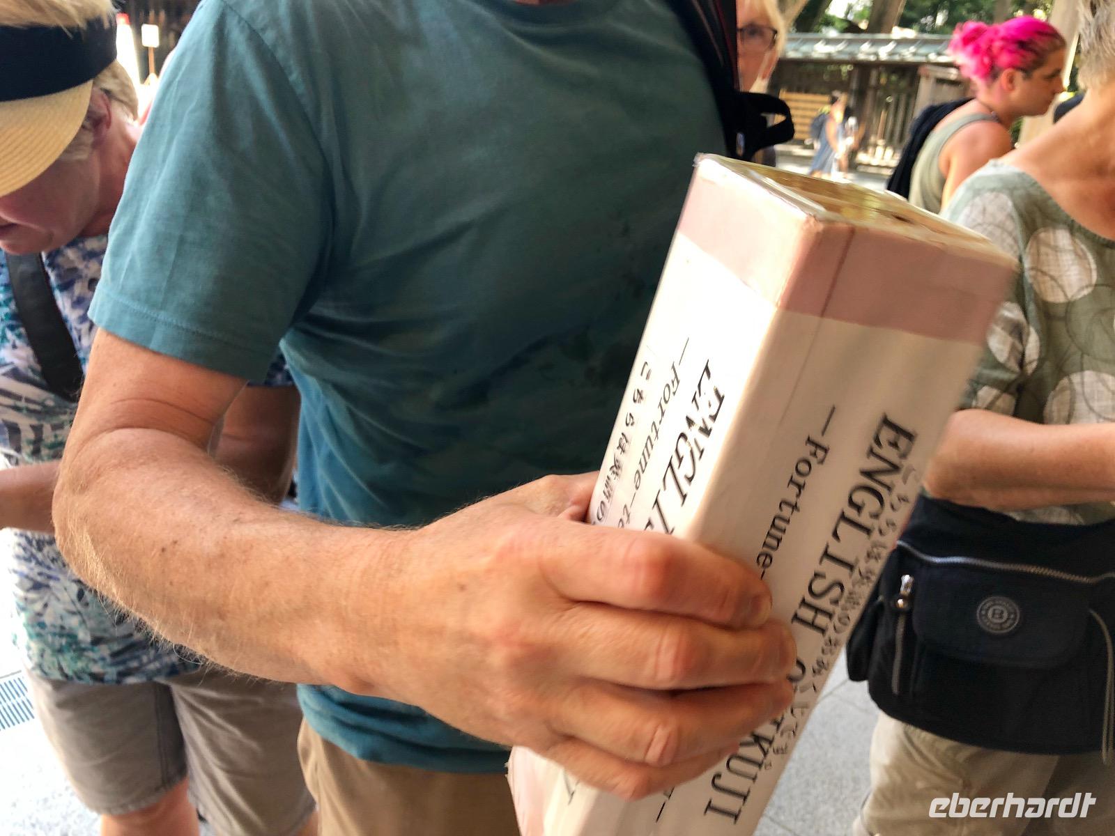 Wir reisen mit gepackten Koffern ab. Doch noch liegt ein ganzer Tag in Tokio vor uns. Zunächst besuchen wir den Meji-Schrein. Wir haben Glück und außer unserem sind noch keine Touristenbusse vor Ort. Wir spazieren durch einen Park bis wir das erste Tor erreichen. Mari zeigt uns, wie man korrekt ein Schreintor durchquert. Wir gehen durch den mittleren Durchgang, in dem wir uns wiederum links halten. Bevor wir durch das Tor gehen verneigen wir uns. Beim nächsten Tor wiederholt sich die Prozedur. Am Schrein können wir Glück und Gesundheit in Form von kleinen Säckchen kaufen oder ein Gedicht von Kaiser Meji höchstpersönlich geschrieben. Wer's glaubt. Interessant ist es allenthalben und wir probieren uns durch die verschiedenen Orakel oder schreiben unsere Wünsche auf. Schaden kann es ja nicht.
