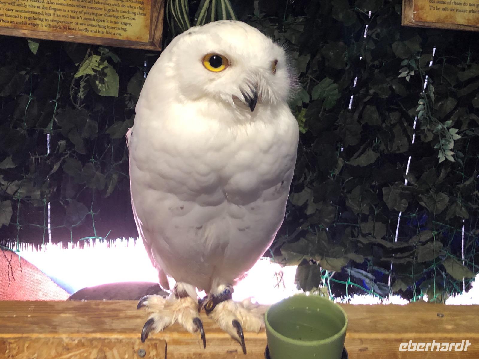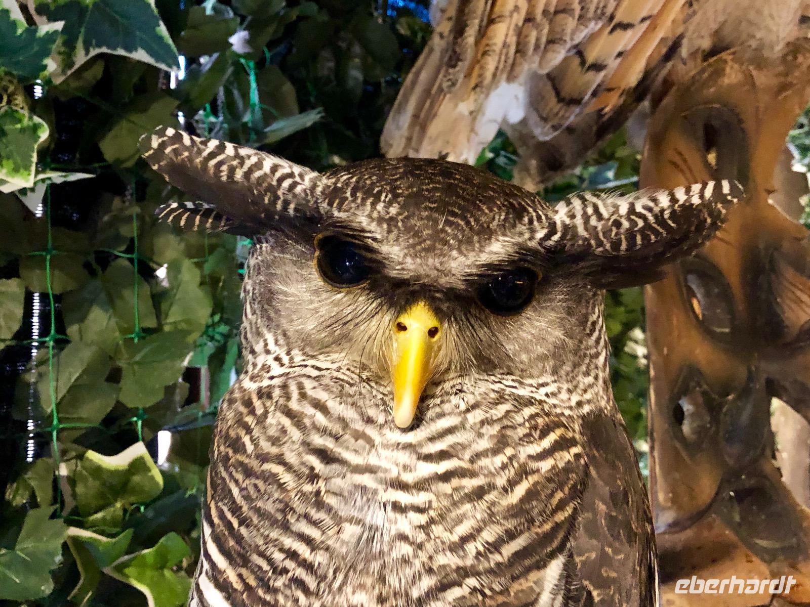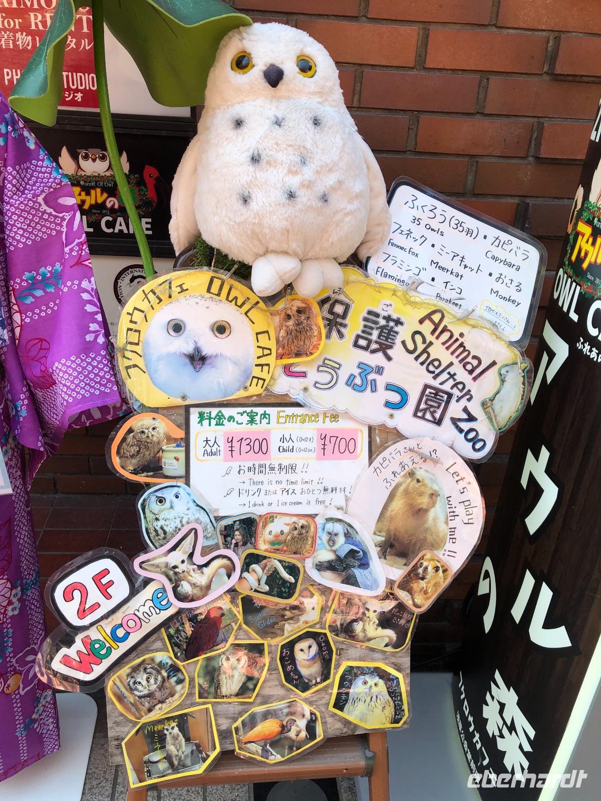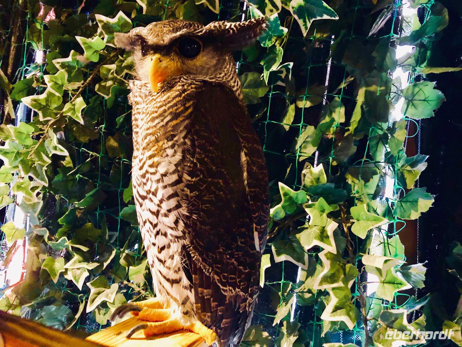 Im Asakusa-Viertel, an der gewaltigen roten Laterne bricht kurzzeitig Hektik aus. Es beschleicht uns das Gefühl, nicht alles sehen zu können und dazu noch einzukehren und noch Souvenirs zu kaufen, die Zeit ist einfach viel zu kurz. Also trennen wir uns und jeder kann seinen eigenen Bedürfnissen nachgehen. Einige von uns suchen ein Eulencafe. Hier soll man mit putzigen kleinen Eulen seinen Kaffee genießen können. Also, die Eulen sind da. Kleine, große, lustige. Allerdings müssen wir umgerechnet 11 € Eintritt bezahlen. Inklusive ist ein Getränk oder ein Eis. Und natürlich das Betrachten und bei Bedarf streicheln der Eulen. Ein riesiges Wasserschwein und ein paar Flamingos sind ebenfalls zu sehen. Schneller als geplant, verlassen wir jedoch das Etablissement, denn wir müssen uns noch kulinarisch versorgen. Die meisten landen bei leckeren Nudelsuppen in verschiedenen Geschmacksrichtungen.