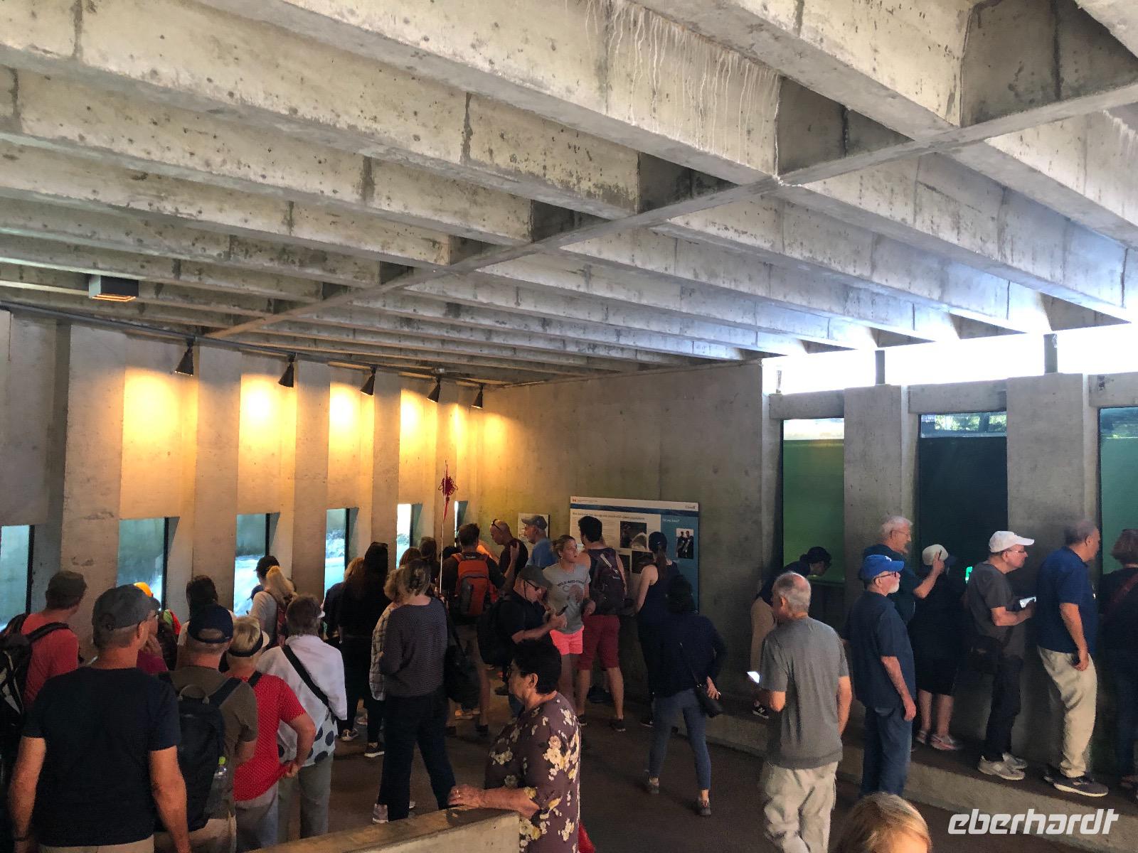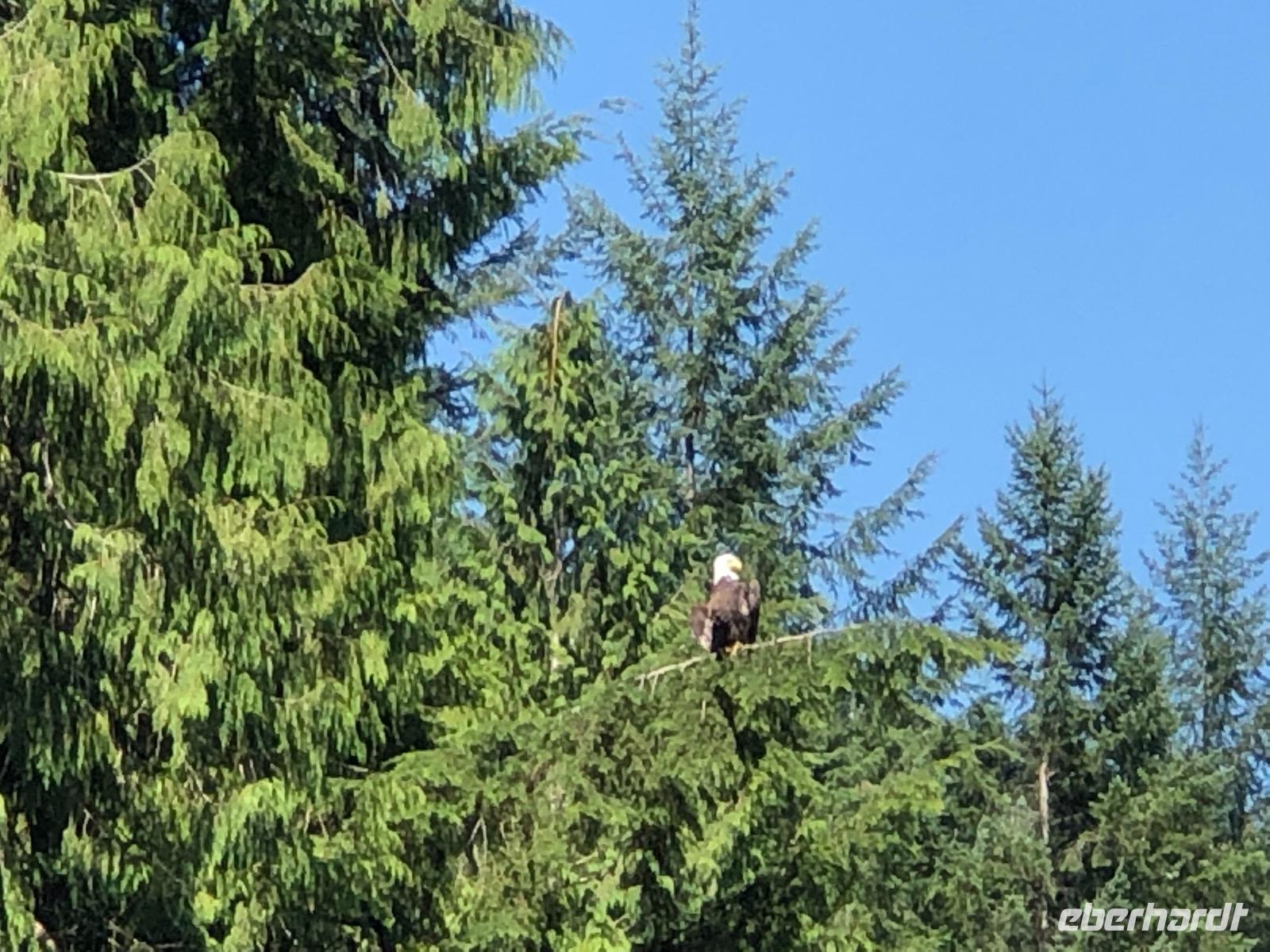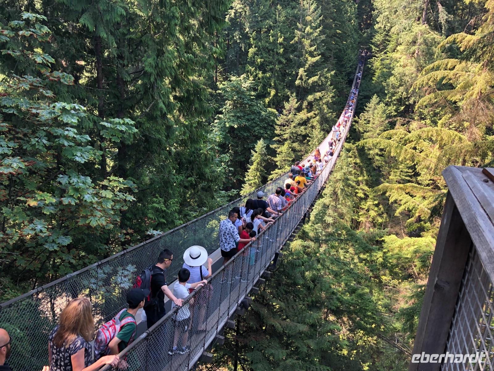 Heute, an einem der wenigen Tage, an denen wir ausschlafen können, gibt es das Frühstück im Hotel nur bis um neun. Nun ja, manchmal reichen auch zehn Minuten fürs Frühstück. Unser Programm beginnt heute erst um zwölf. Wir fahren über die Lionsbridge zur Lachsaufzuchtstation. Hier geht es nicht darum, Lachse zum Verzehr zu züchten, sondern ihre Art zu schützen. Nach der Besichtigung unternehmen wir einen kleinen Waldspaziergang und werden dabei von einem prächtigen Weißkopfseeadler beäugt. Am Nachmittag überqueren wir die Capilano Suspension Brücke, eine freischwingende Hängebrücke, die auch mächtig wackelt. Sie wurde Ende des 19. Jahrhunderts errichtet. Ein schottischer Ingenieur hatte auf beiden Seiten des Capilano Rivers Land erworben und sich auf einer Seite eine Hütte gebaut. Um diese zu erreichen, spannte er mit Hilfe von zwei Indianern eine Brücke aus Zedernholzplanken und Hanfseilen über den Fluss. Es dauerte noch viele Jahre und mehrfachen Besitzwechsel bis die Brücke sich zu einem beliebten Touristenziel entwickelte. Heute werden bis zu 800.000 Besucher pro Jahr gezählt.