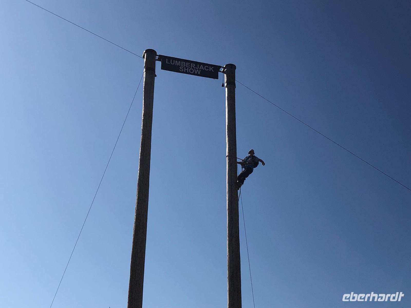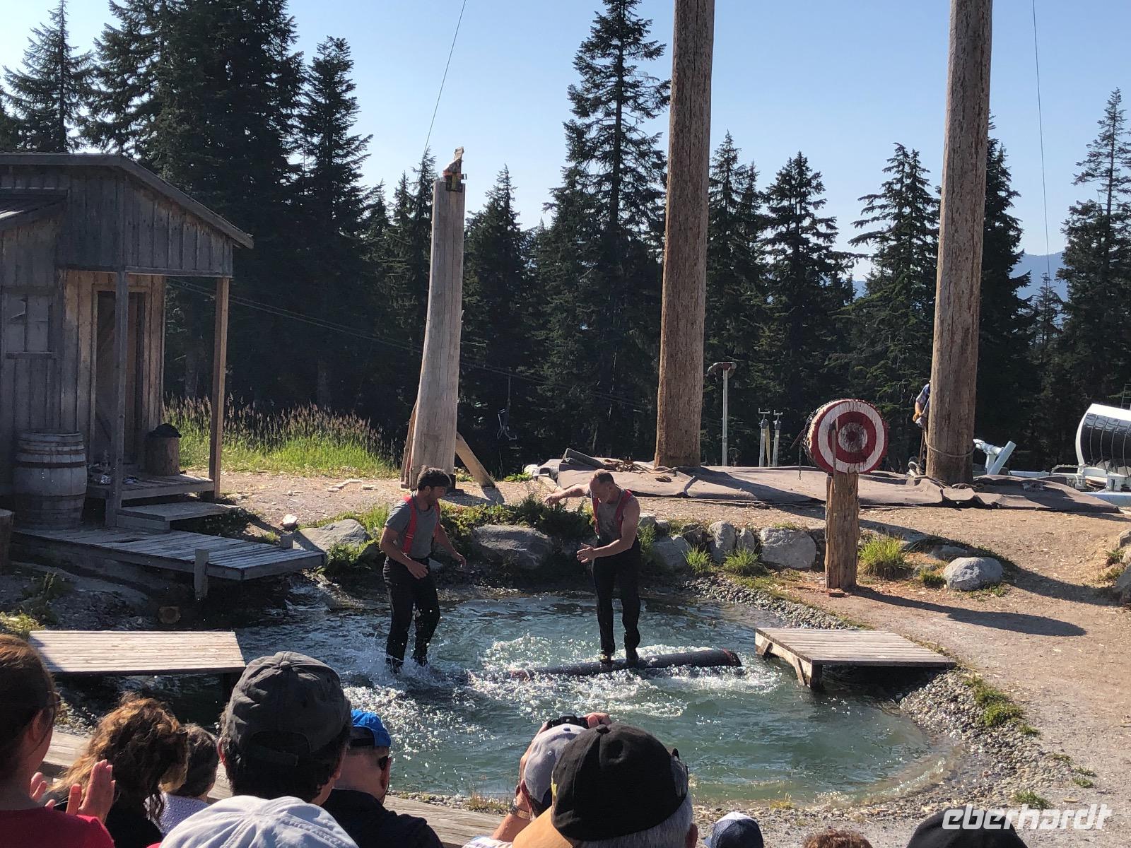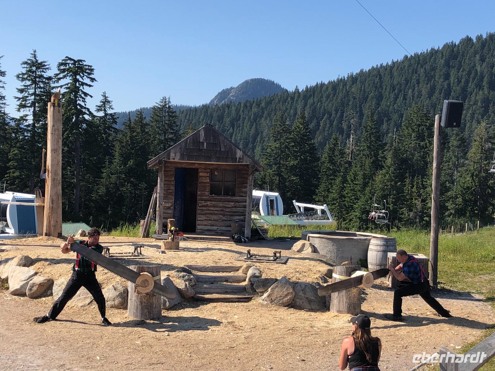Unser Weg führt uns weiter zum Grouse Mountain. Mit einer Seilbahn gelangen wir auf den 1231 Meter hohen Berg. Ein kurzer Spaziergang im schönsten Sonnenschein führt uns zu einer Bühne, auf der es gleich eine Lumberjack (Holzfäller) Show geben wird. In einer halben Stunde gelingt es den Holzfällern tatsächlich uns immer wieder herzlich zum Lachen zu bringen. Nun besuchen wir noch das Grizzlygehege und auch die Bären sind uns wohlgesonnen und liegen nicht nur faul in der Ecke.