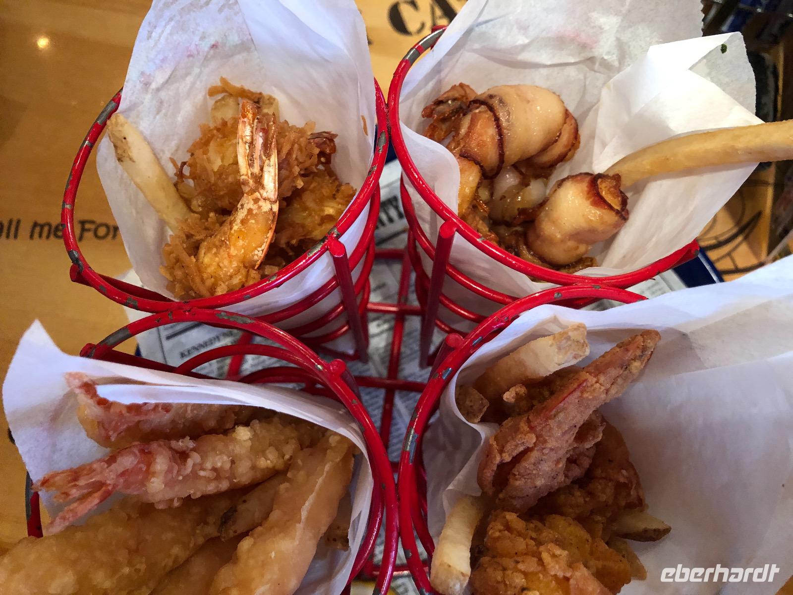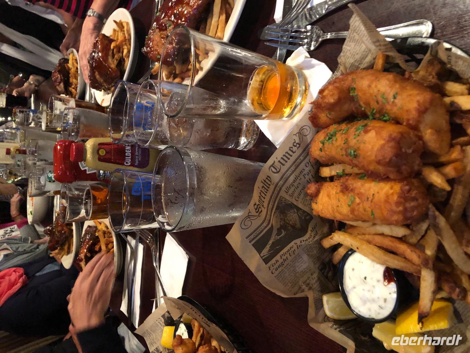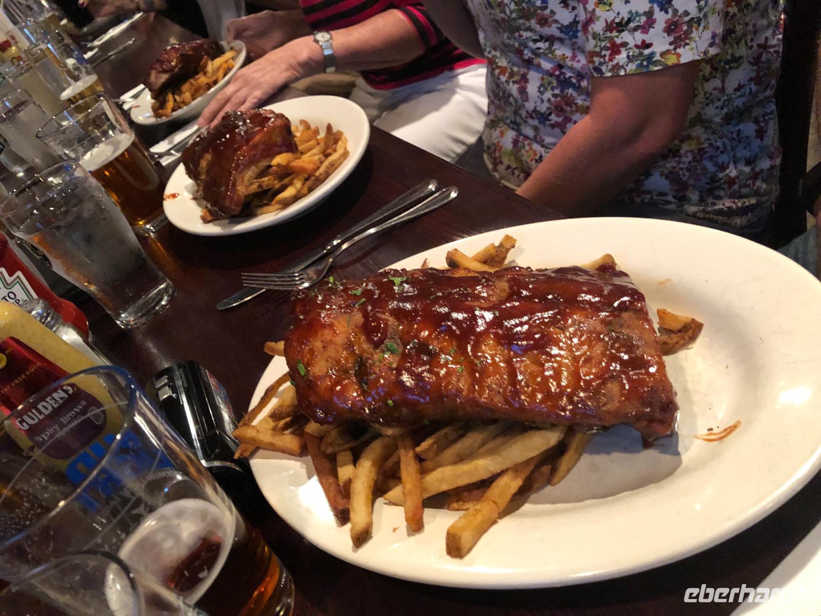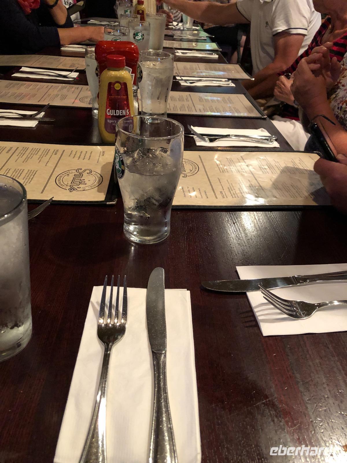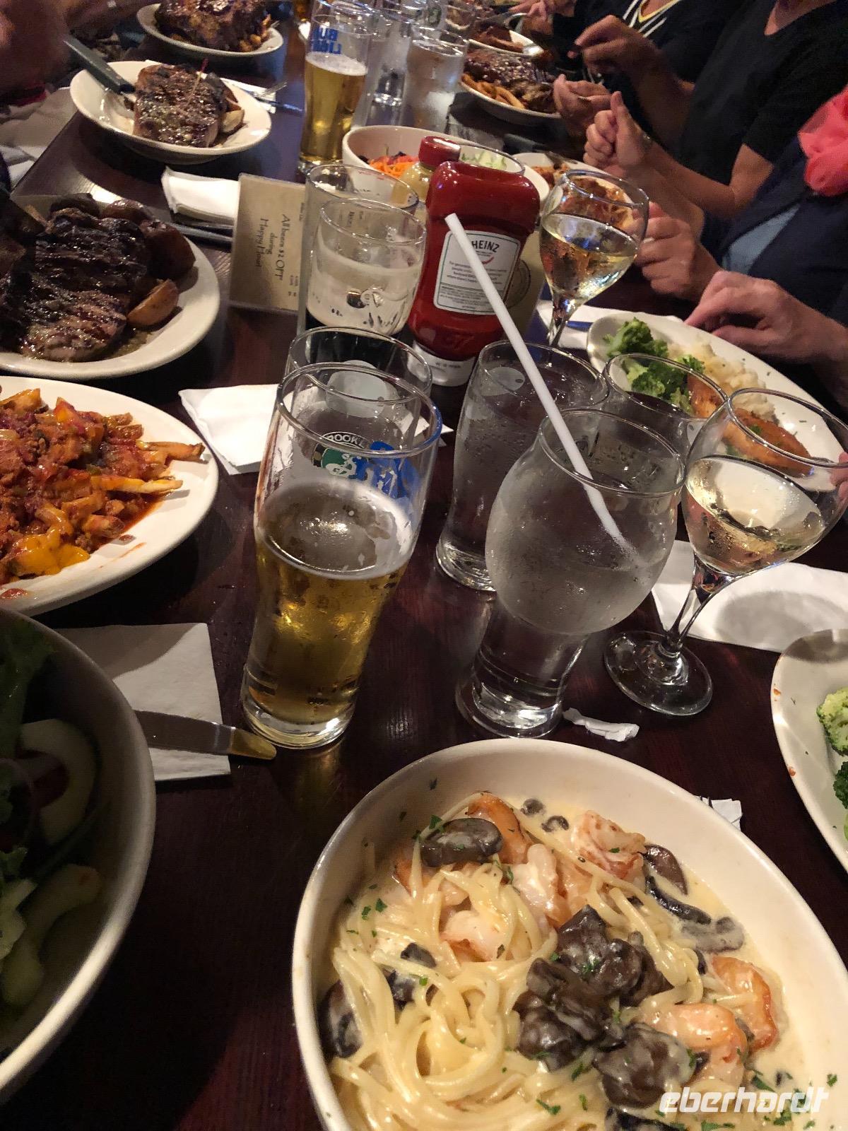Nun ist es endlich an der Zeit zum Hotel zu fahren, uns fallen doch ab und zu die Augen zu. Noch aber ist keine Zeit zum Schlafen. Gegenüber vom Hotel erwartet uns ein typisch amerikanisches Abendessen: wir können zwischen großen Fleischportionen, Burgern, Salaten und anderem wählen. Die Stimmung ist ausgelassen, es ist unser letzter gemeinsamer Abend.