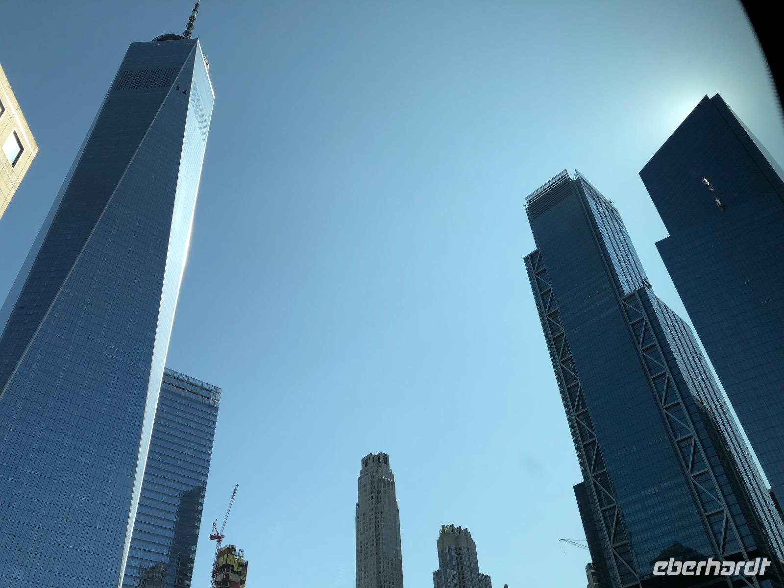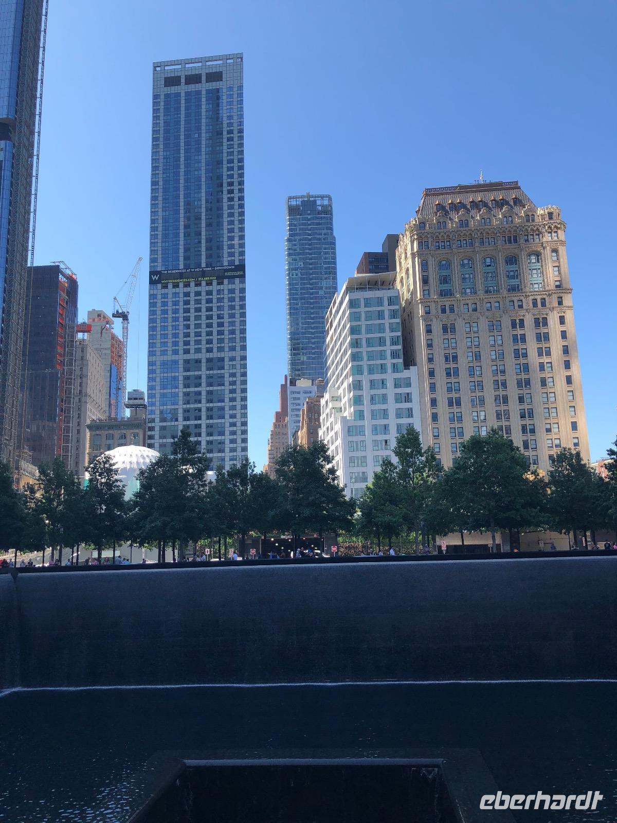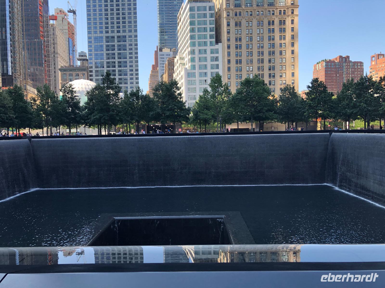Den Abschluss unserer Stadtbesichtigung bildet das Areal der Gedenkstätte Nine Eleven oder 9/11, an der den fast dreitausend Opfern der Terroranschläge von 2001 und 1993 gedacht wird. An der Stelle, wo sich ehemals die Zwillingstürme des World Trade Centers befanden, sind zwei große Wasserbecken errichtet worden, an deren Rand die Namen der Getöteten eingraviert sind. Dieser Besuch ist sehr bewegend.