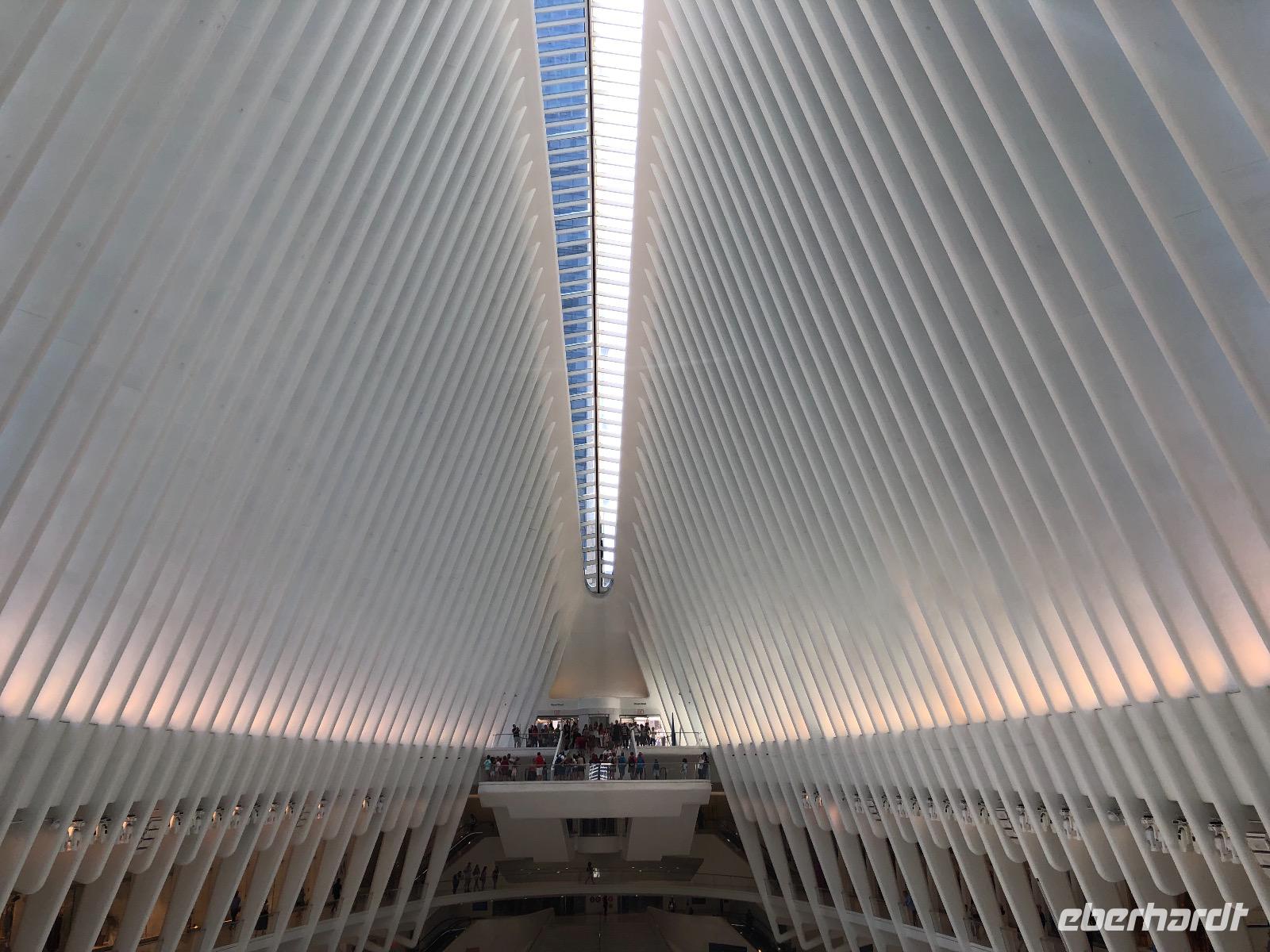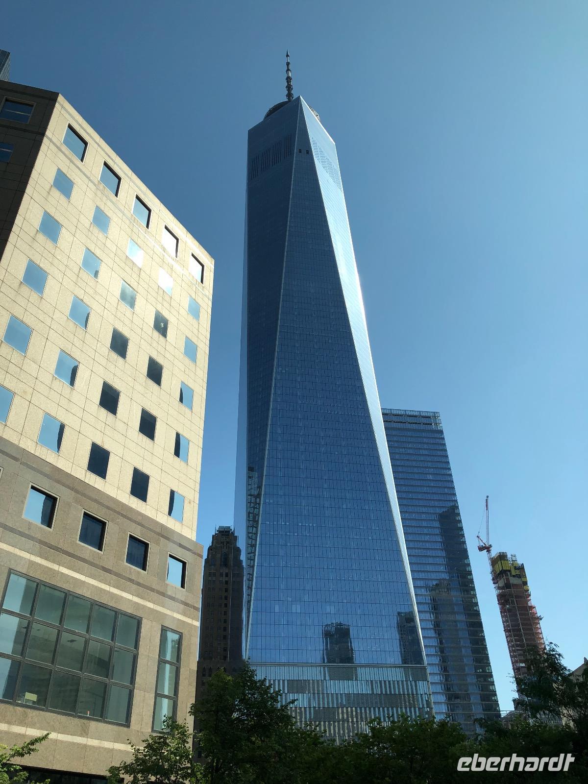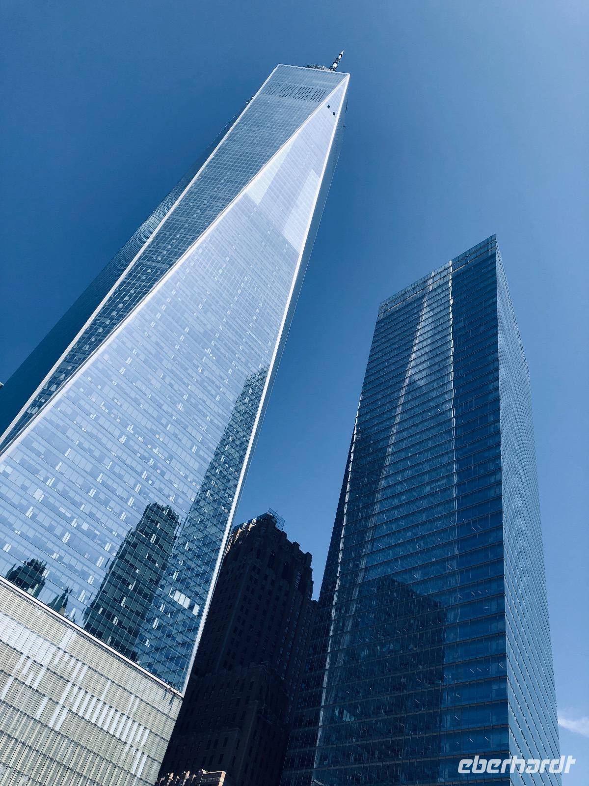 Den Abschluss unserer Stadtbesichtigung bildet das Areal der Gedenkstätte Nine Eleven oder 9/11, an der den fast dreitausend Opfern der Terroranschläge von 2001 und 1993 gedacht wird. An der Stelle, wo sich ehemals die Zwillingstürme des World Trade Centers befanden, sind zwei große Wasserbecken errichtet worden, an deren Rand die Namen der Getöteten eingraviert sind. Dieser Besuch ist sehr bewegend.