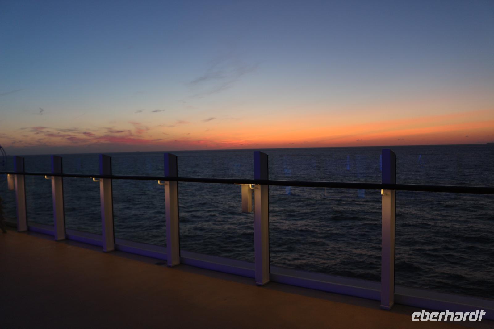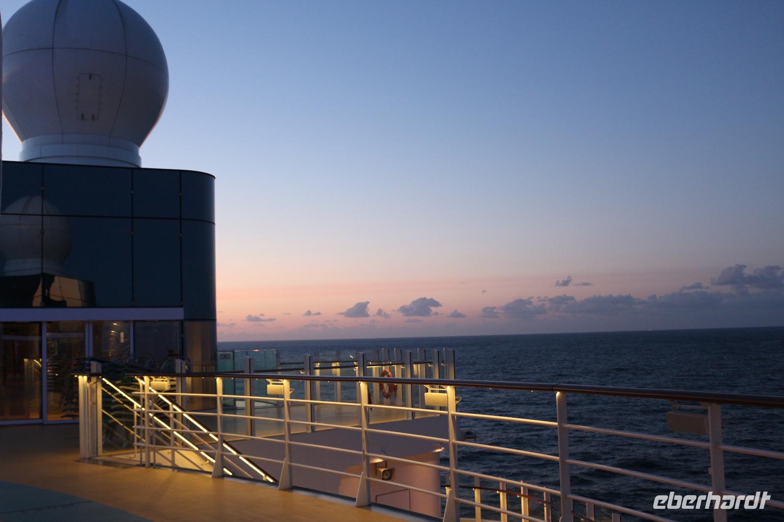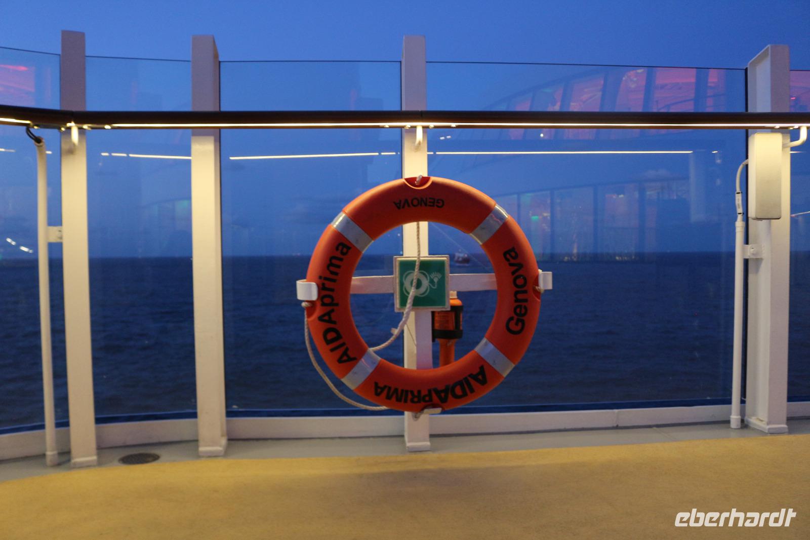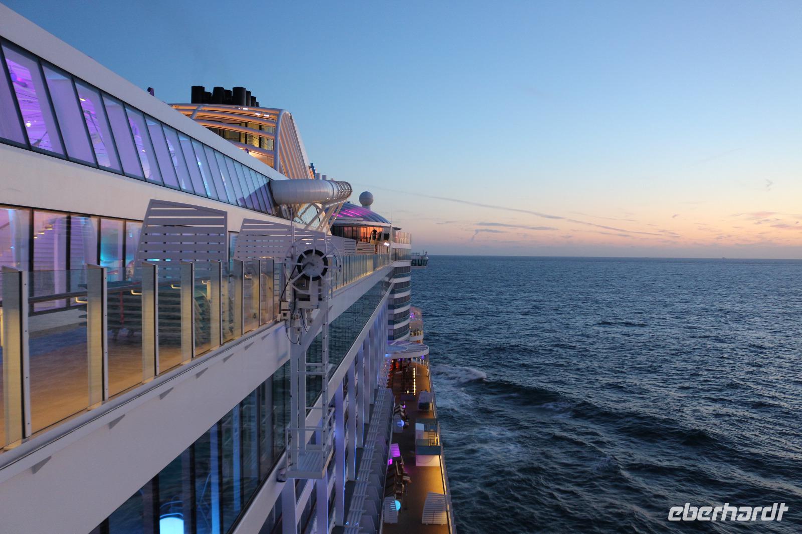 Heute hatten wir Gelegenheit, nach dem gestrigen anstrengenden Tag, etwas zu entspannen. Dies begann schon mit dem Frühstück. Obwohl auch so kein Zeitdruck vorhanden gewesen wäre, wurde uns durch die Zeitumstellung eine weitere Stunde geschenkt. Jeder hatte die Möglichkeit, individuell in einem der zahlreichen Restaurants den Tag mit einem ausgiebigen Frühstück zu beginnen. Anschließend trafen wir uns 11.00 Uhr in der Bar D6, wo wir mit einem Glas Sekt empfangen wurden und auf eine schöne Reise anstießen. Anschließend wurden wir von Svenja, einem Crew-Mitglied, abgeholt, welche uns das Schiff zeigte. Zunächst führte sie uns in das Cabaret Nightfly, von wo aus wir auch in die Champagnerbar Spray Bar gingen. Dort gab es zwar keinen Champagner für uns, stattdessen jedoch einen traumhaften Blick auf das Wasser, nachdem wir das Freie betreten hatten und uns direkt im Bug des Schiffes befanden. Anschließend führte uns Svenja zum Theatrium und zeigte uns die verschiedenen Restaurants. Schließlich erkundeten wir gemeinsam den Kinder- und Familienbereich „Four Elements" sowie den Beachclub. Nachdem wir auch alle wussten, wo sich der SPA-Bereich befindet, verabschiedeten wir uns von ihr und dankten ihr für diese hilfreiche und lustige Führung über die AIDAprima. Anschließend bestand für jeden die Möglichkeit, in einem der zahlreichen Restaurants etwas zum Mittag zu essen. Auch der Nachmittag stand jedem zur freien Verfügung, beispielsweise für einen Besuch des Pools oder einer der zahlreichen Kurse und Workshops.