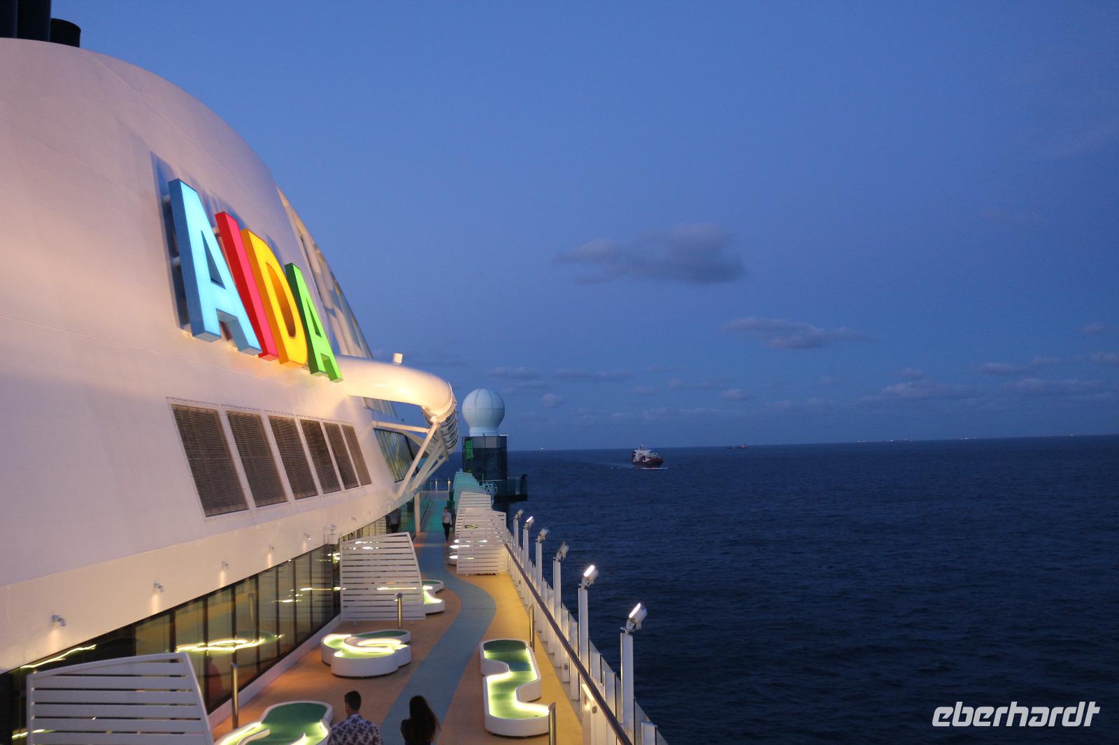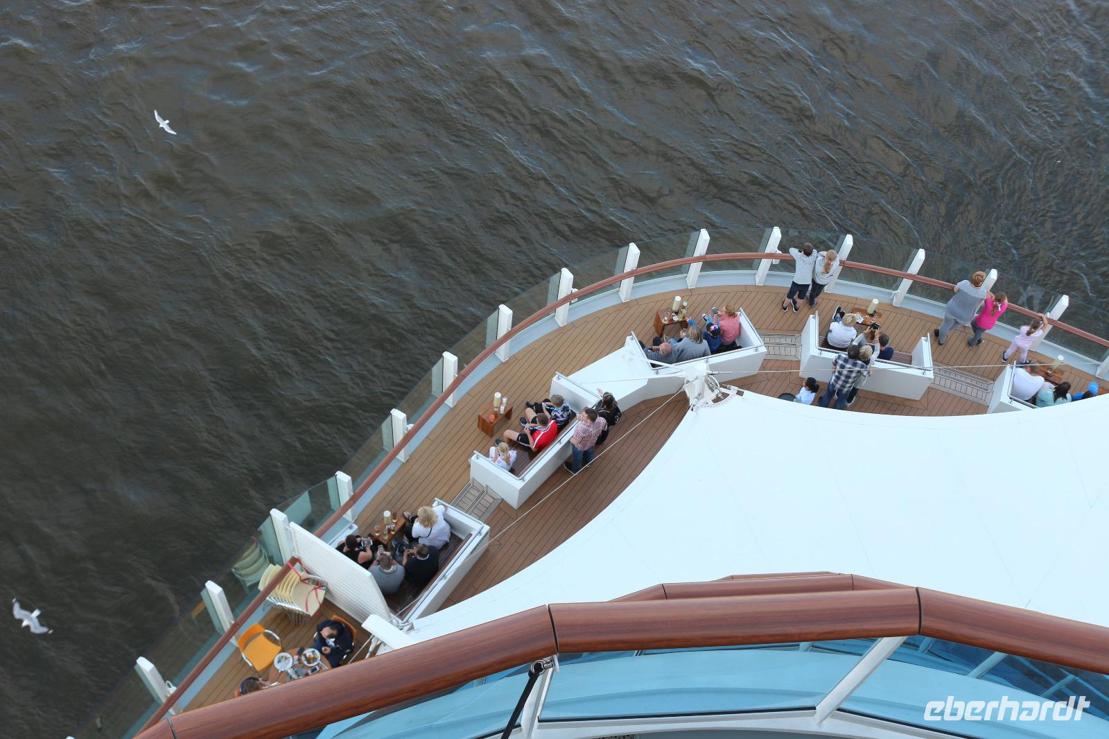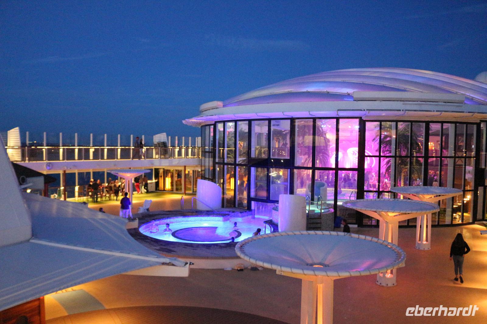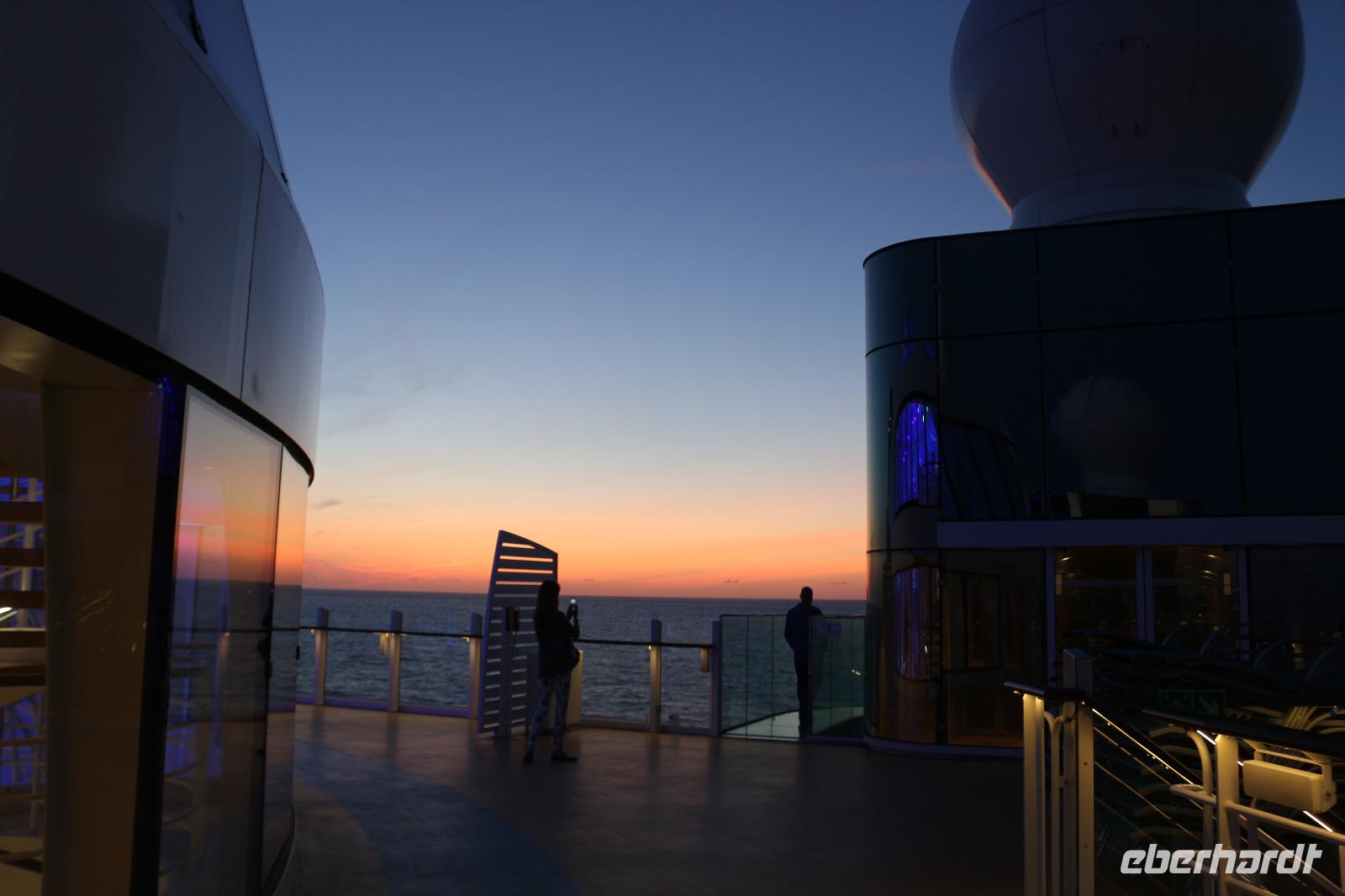 Heute hatten wir Gelegenheit, nach dem gestrigen anstrengenden Tag, etwas zu entspannen. Dies begann schon mit dem Frühstück. Obwohl auch so kein Zeitdruck vorhanden gewesen wäre, wurde uns durch die Zeitumstellung eine weitere Stunde geschenkt. Jeder hatte die Möglichkeit, individuell in einem der zahlreichen Restaurants den Tag mit einem ausgiebigen Frühstück zu beginnen. Anschließend trafen wir uns 11.00 Uhr in der Bar D6, wo wir mit einem Glas Sekt empfangen wurden und auf eine schöne Reise anstießen. Anschließend wurden wir von Svenja, einem Crew-Mitglied, abgeholt, welche uns das Schiff zeigte. Zunächst führte sie uns in das Cabaret Nightfly, von wo aus wir auch in die Champagnerbar Spray Bar gingen. Dort gab es zwar keinen Champagner für uns, stattdessen jedoch einen traumhaften Blick auf das Wasser, nachdem wir das Freie betreten hatten und uns direkt im Bug des Schiffes befanden. Anschließend führte uns Svenja zum Theatrium und zeigte uns die verschiedenen Restaurants. Schließlich erkundeten wir gemeinsam den Kinder- und Familienbereich „Four Elements" sowie den Beachclub. Nachdem wir auch alle wussten, wo sich der SPA-Bereich befindet, verabschiedeten wir uns von ihr und dankten ihr für diese hilfreiche und lustige Führung über die AIDAprima. Anschließend bestand für jeden die Möglichkeit, in einem der zahlreichen Restaurants etwas zum Mittag zu essen. Auch der Nachmittag stand jedem zur freien Verfügung, beispielsweise für einen Besuch des Pools oder einer der zahlreichen Kurse und Workshops.