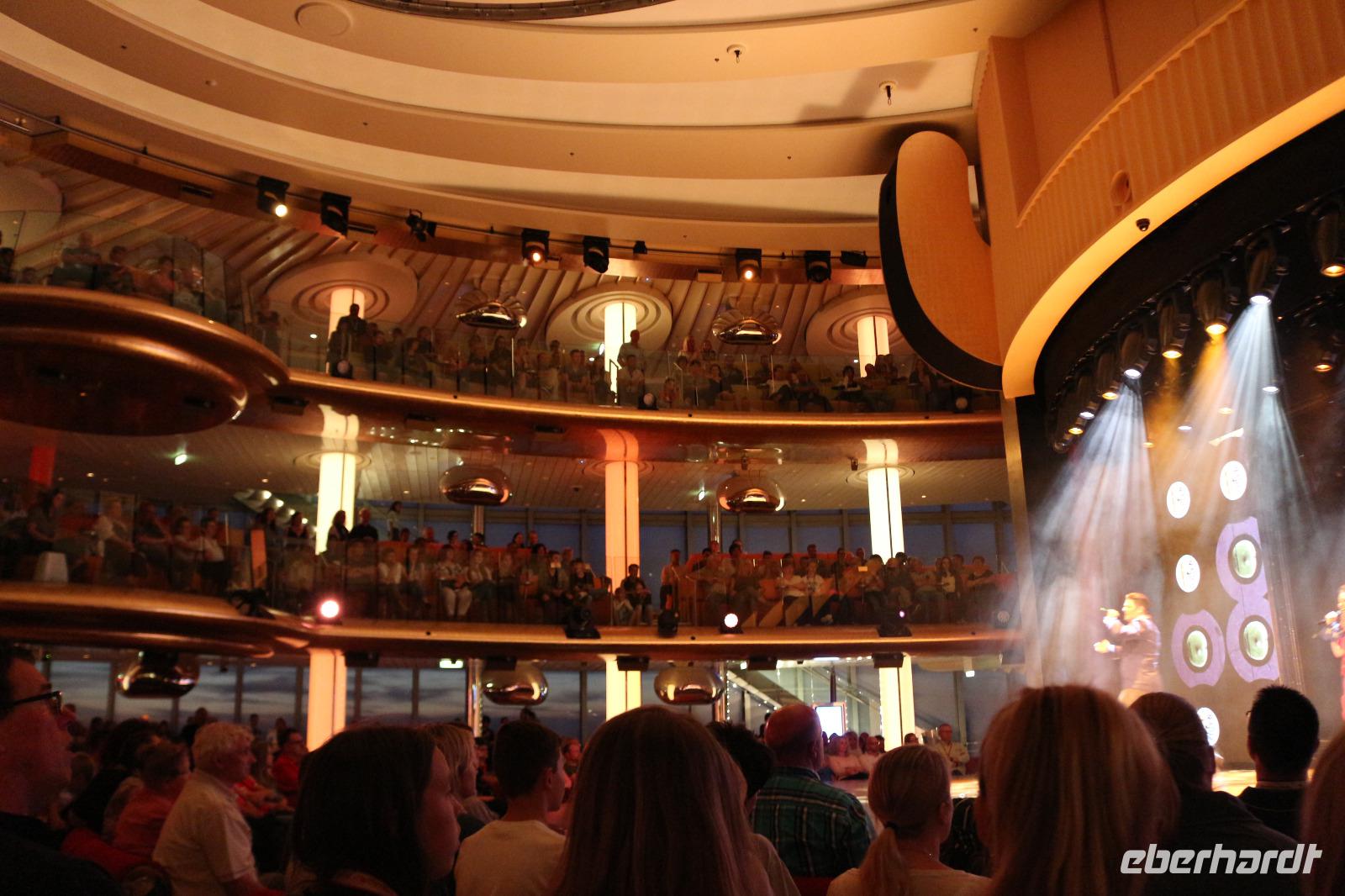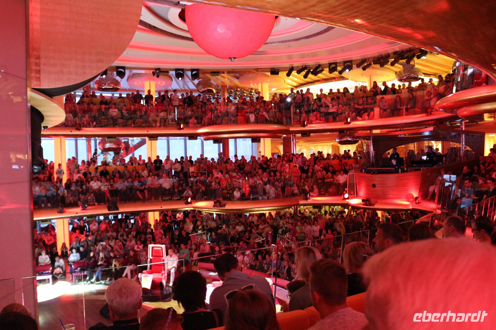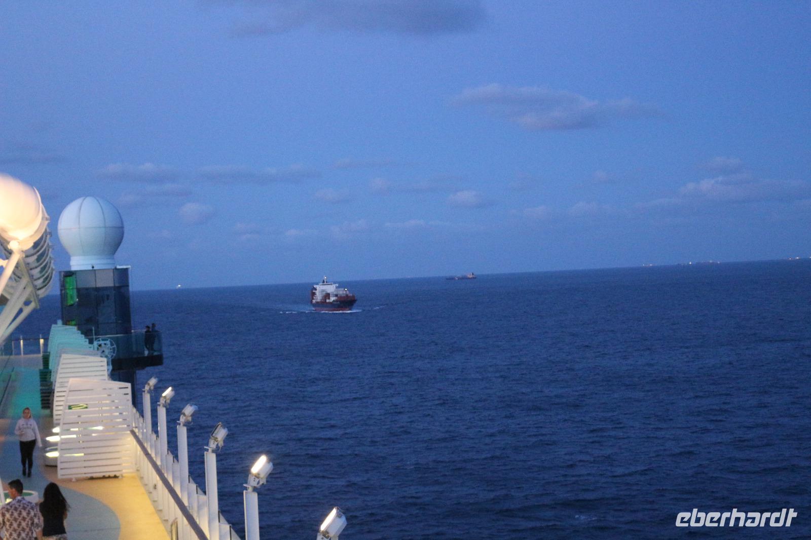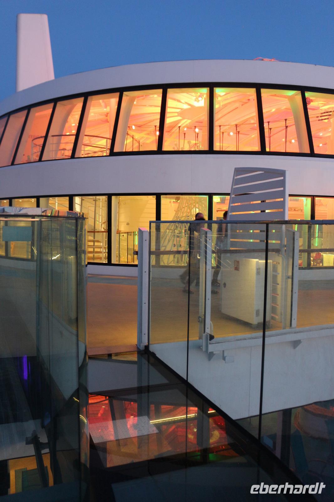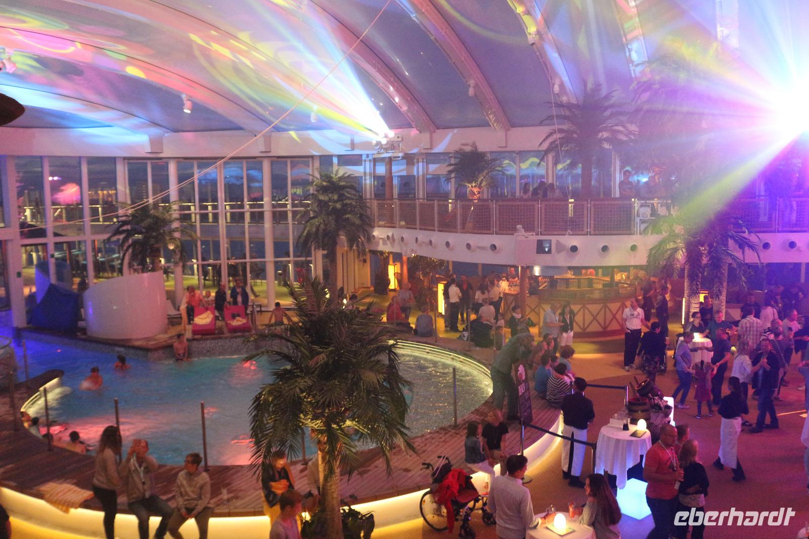 Heute hatten wir Gelegenheit, nach dem gestrigen anstrengenden Tag, etwas zu entspannen. Dies begann schon mit dem Frühstück. Obwohl auch so kein Zeitdruck vorhanden gewesen wäre, wurde uns durch die Zeitumstellung eine weitere Stunde geschenkt. Jeder hatte die Möglichkeit, individuell in einem der zahlreichen Restaurants den Tag mit einem ausgiebigen Frühstück zu beginnen. Anschließend trafen wir uns 11.00 Uhr in der Bar D6, wo wir mit einem Glas Sekt empfangen wurden und auf eine schöne Reise anstießen. Anschließend wurden wir von Svenja, einem Crew-Mitglied, abgeholt, welche uns das Schiff zeigte. Zunächst führte sie uns in das Cabaret Nightfly, von wo aus wir auch in die Champagnerbar Spray Bar gingen. Dort gab es zwar keinen Champagner für uns, stattdessen jedoch einen traumhaften Blick auf das Wasser, nachdem wir das Freie betreten hatten und uns direkt im Bug des Schiffes befanden. Anschließend führte uns Svenja zum Theatrium und zeigte uns die verschiedenen Restaurants. Schließlich erkundeten wir gemeinsam den Kinder- und Familienbereich „Four Elements" sowie den Beachclub. Nachdem wir auch alle wussten, wo sich der SPA-Bereich befindet, verabschiedeten wir uns von ihr und dankten ihr für diese hilfreiche und lustige Führung über die AIDAprima. Anschließend bestand für jeden die Möglichkeit, in einem der zahlreichen Restaurants etwas zum Mittag zu essen. Auch der Nachmittag stand jedem zur freien Verfügung, beispielsweise für einen Besuch des Pools oder einer der zahlreichen Kurse und Workshops.