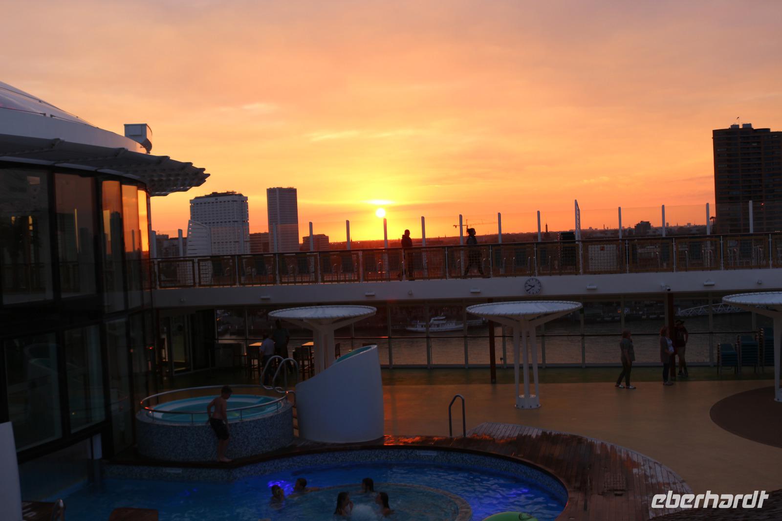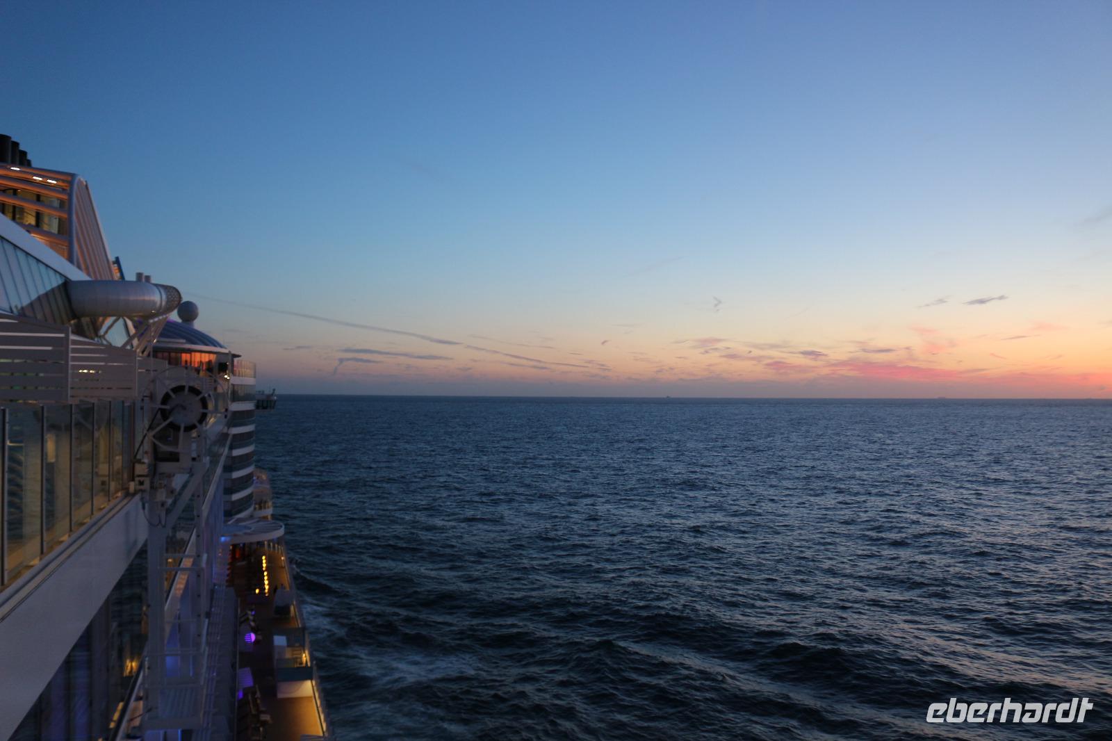 Am Morgen verließ unser Schiff den Hafen von Rotterdam. Ein letztes Mal ertönte nun die uns so lieb gewordene Melodie des Liedes „Sail Away" von Enya. Der heutige Tag stand jedem zur freien Verfügung, um die Annehmlichkeiten an Bord zu genießen. Nach dem Frühstück bestand so die Möglichkeit, die vielfältigen Sport- und Unterhaltungsangebote zu nutzen oder im Wellness- und SPA-Bereich zu entspannen. 12.00 Uhr trafen wir uns am altbekannten Treffpunkt, dem Pier 3 Market by Starbucks, um die Abreise am folgenden Tag zu besprechen. Im Anschluss stand an Vielzahl an Restaurants zur Auswahl, um ein Mittagessen zu genießen. Nach freien Stunden am Nachmittag trafen wir uns 18.00 Uhr wieder im Theatrium zur bereits angekündigten Überraschung. Es gab schon viele Ideen, was uns nun erwarten würde, aber die meisten lagen weit daneben. Zunächst hatten wir die Möglichkeit, an der Nautischen Fragestunde teilzunehmen, wo beispielsweise Fragen zur GPS-Steuerung sowie zur Piraterie beantwortet wurden. Anschließend wurden wir vom Hotelmanager abgeholt und alle erfuhren, was sie erwartete: ein Foto mit dem Kapitän. Wir wurden zur Plaza gebracht, wo uns wenig später der Kapitän empfing. Wir platzierten uns für das Foto, während die Fotografin das noch notwenige Equipment organisierte und die letzten Feineinstellungen traf. Währenddessen wurden wir auch von den vorbeikommenden Passagieren mehrfach fotografiert, sodass wir uns wie VIPs fühlen konnten. Schließlich entstand ein gelungenes Foto, bevor sich der Kapitän schließlich wieder verabschiedete und uns noch eine schöne Reise wünschte. Ein großer Teil der Gruppe ging nun zum Restaurant Casa Nova, wo für uns Tische reserviert waren. Wir genossen ein sehr schmackhaftes 3-Gang-Menü, welches uns serviert wurde und ließen den Abend in sehr angenehmer Atmosphäre ausklingen. Anschließend zog es wieder einige ins Brauhaus, um bei einem leckeren Zwickl-Bier und dem einen oder anderen Tänzchen unsere wunderschöne Reise ausklingen zu lassen.