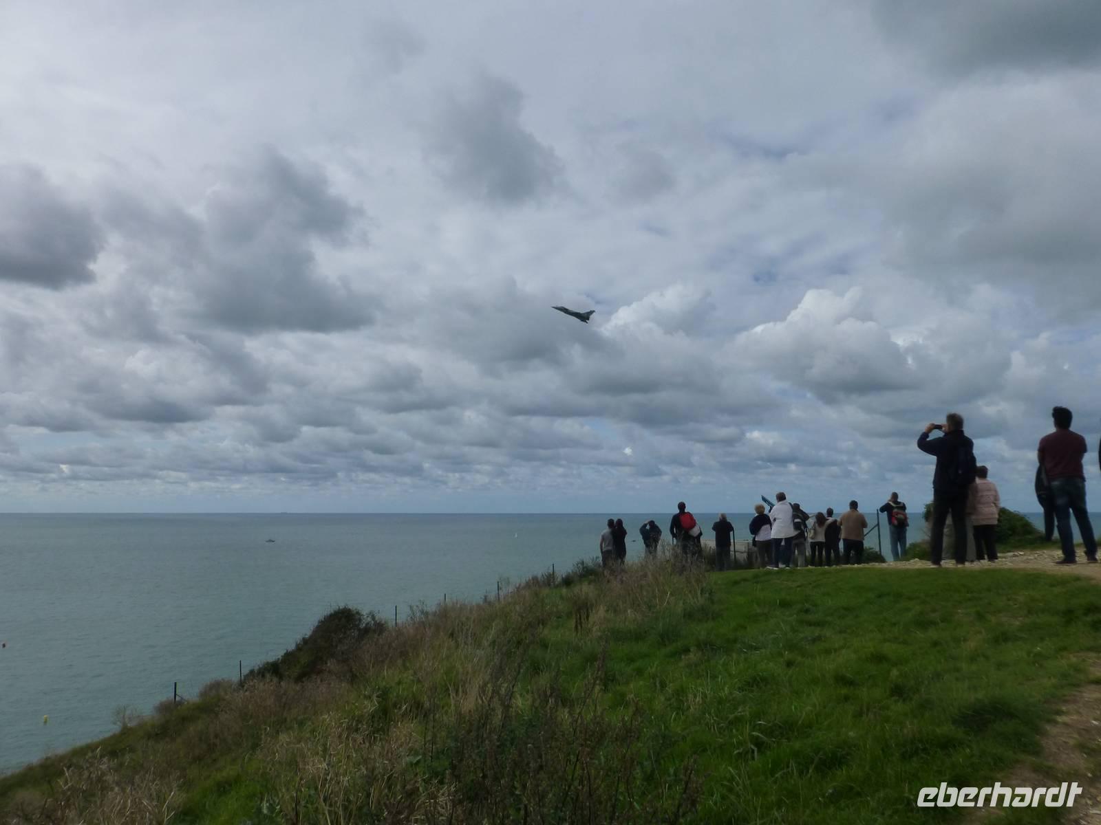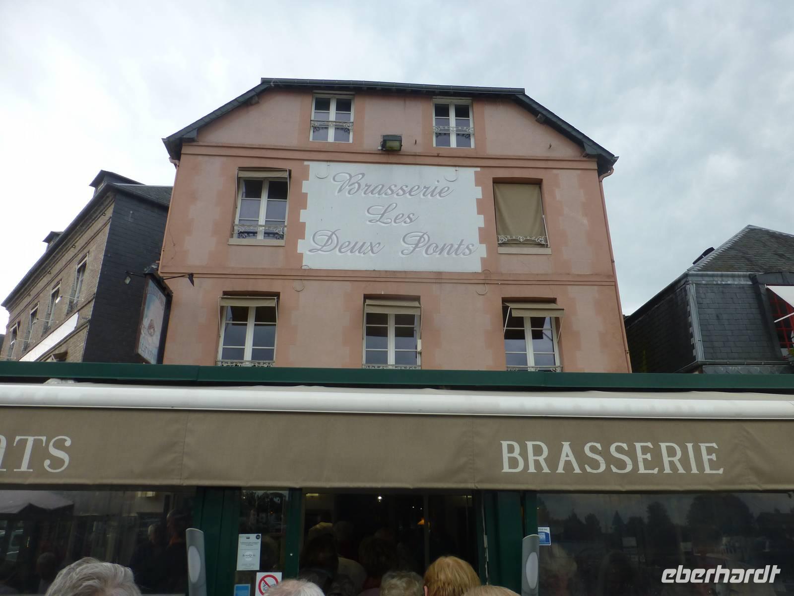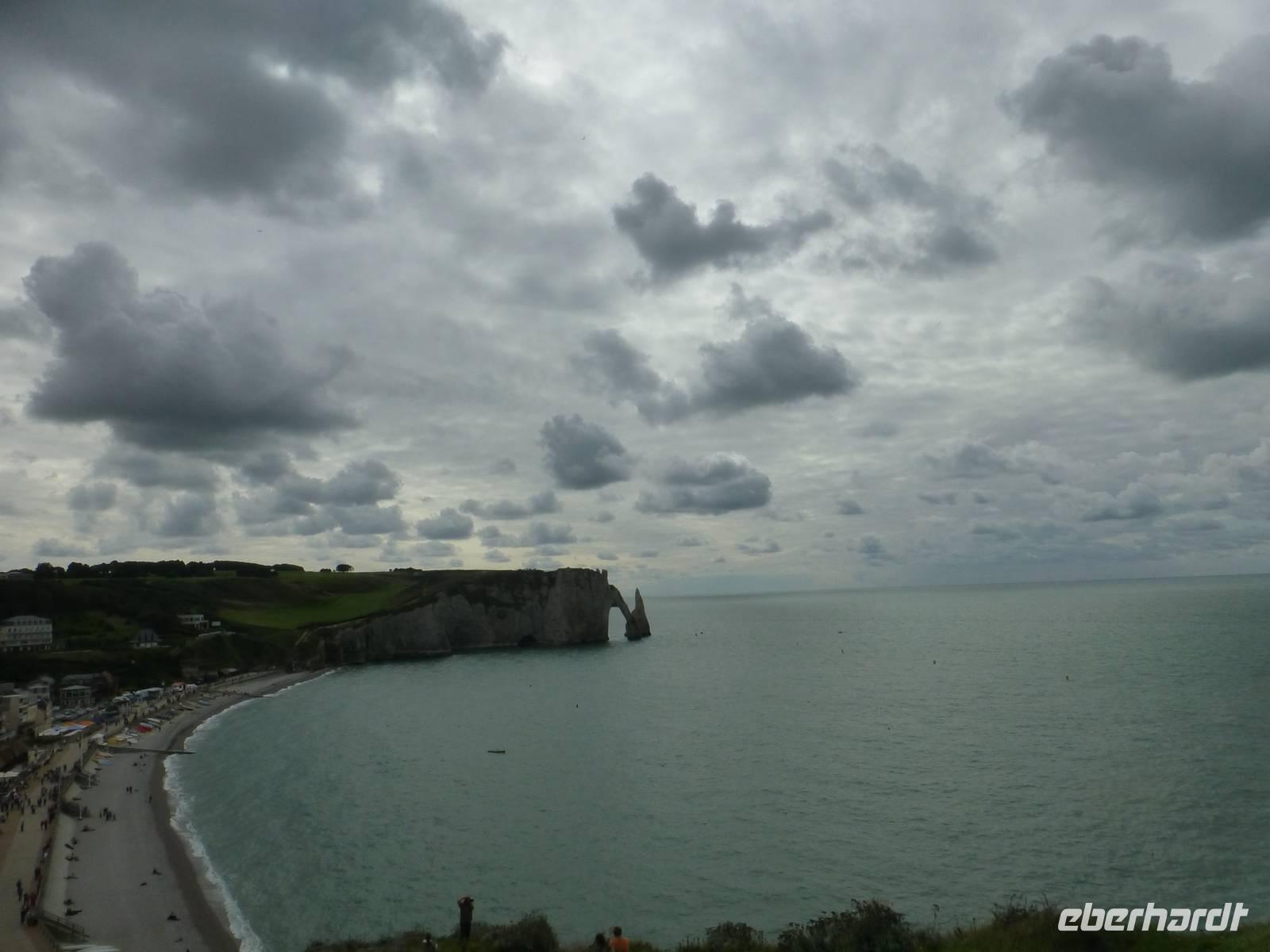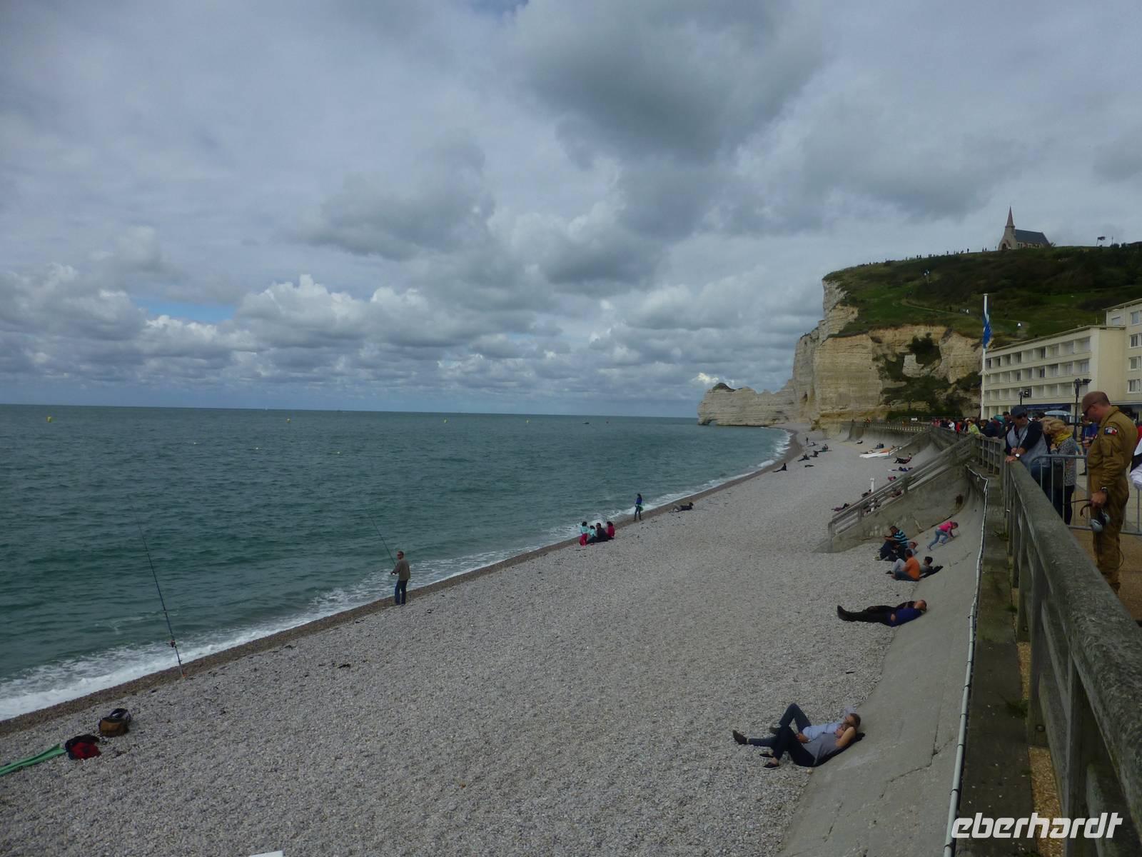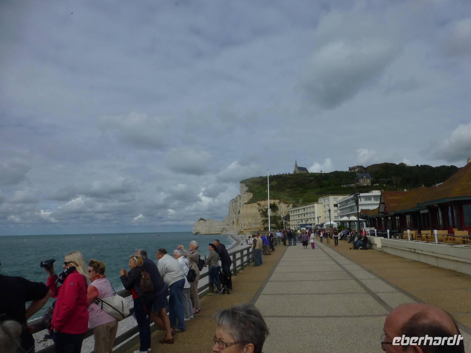 Wir kommen in die Hauptstadt des Polo und des Pferdesports, sehen viele Villen, auch einige im Normannischen Fachwerkbau, und spüren die Luxusgegend. Beim Casino hören wir von Coco Chanel, sahen das Haus ihrer ersten Boutique. Die Stadt steckt inmitten voller Vorbereitung, denn morgen beginnt das Filmfestival des amerikanischen Films. Erwartet werden u.a. Orlando Bloom und Keanu Reeves, der rote Teppich wurde bereits ausgelegt. Wir gehen entlang der wunderschönen Strandpromenade und betrachten die Badehäuschen, die alle Namen der Hollywoodschauspielern und -regisseuren tragen, die Deauville bereits besuchten. Aber unsere Fahrt geht weiter nach Honfleur, ins wohl malerischste Hafenstädtchen der Normandie. Martins bezeichnet den pittoresken alten Hafen als „Disneys Piratenstadtkulisse", wirklich treffend. Ja, Honfleur hat einen ganz besonderen Charme und gilt als Geburtsstätte des Impressionismus. Zum typisch normannischen Mittagessen -mit Cidre- kehren wir in ein kleines Restaurant ein und genießen noch etwas Freizeit zum Bummeln. Nun fahren wir weiter nach Étretat, zu den bekannten Kreidefelsen, die ins Meer ragen. Vom stillen Genießen dieser traumhaften Kulisse hielten uns Proben zu einer Militärflugschau ab, aber wir können uns vorstellen, dass sich viele Künstler inspirieren ließen und lassen.