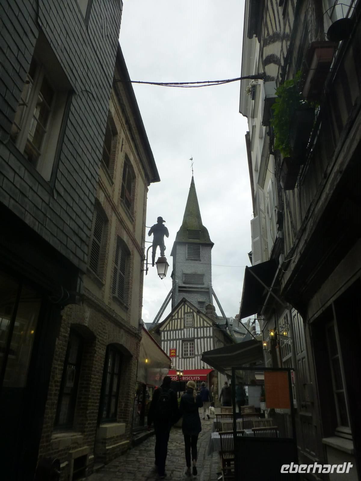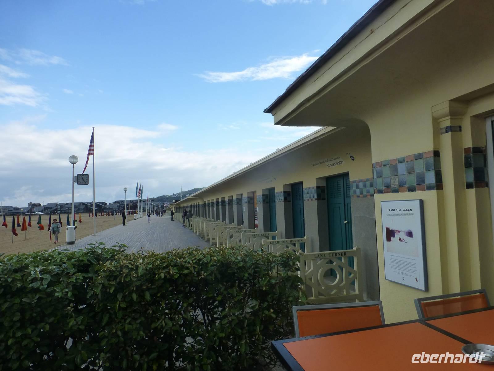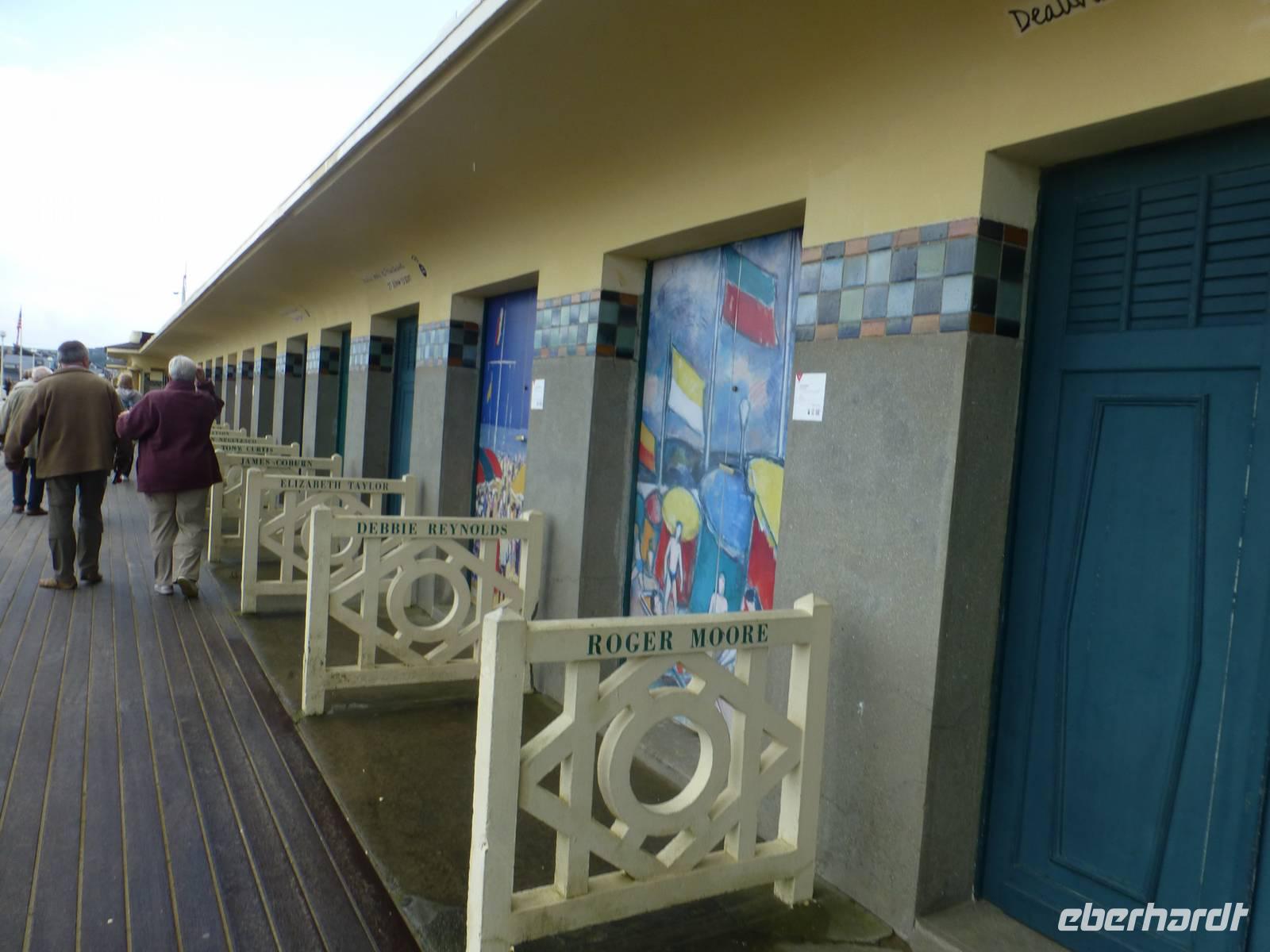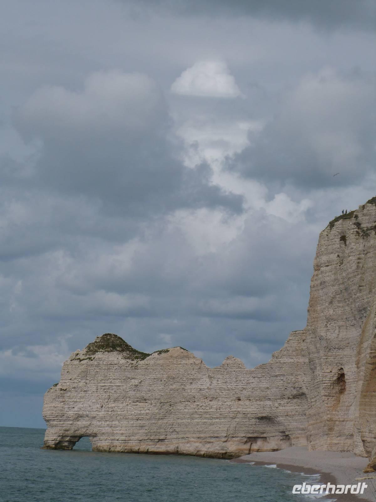 Wir kommen in die Hauptstadt des Polo und des Pferdesports, sehen viele Villen, auch einige im Normannischen Fachwerkbau, und spüren die Luxusgegend. Beim Casino hören wir von Coco Chanel, sahen das Haus ihrer ersten Boutique. Die Stadt steckt inmitten voller Vorbereitung, denn morgen beginnt das Filmfestival des amerikanischen Films. Erwartet werden u.a. Orlando Bloom und Keanu Reeves, der rote Teppich wurde bereits ausgelegt. Wir gehen entlang der wunderschönen Strandpromenade und betrachten die Badehäuschen, die alle Namen der Hollywoodschauspielern und -regisseuren tragen, die Deauville bereits besuchten. Aber unsere Fahrt geht weiter nach Honfleur, ins wohl malerischste Hafenstädtchen der Normandie. Martins bezeichnet den pittoresken alten Hafen als „Disneys Piratenstadtkulisse", wirklich treffend. Ja, Honfleur hat einen ganz besonderen Charme und gilt als Geburtsstätte des Impressionismus. Zum typisch normannischen Mittagessen -mit Cidre- kehren wir in ein kleines Restaurant ein und genießen noch etwas Freizeit zum Bummeln. Nun fahren wir weiter nach Étretat, zu den bekannten Kreidefelsen, die ins Meer ragen. Vom stillen Genießen dieser traumhaften Kulisse hielten uns Proben zu einer Militärflugschau ab, aber wir können uns vorstellen, dass sich viele Künstler inspirieren ließen und lassen.