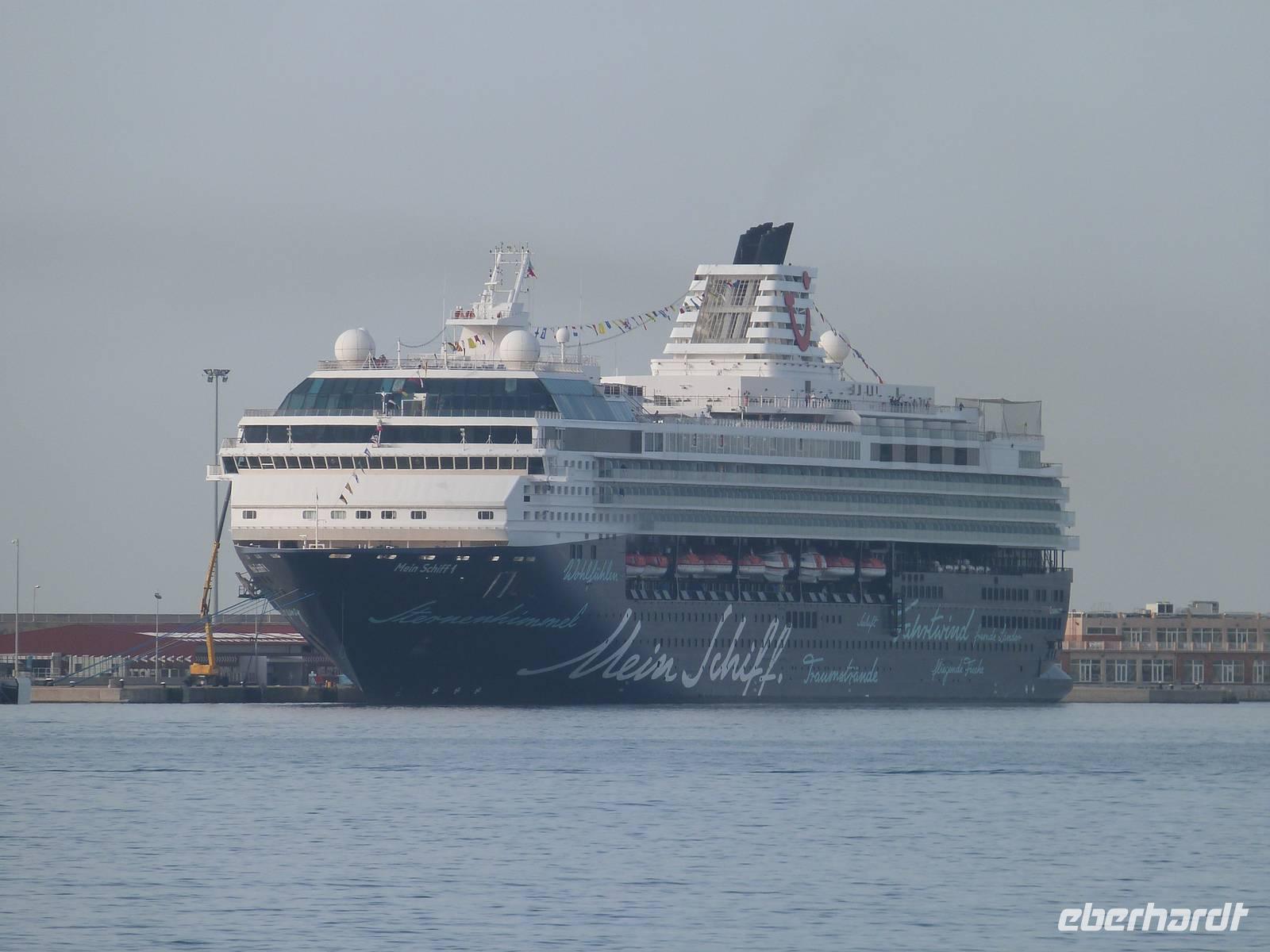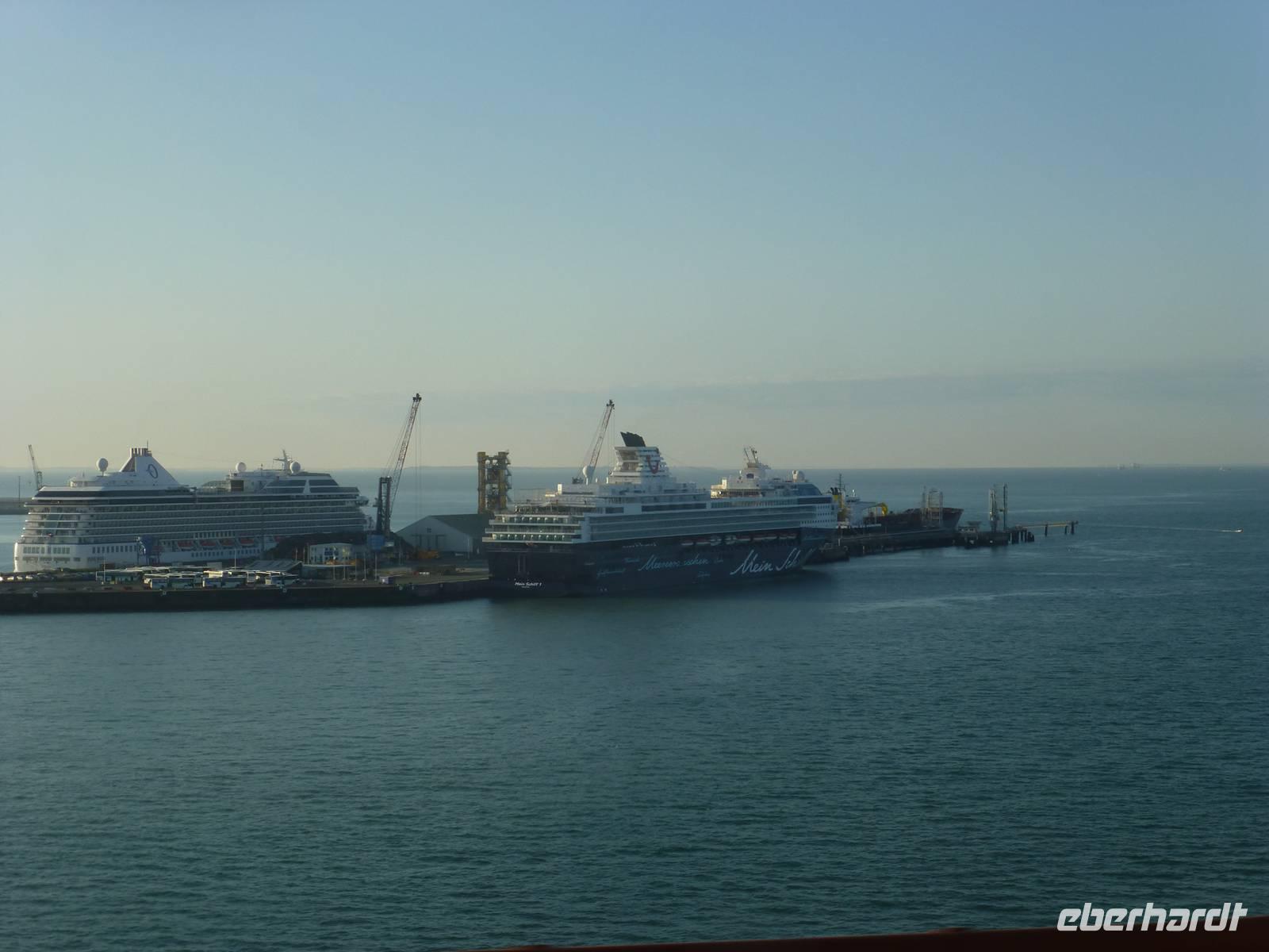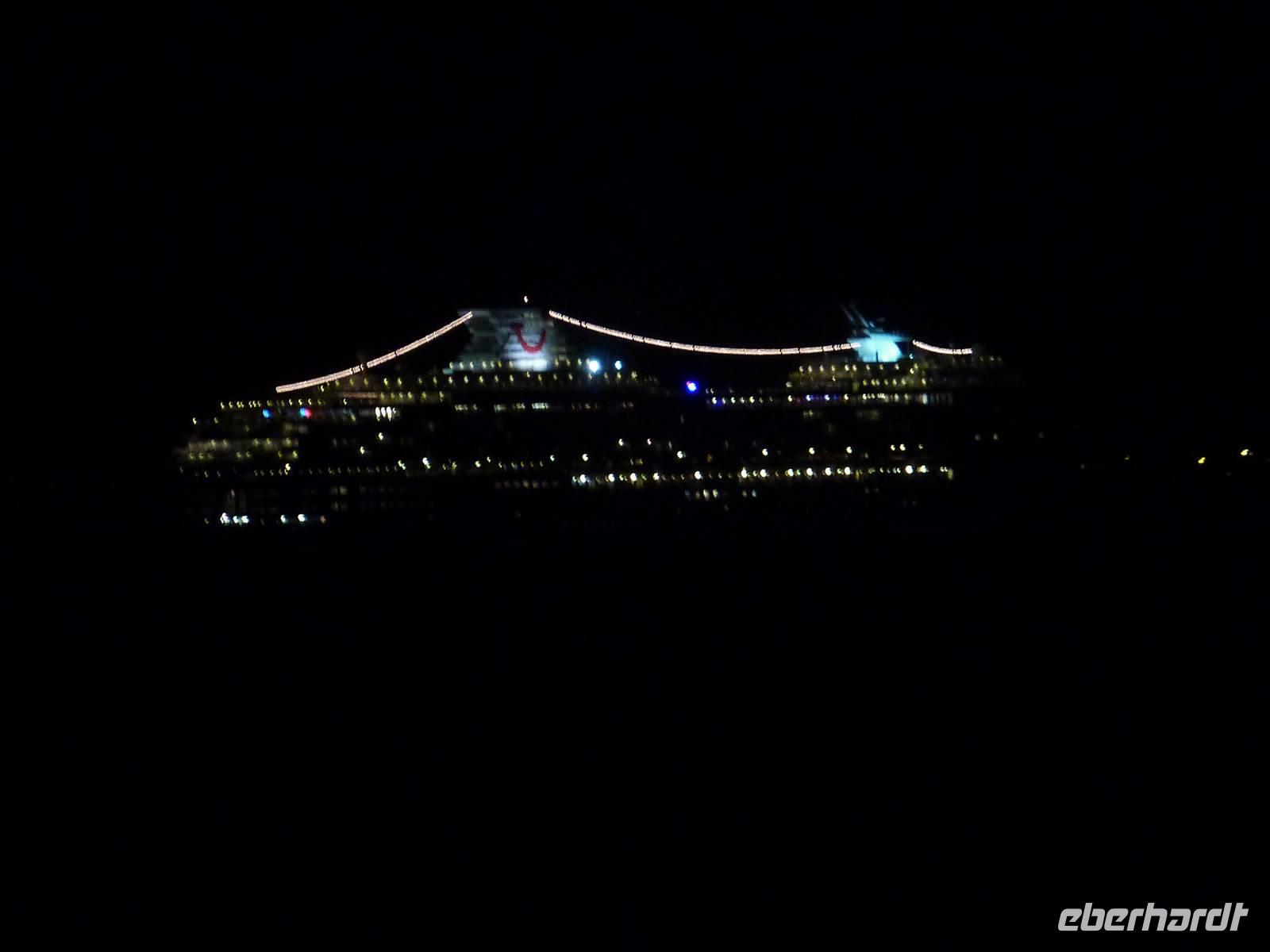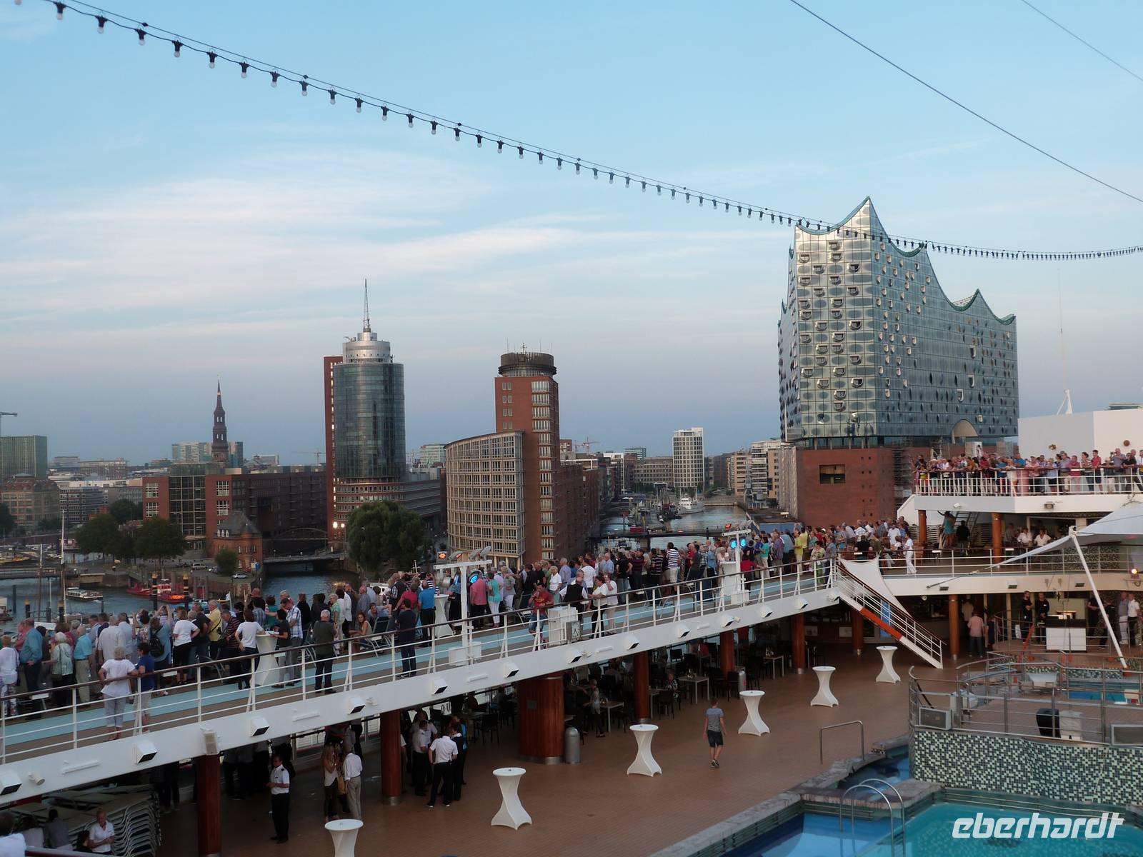 Am Morgen starten wir per Bus am Dresdner Flughafen gut gelaunt Richtung Norden. In Nossen, in Döbeln, am Leipziger Flughafen, in Michendorf und am Linumer Bruch steigen Gäste zu bevor wir unsere Fahrt nach Hamburg fortsetzen. Von unseren zwei Chauffeuren werden wir zum neuen Hamburg Cruise Center in der Hafencity gebracht. Hier erwartet uns bereits die Mein Schiff 1, das erste Schiff der TUI Cruises Wohlfühlflotte, und wir werden begrüßt. Ohne langes Warten geht es an Bord. Wir erhalten unsere Bordkarte, die nun für uns Kabinenschlüssel, Kreditkarte und Landgangskarte zugleich ist. Die Koffer werden aus dem Bus zu unserer Kabine gebracht. Gleich beginnt auch die Seenotrettungsübung, die für alle Gäste an Bord Pflicht ist. Jeder Passagier findet sich bei seinem Sammelplatz, Musterstation genannt, ein und das Verhalten im Notfall wird besprochen. Auch der Weg zum Rettungsboot wird geübt. Nun können wir endlich ablegen. Auf dem Pool-Deck verfolgen die Gäste das eindrucksvolle Auslaufen der Mein Schiff 1. Hafencity, Elbphilharmonie, Michel und Landungsbrücken grüßen zum Abschied, uns und auch das Schiff. Für dieses Jahr war es das letzte Mal in Hamburg, zum Überwintern geht es nun ins Mittelmeer und später über Arabien nach Asien. Noch auf dem Weg auf der Elbe zur Nordsee beobachten wir Wetterleuchten. Wir genießen das Abendessen und ziehen wir uns auf unsere Kabinen zurück.