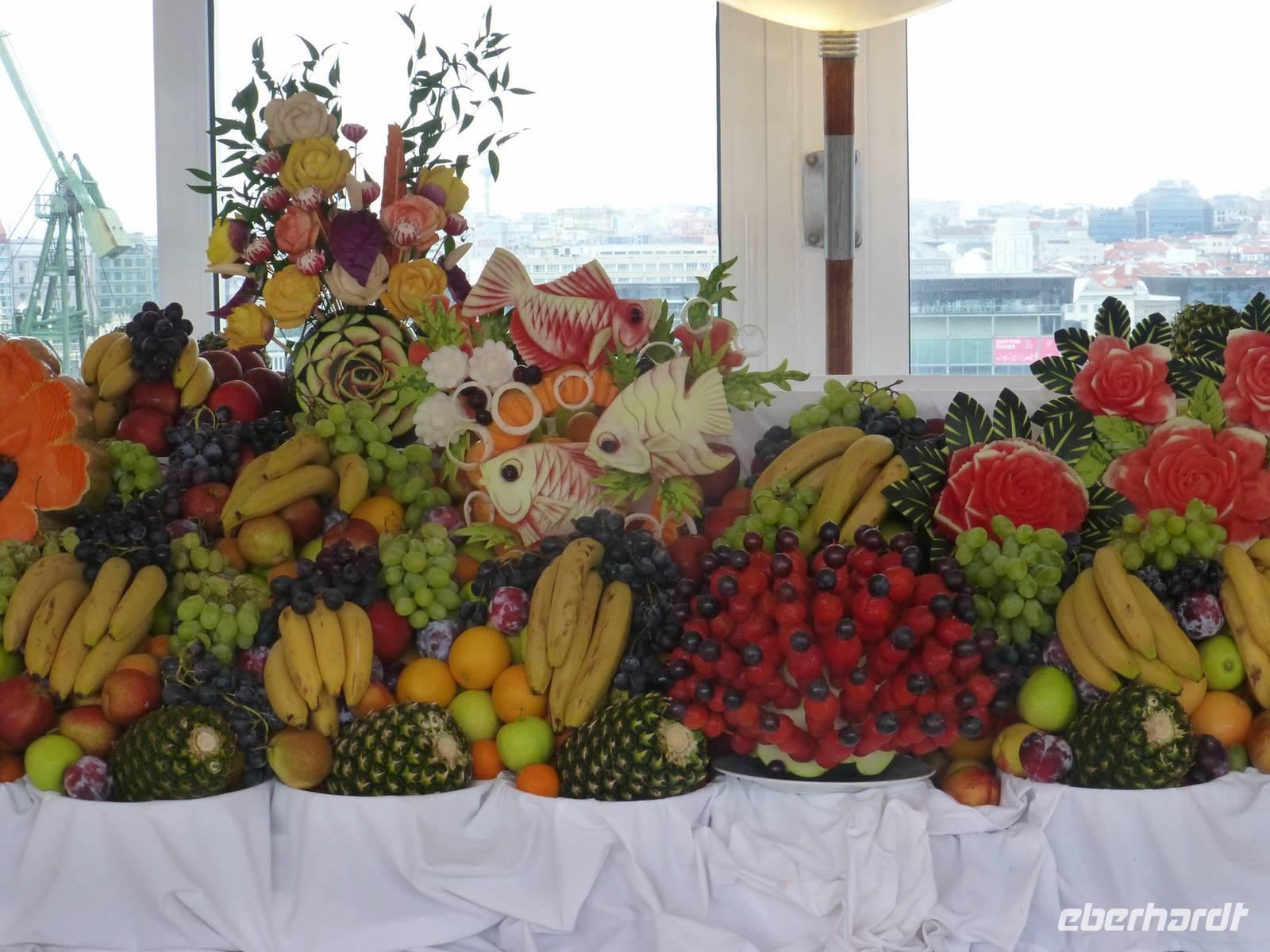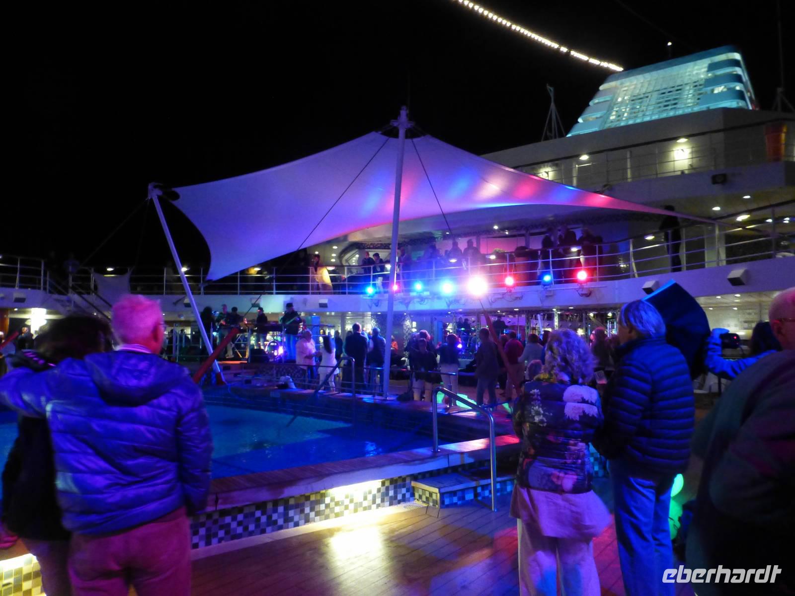 Nach dem Abendessen wird zur Poolparty mit opulentem Schokoladenfrüchtebuffet und Live-Musik eingeladen.