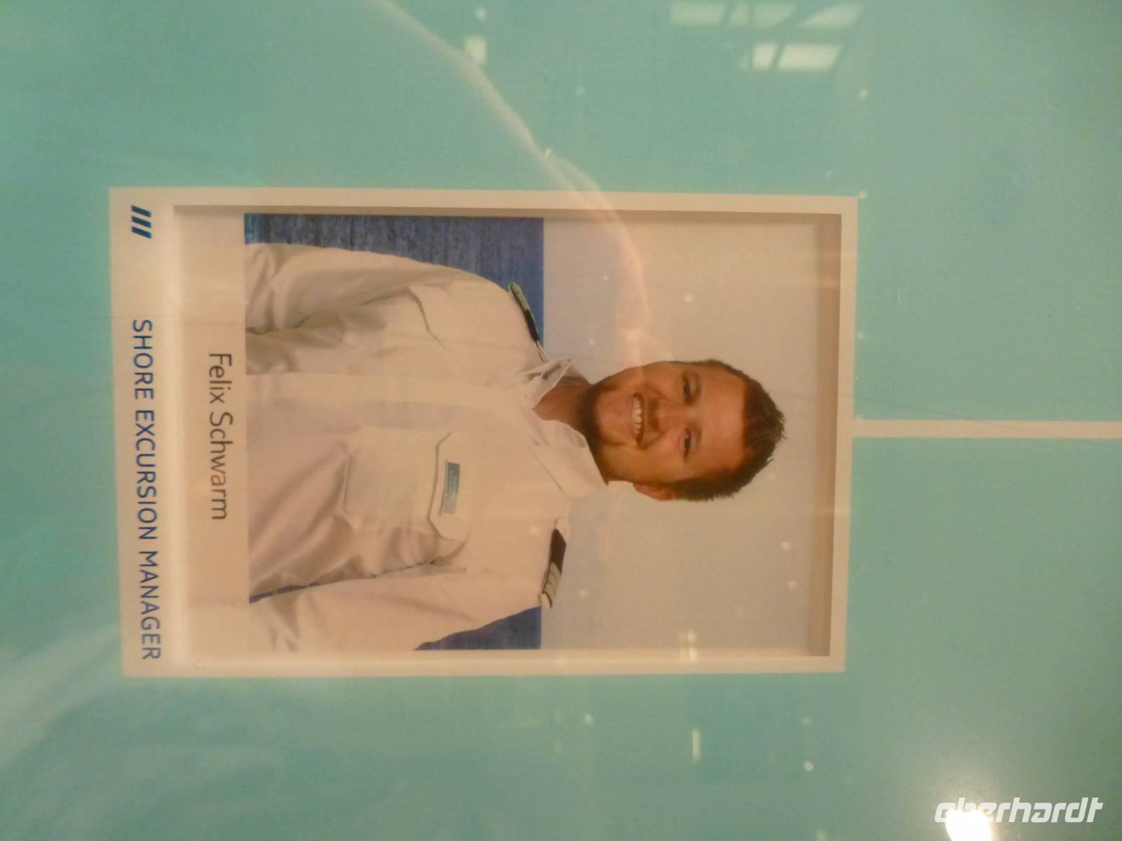 Am Abend nach der Show Rondo Veneziano verabschiedet sich die Besatzung sehr eindrucksvoll. Auf der Theaterbühne stehen von den Offizieren einschließlich Hotel-Manager und Kreuzfahrtdirektor sämtliche Mitarbeiter von Security, Restaurants und Bars, Küche, Rezeption, Tour- und Bikeguides, Spa&Sport, Entertainment sowie Housekeeping; ein schöner, gelungener Abschied!