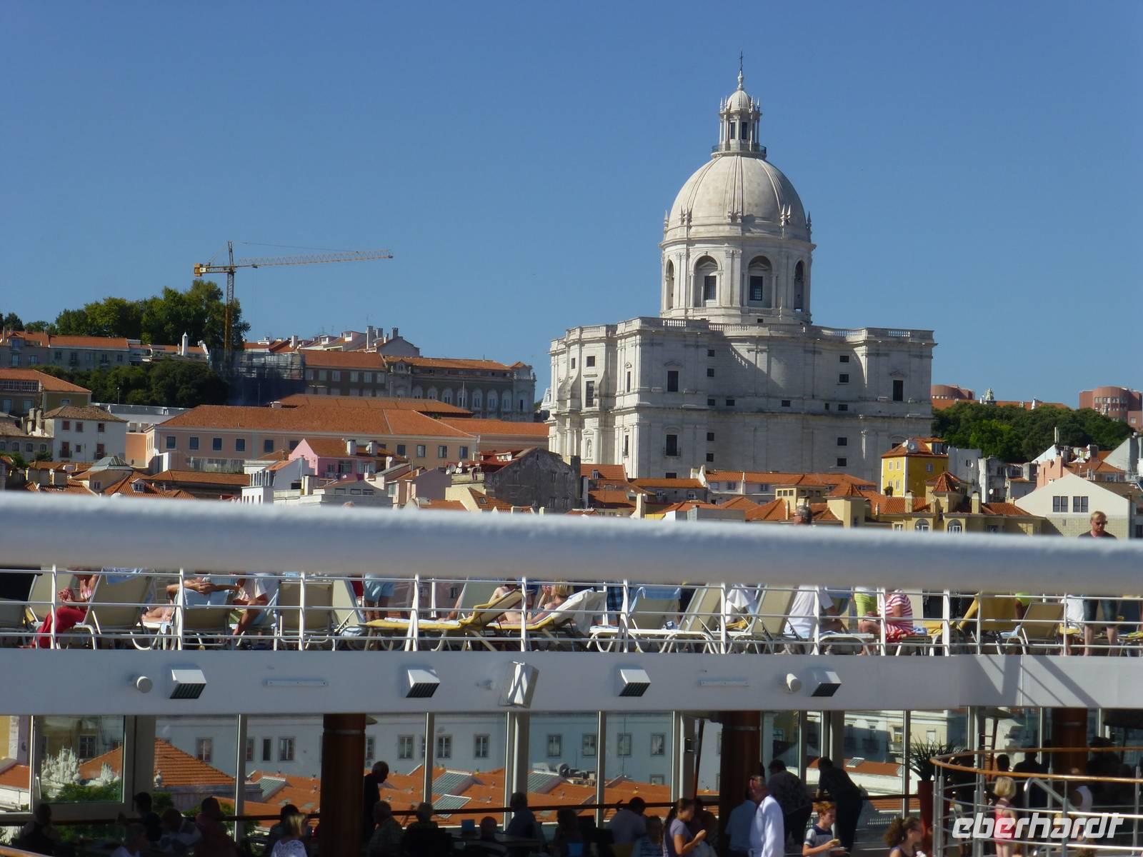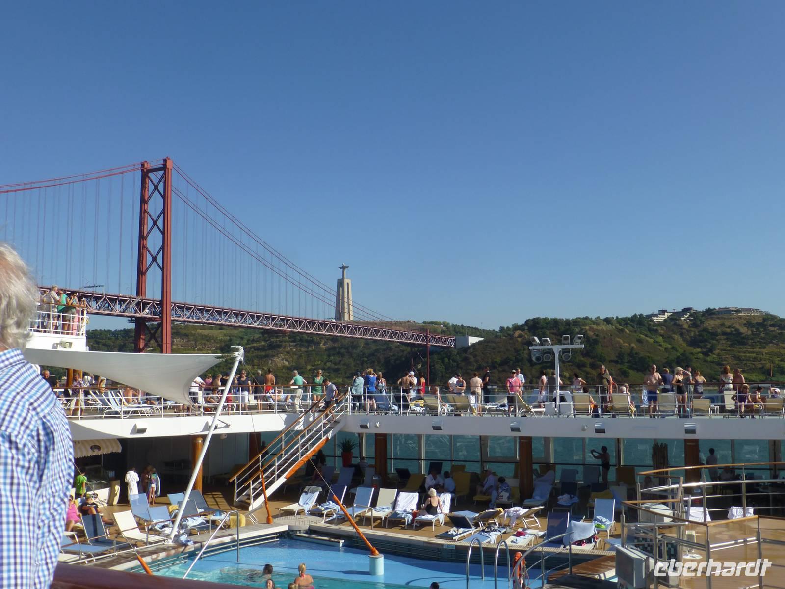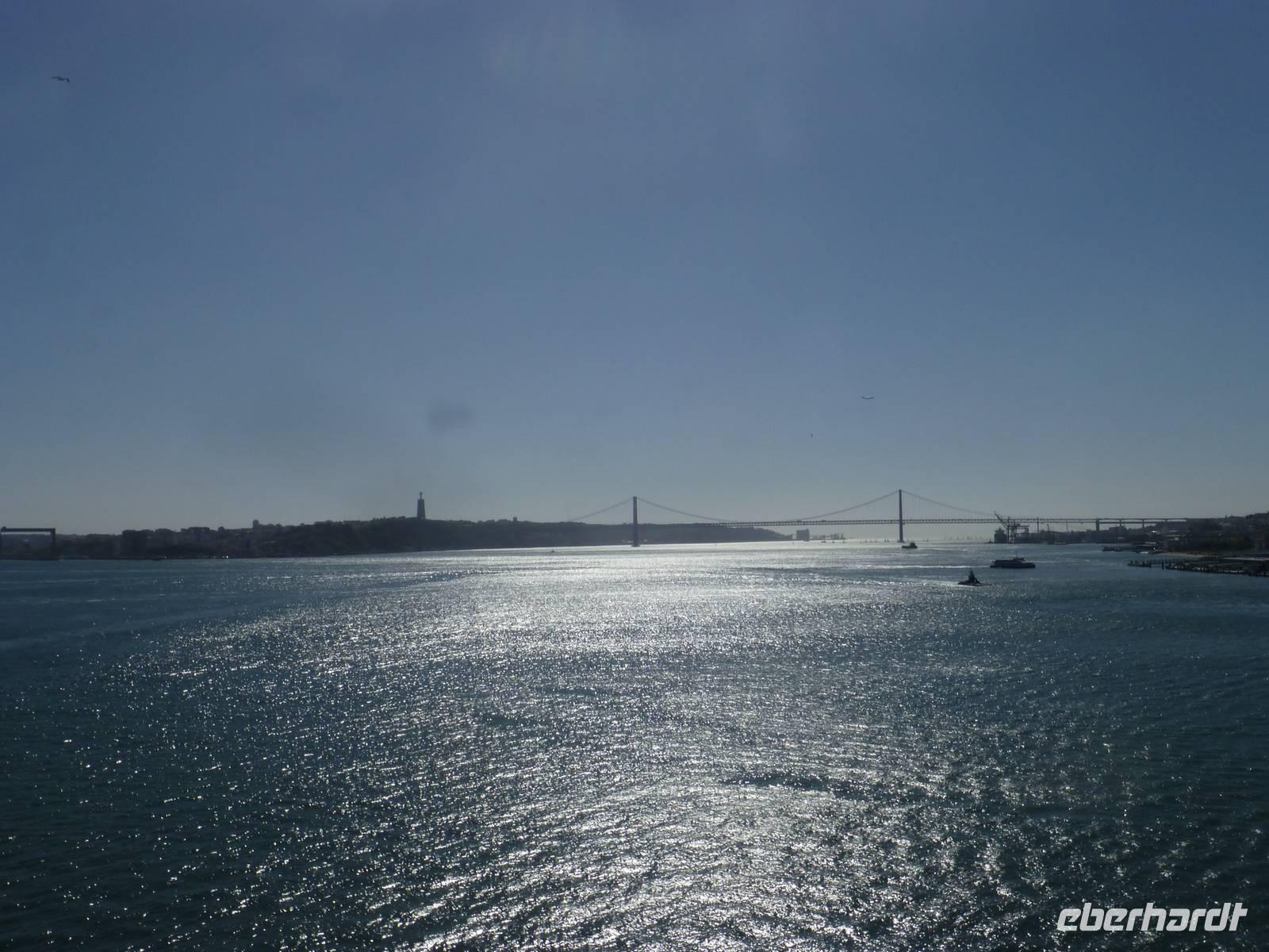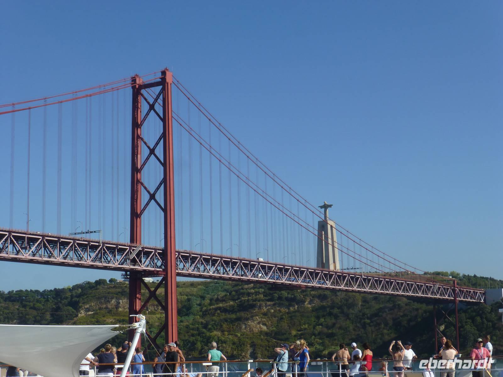 Auf unserem Ausflug wollen wir die Höhepunkte Lissabons erleben, wir fahren mit dem Bus zum eindrucksvollen Torre de Belém, laufen zum monumentalen Entdeckerdenkmal Heinrich des Seefahrers und zum imposanten Hieronymuskloster mit dem Grab von Vasco da Gama. Von hier geht es wieder mit dem Bus zur Altstadt, die Straßen sind voll, immer wieder bleiben wir im Stau stecken. Also erkunden wir nun zu Fuß die schmalen Gassen der verwinkelten Altstadt Alfama. Beeindruckt sehen wir die nostalgische Straßenbahn, die sich die Hügel hinauf kämpft. Irgendwie immer präsent grüßt unser MeinSchiff1 unten vom Hafen. Das Auslaufen am Nachmittag wird mit Kommentaren vom Lektor zu den Sehenswürdigkeiten begleitet und von hunderten Gästen auf dem Sonnendeck fasziniert verfolgt. So passieren wir die bekannte Brücke des 25. Aprils, eine der längsten Hängebrücken der Welt, und erleben dabei das angekündigte Bienenkorbsummen. Auf der gegenüberliegenden Uferseite grüßt die Christus-Statue. Wir verlassen die Tejo-Bucht und damit auch Portugal.