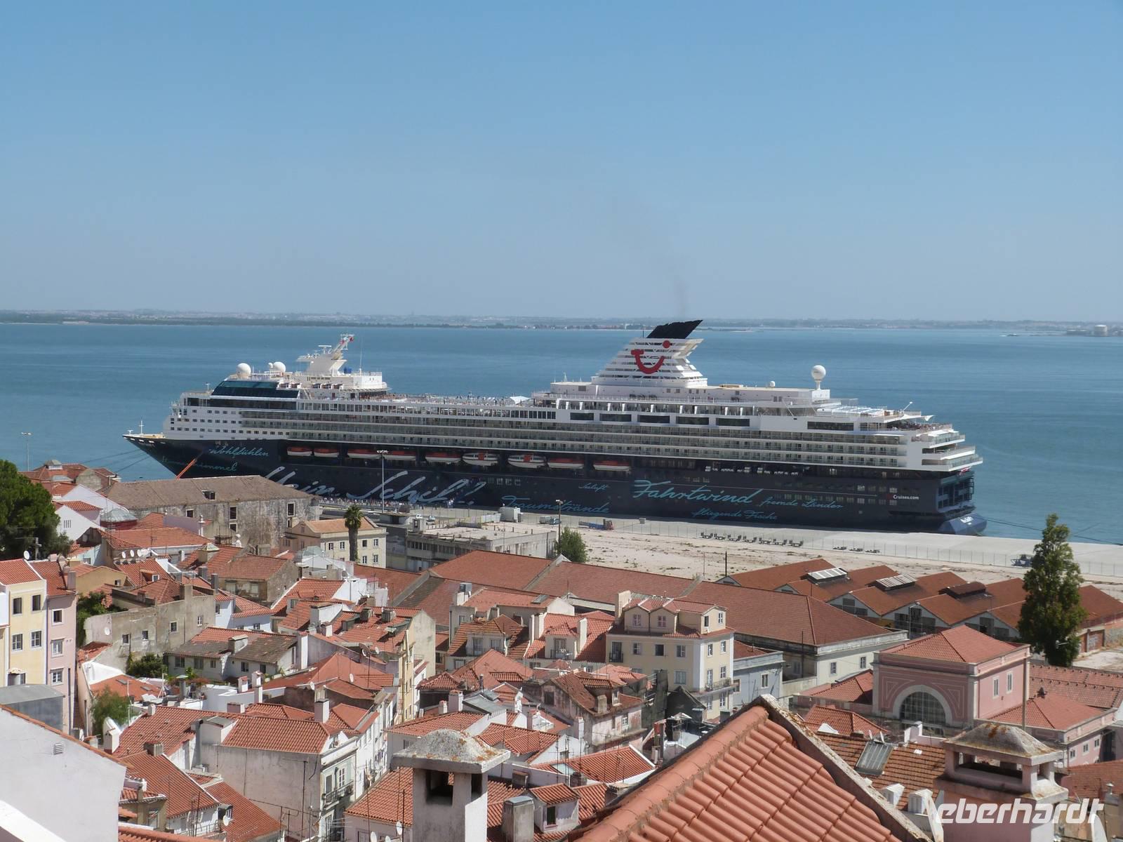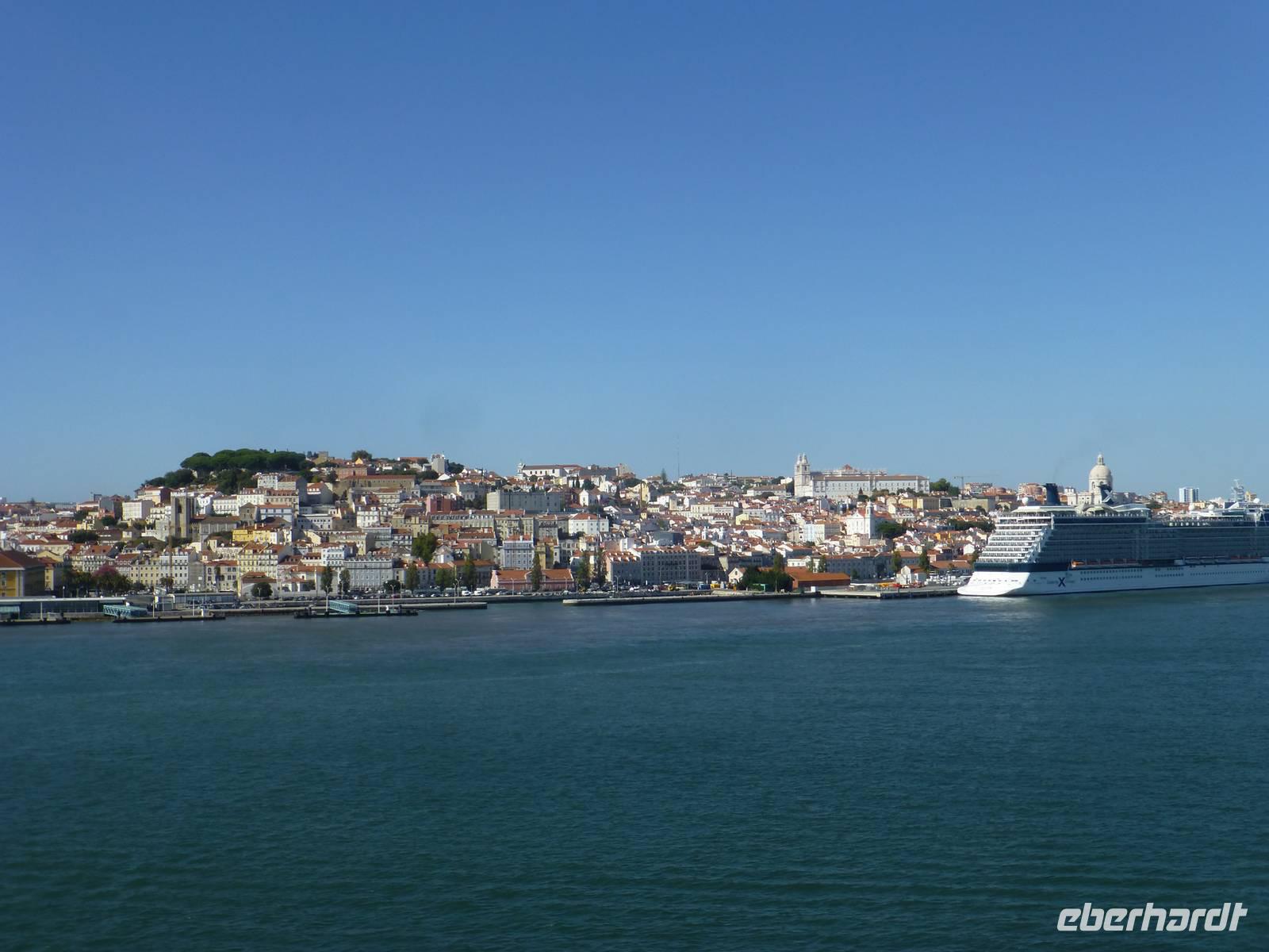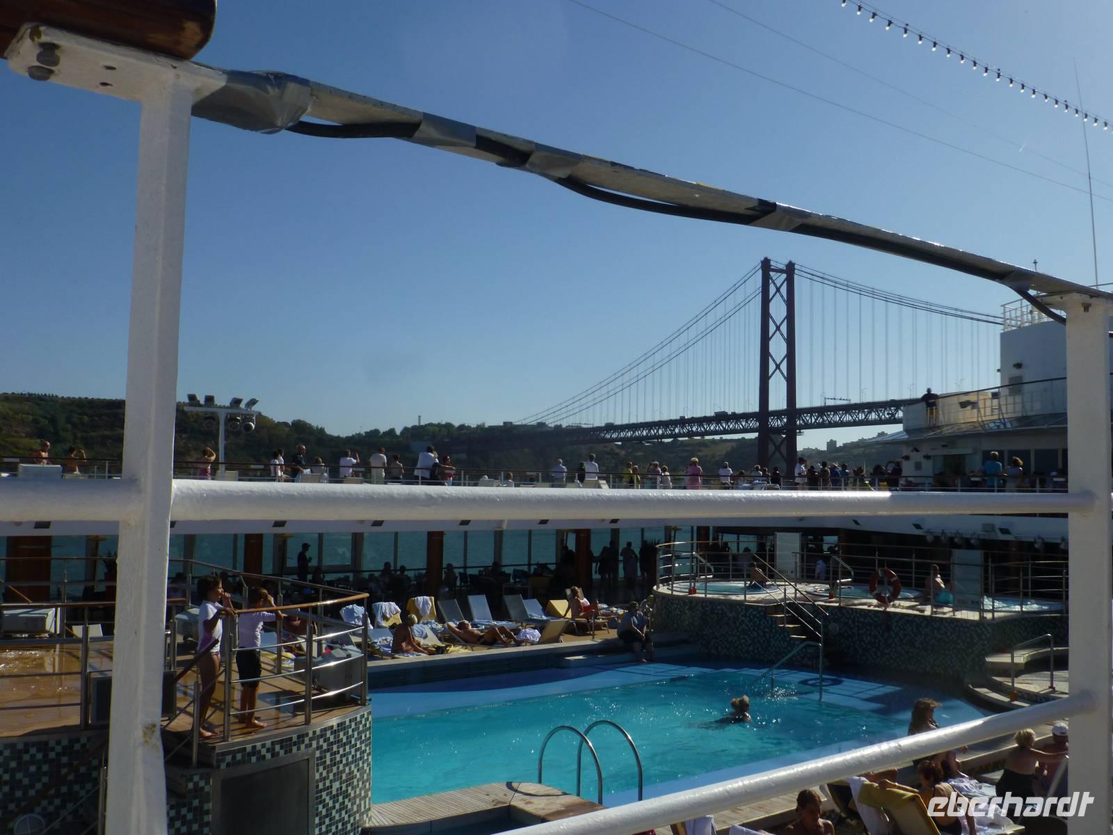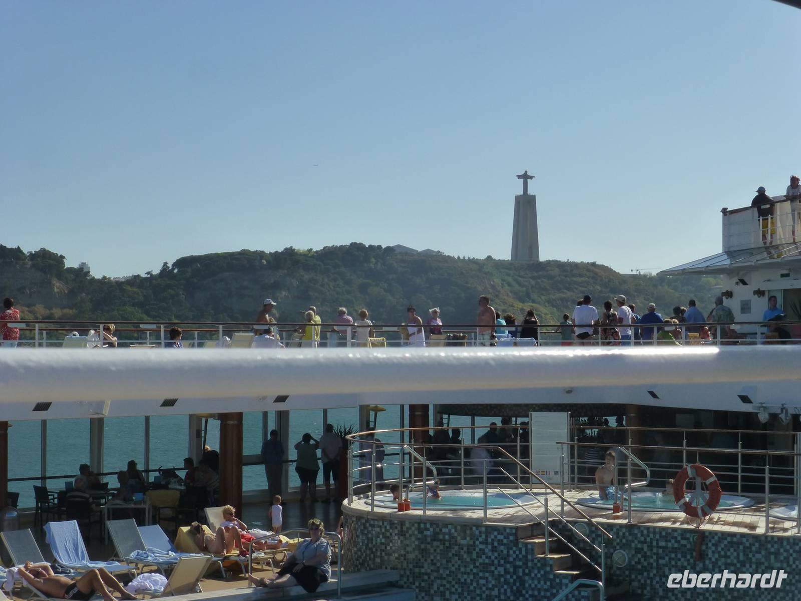 Auf unserem Ausflug wollen wir die Höhepunkte Lissabons erleben, wir fahren mit dem Bus zum eindrucksvollen Torre de Belém, laufen zum monumentalen Entdeckerdenkmal Heinrich des Seefahrers und zum imposanten Hieronymuskloster mit dem Grab von Vasco da Gama. Von hier geht es wieder mit dem Bus zur Altstadt, die Straßen sind voll, immer wieder bleiben wir im Stau stecken. Also erkunden wir nun zu Fuß die schmalen Gassen der verwinkelten Altstadt Alfama. Beeindruckt sehen wir die nostalgische Straßenbahn, die sich die Hügel hinauf kämpft. Irgendwie immer präsent grüßt unser MeinSchiff1 unten vom Hafen. Das Auslaufen am Nachmittag wird mit Kommentaren vom Lektor zu den Sehenswürdigkeiten begleitet und von hunderten Gästen auf dem Sonnendeck fasziniert verfolgt. So passieren wir die bekannte Brücke des 25. Aprils, eine der längsten Hängebrücken der Welt, und erleben dabei das angekündigte Bienenkorbsummen. Auf der gegenüberliegenden Uferseite grüßt die Christus-Statue. Wir verlassen die Tejo-Bucht und damit auch Portugal.