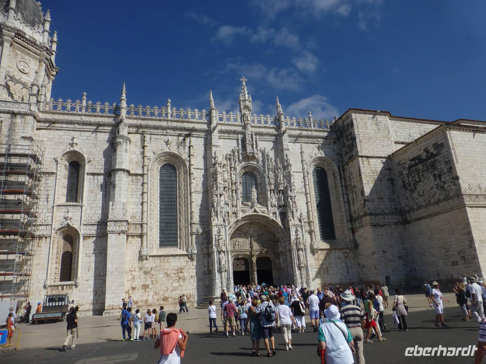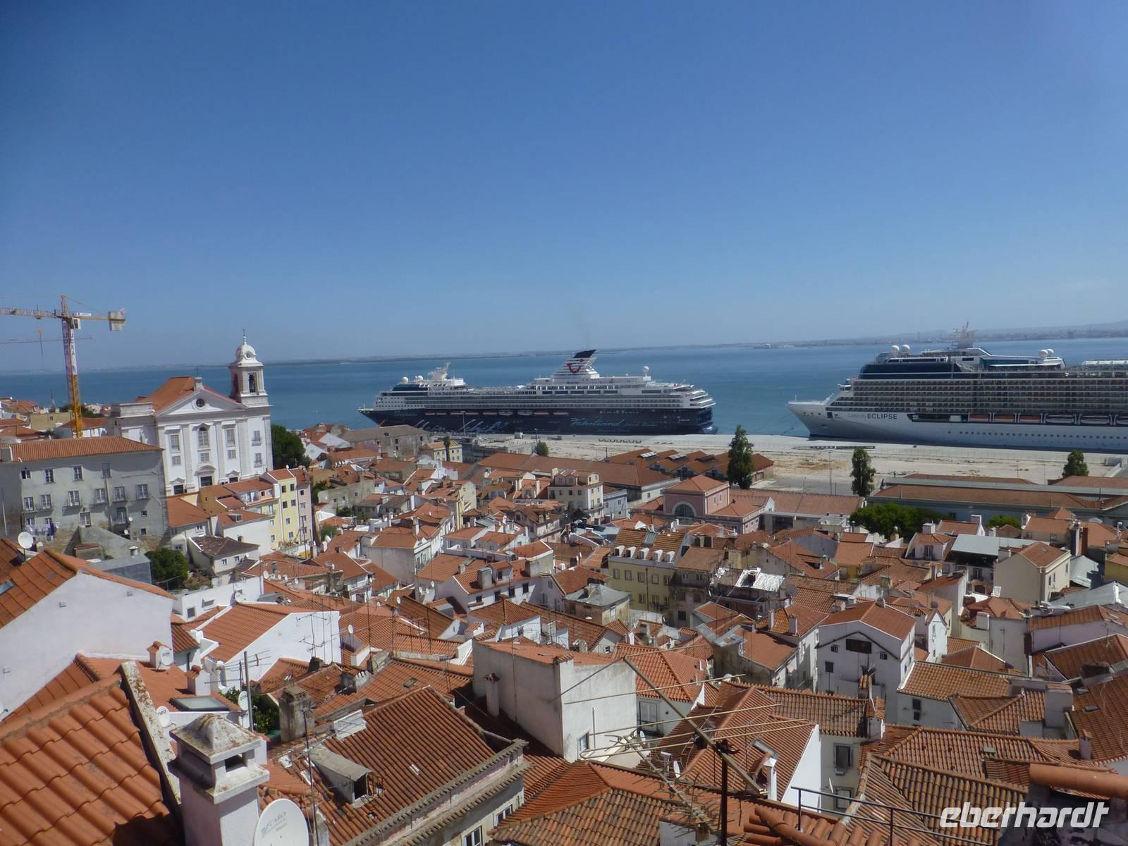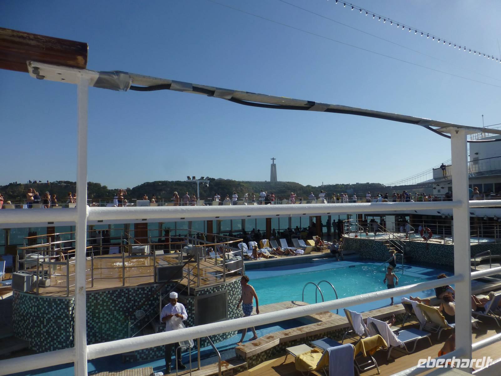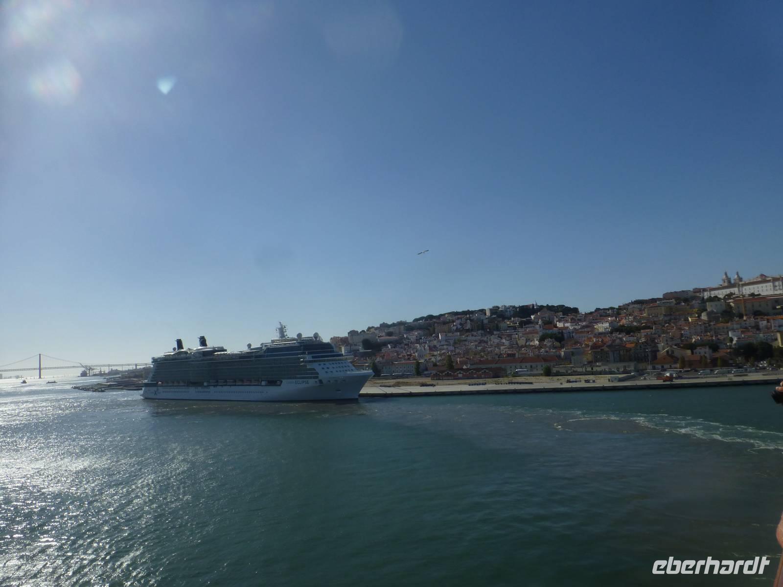 Auf unserem Ausflug wollen wir die Höhepunkte Lissabons erleben, wir fahren mit dem Bus zum eindrucksvollen Torre de Belém, laufen zum monumentalen Entdeckerdenkmal Heinrich des Seefahrers und zum imposanten Hieronymuskloster mit dem Grab von Vasco da Gama. Von hier geht es wieder mit dem Bus zur Altstadt, die Straßen sind voll, immer wieder bleiben wir im Stau stecken. Also erkunden wir nun zu Fuß die schmalen Gassen der verwinkelten Altstadt Alfama. Beeindruckt sehen wir die nostalgische Straßenbahn, die sich die Hügel hinauf kämpft. Irgendwie immer präsent grüßt unser MeinSchiff1 unten vom Hafen. Das Auslaufen am Nachmittag wird mit Kommentaren vom Lektor zu den Sehenswürdigkeiten begleitet und von hunderten Gästen auf dem Sonnendeck fasziniert verfolgt. So passieren wir die bekannte Brücke des 25. Aprils, eine der längsten Hängebrücken der Welt, und erleben dabei das angekündigte Bienenkorbsummen. Auf der gegenüberliegenden Uferseite grüßt die Christus-Statue. Wir verlassen die Tejo-Bucht und damit auch Portugal.