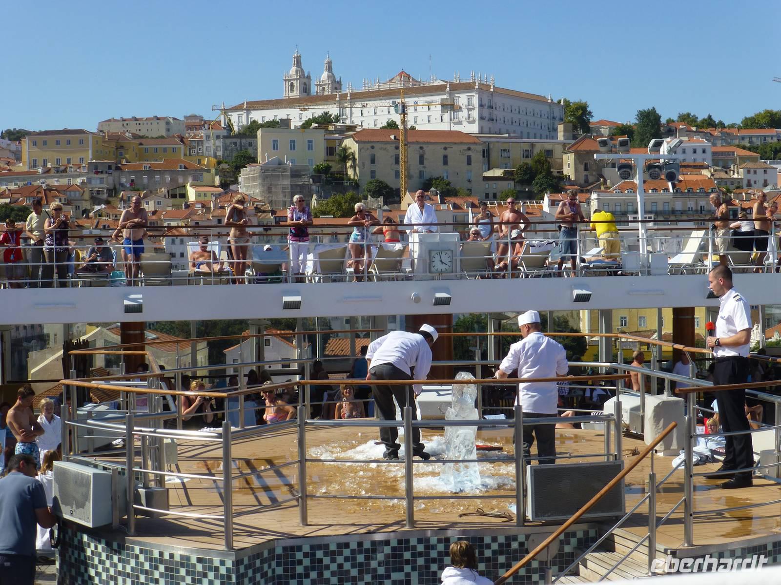 Unser heutiger Schiffstag hat sogar 25 Stunden, die Borduhr wurde wieder eine Stunde zurückgestellt. Langeweile gibt es an Bord nicht, für Unterhaltung und Bildung ist gesorgt. Im Theater findet eine unterhaltsame nautische Fragestunde mit dem Kapitän und einem seiner Offiziere sowie dem Kreuzfahrtdirektor statt. Über Mittag heißt es im Restaurant Atlantik „Artistik und Modenschau". Der Lektor hält seinen Vortrag über Lissabon. Abends geben die Herren von Sixpack im restlos gefüllten Theater ihre zweite Vorstellung.