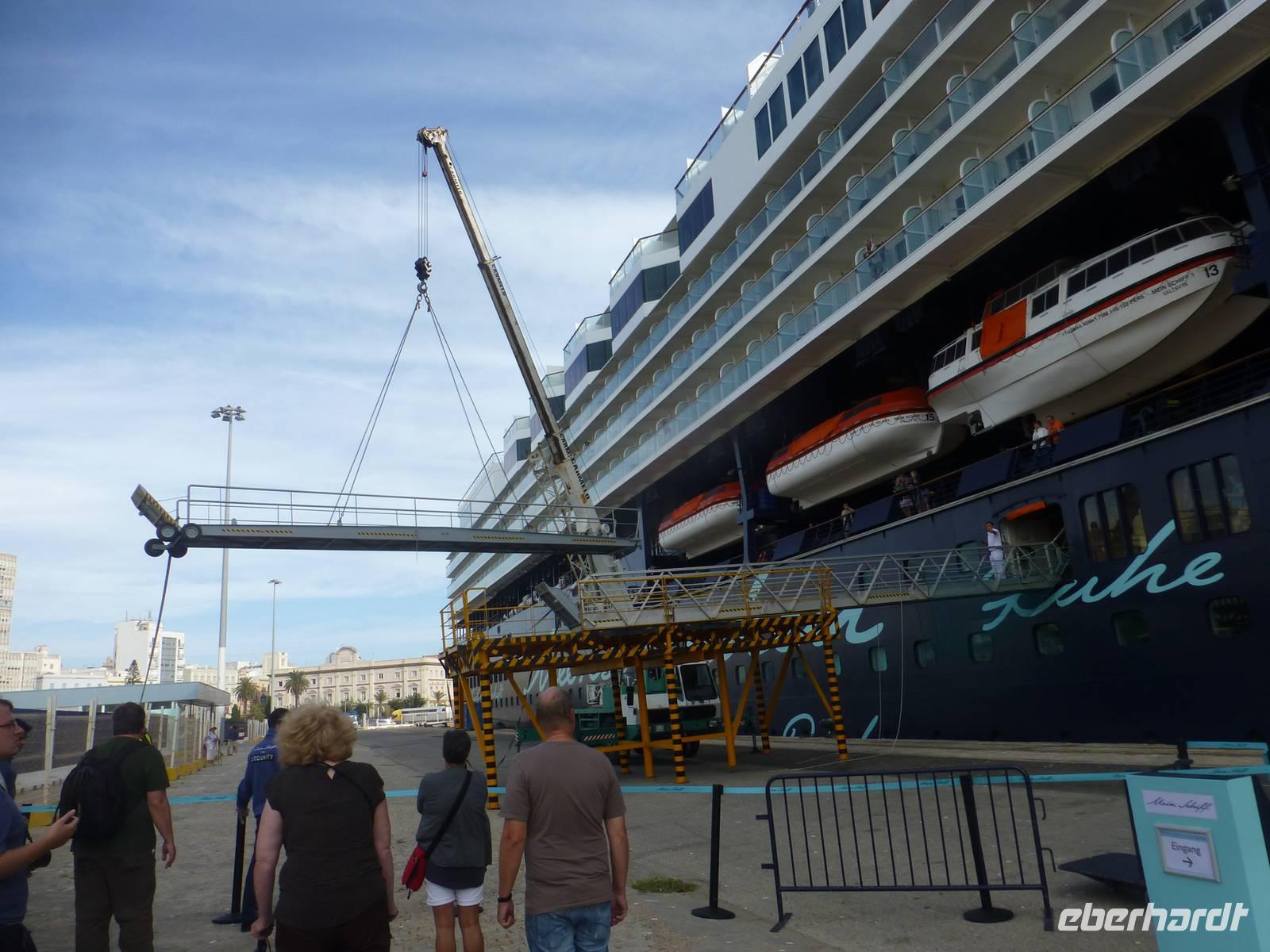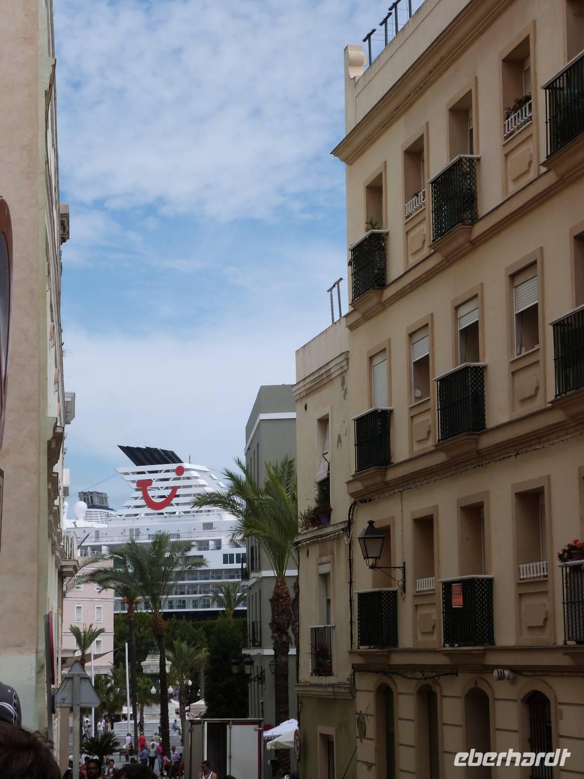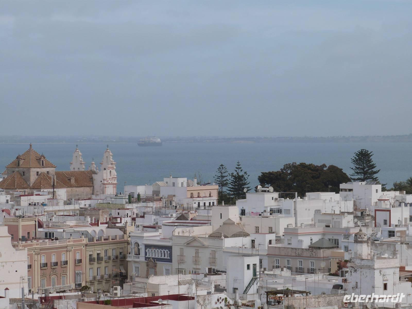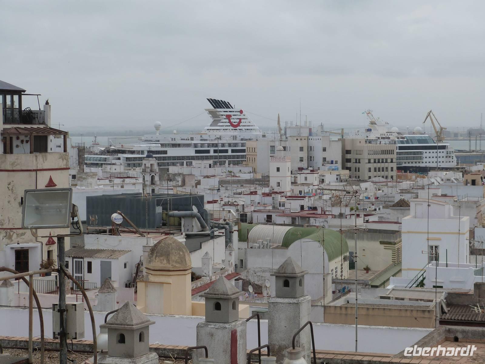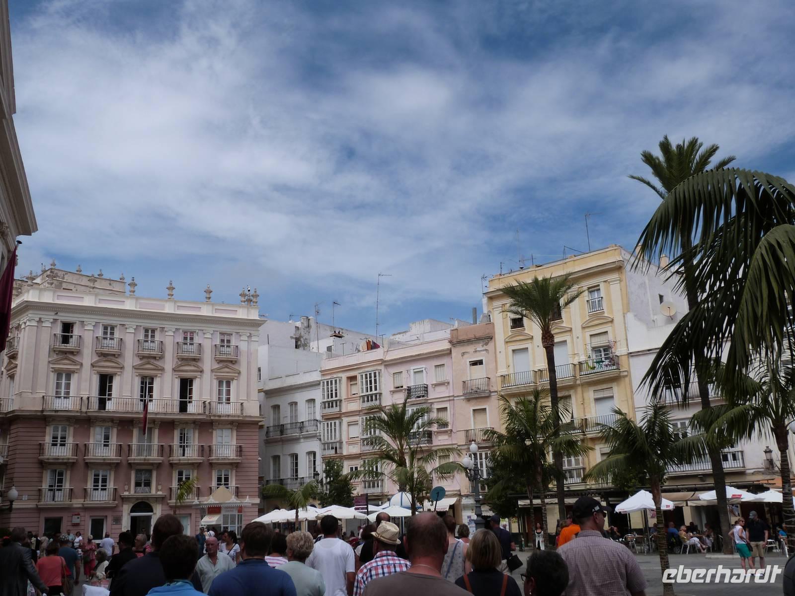 Diese Nacht wurde die Uhr wieder eine Stunde vorgestellt, also sind wir wieder in unserer Zeit. Wir beobachten das Einfahren und das Anlegen, unser Liegeplatz ist fast „direkt am Marktplatz" von Cadiz, Spaniens älteste Stadt. Diese wollen wir heute zu Fuß erlaufen, eine örtliche Gästeführerin erwartet uns. Gleich wird es auch historisch: hier wurde erste spanische, liberal orientierte Verfassung ausgearbeitet, ein monumentales Verfassungsdenkmal und ein Museum erinnert daran. Wir besteigen den Turm Torre Tavira, der höchste Punkt der Stadt. 180 Treppen steigen wir auf bis zur Dachterrasse und nun bekommen wir noch eine Stadtführung ganz besonderer Art: mit der Camera Obscura, einem von da Vinci entwickelten Spiegelsystem, erfahren und erleben wir, selbst unentdeckt, einen herrlichen Ausblick auf die Dächer, Gebäude und Straßen sowie die Menschen in der Stadt. Unterwegs probieren wir Churros, eine regionale Gebäckspezialität. Nun sehen wir noch die Kathedrale, das Rathaus, viele kleine Gassen und wunderschöne Plätze.