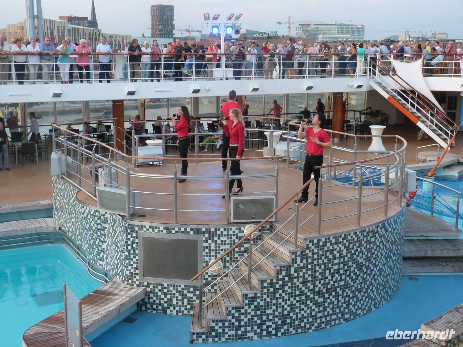 So erleben wir tolle internationale Gesangs- und Tanzbeiträge der Besatzungsmitglieder, so Mary-Ann von der Sicherheit, die vierköpfige Band einer Kabine oder die fleißigen Küchen-, Restaurant-, Bars- und Housekeepingjungs.