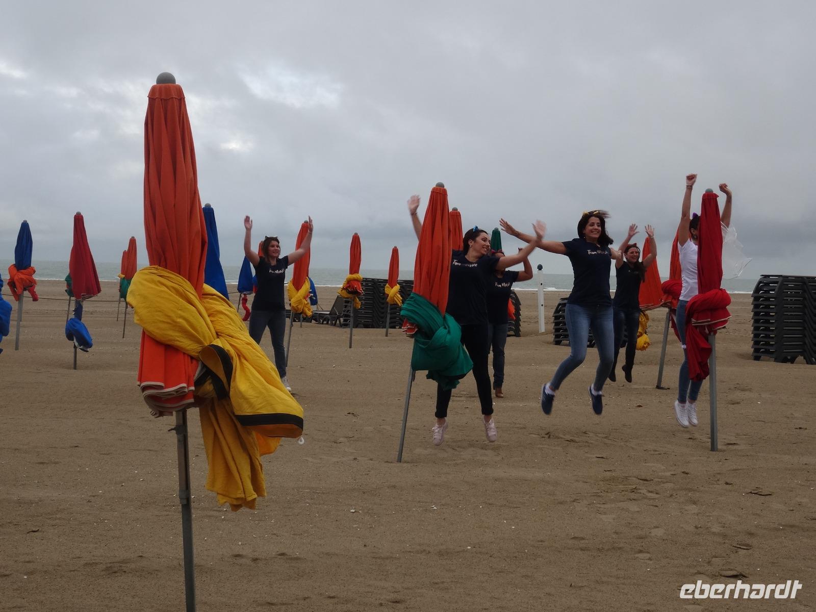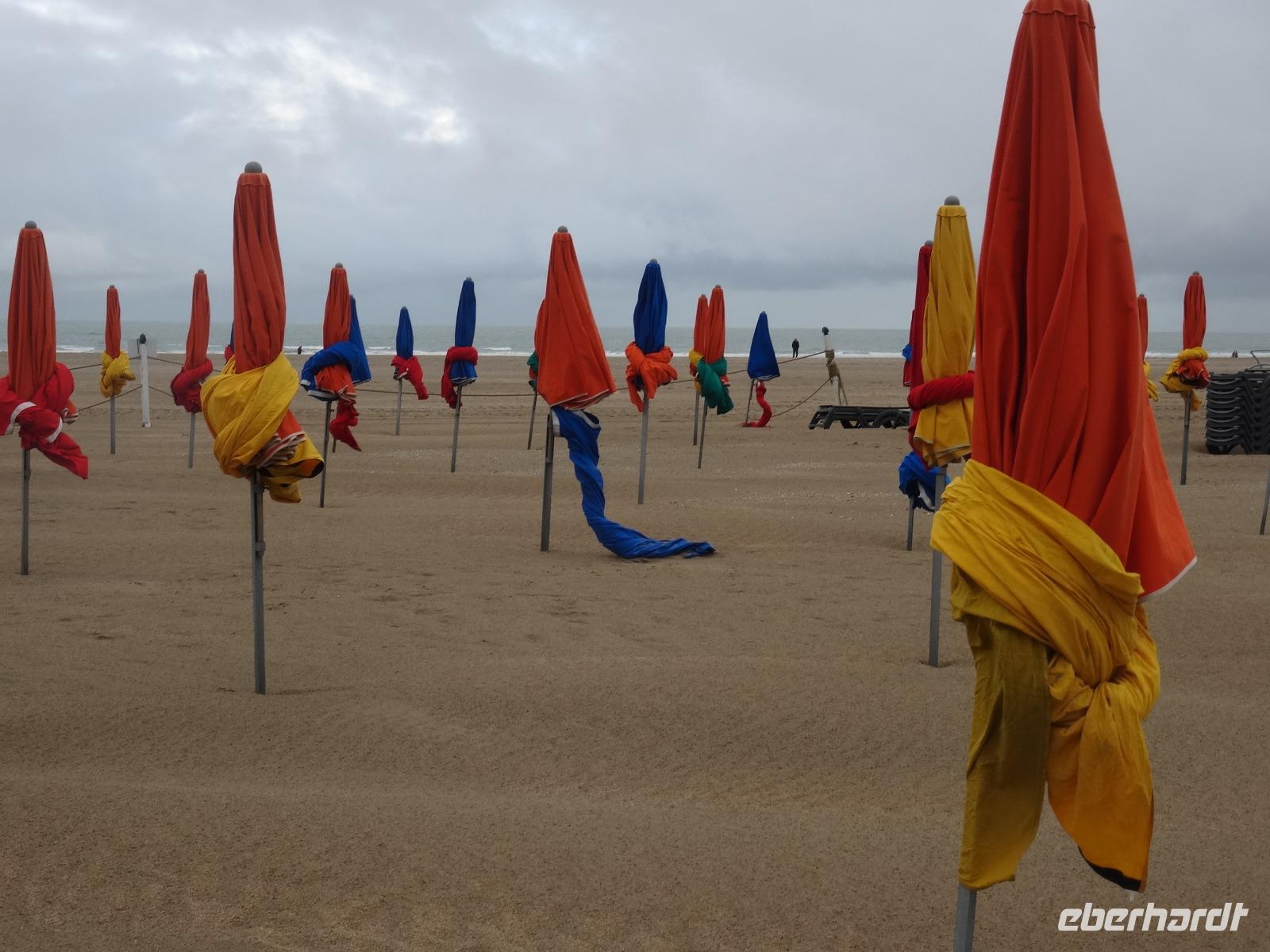 Wir bummelten am Strand entlang, welcher durch die farbigen markanten Sonnenschirme ein tolles Fotomotiv bot. Dabei lief uns jedoch kein bekanntes Gesicht über den Weg, obwohl wir die Augen offen hielten. Wahrscheinlich war auch heute das Wetter nicht danach, denn es regnete immer wieder leicht.