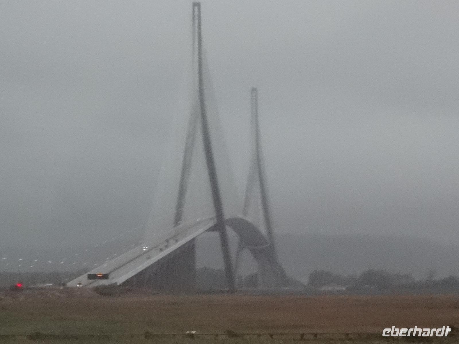 Die örtliche Reiseleiterin Katrin sowie Busfahrer Regis nahmen uns am Hafen in Empfang und starteten in Richtung Westen. Das erste Highlight passierten wir wenig später mit der Überquerung der "Pont de Normandie", der mit 2141 Metern (zweitlängsten der Welt) Schrägseilbrücke über die Seine, welche hier in den Ärmelkanal mündet.