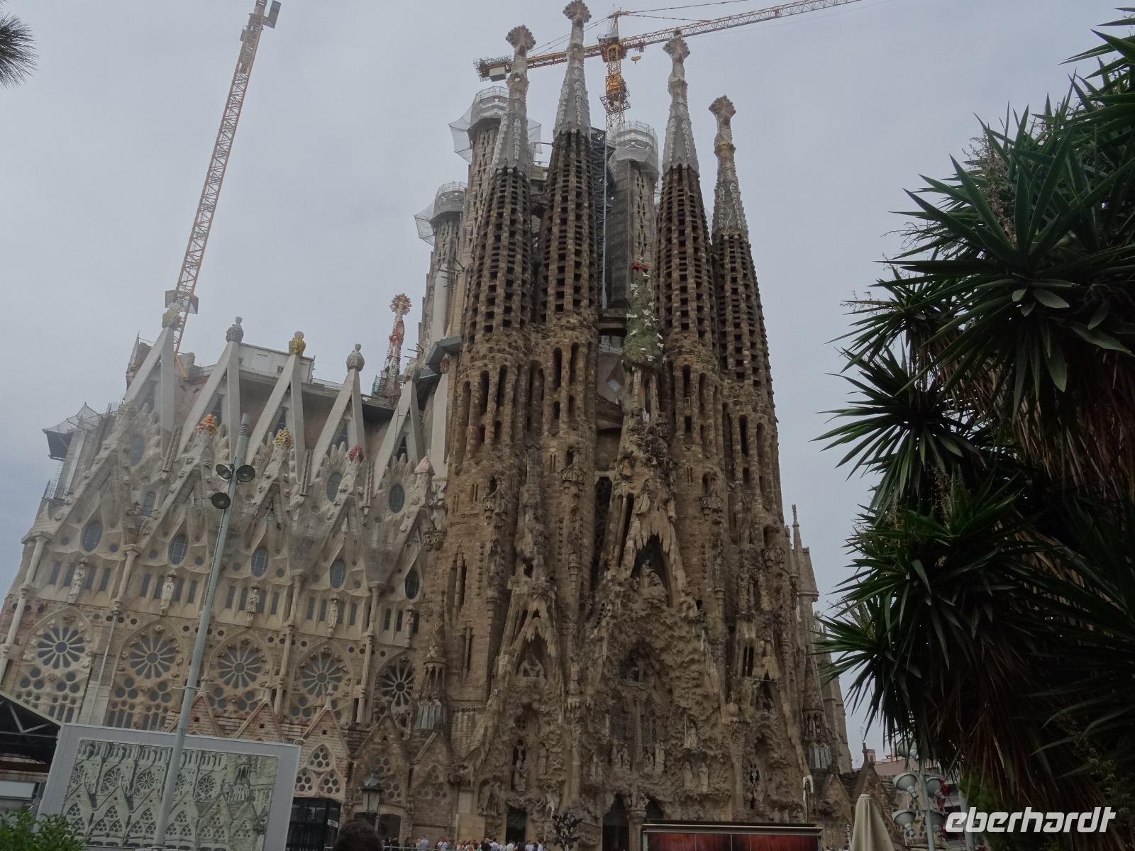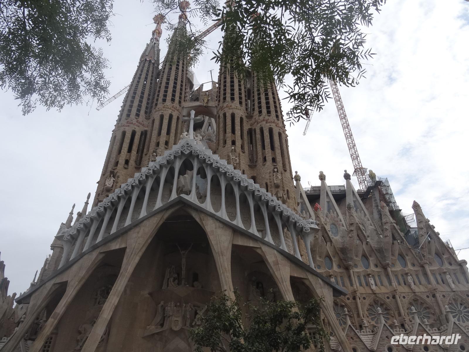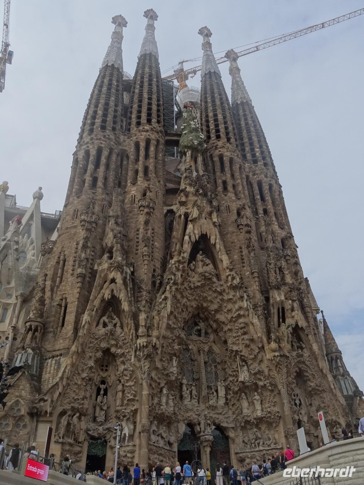 Und schon standen wir vor dem "Sühnetempel der heiligen Familie" = Sagrada Familia. Weit sichtbar das bekannteste Wahrzeichen Barcelonas. Mit ihren drei Großfassaden und den 18 spitzen Glasmosaiktürmchen ist sie ein Glanzstück der in Katalonien entwickelten Kunstrichtung - Modernismus. Seit 1882 wird an der Sagrada Familia gebaut und gearbeitet und zum 100. Todesjahres von Gaudi im Jahre 2026 soll der Bau frühestens abgeschlossen sein.