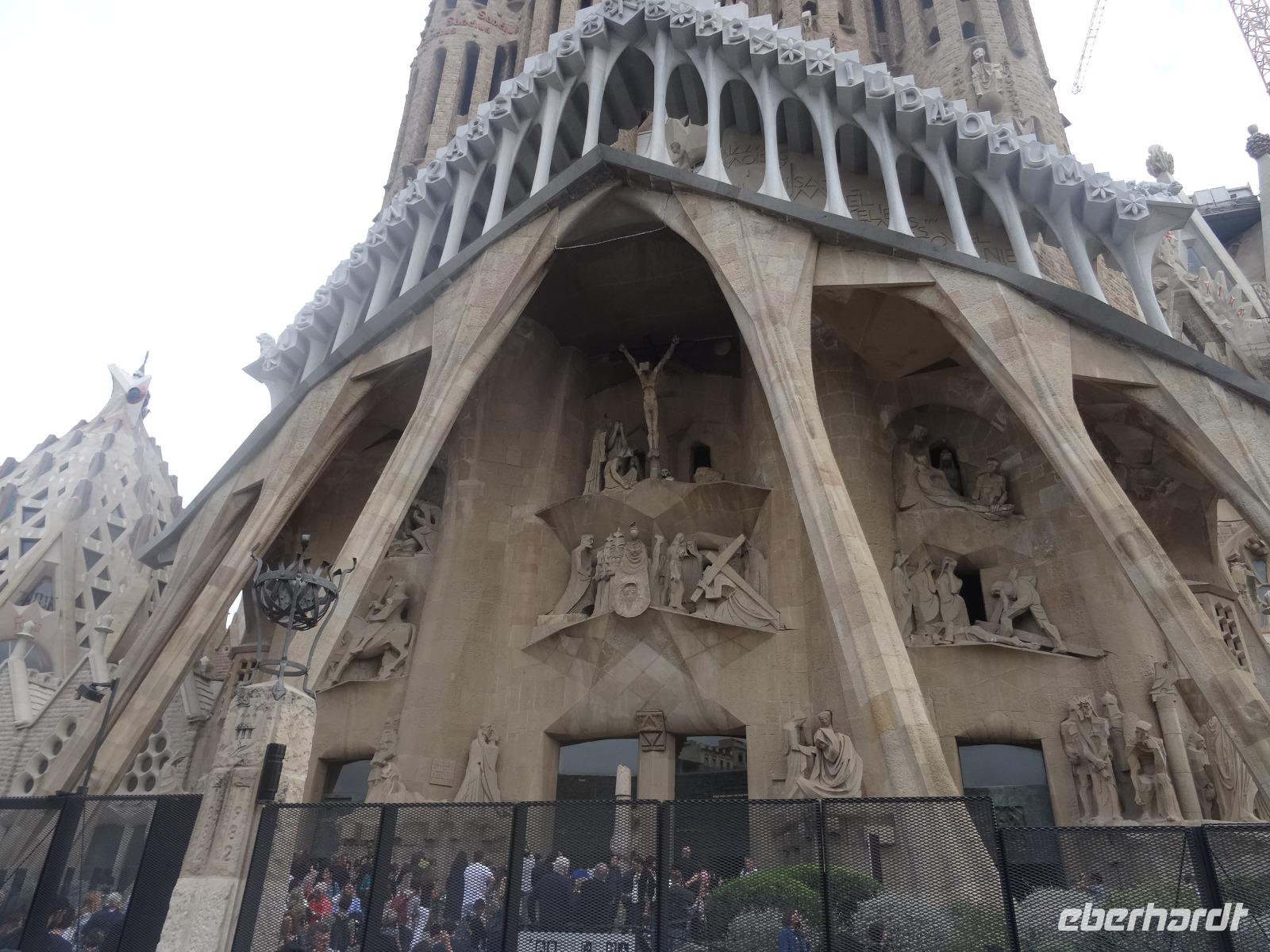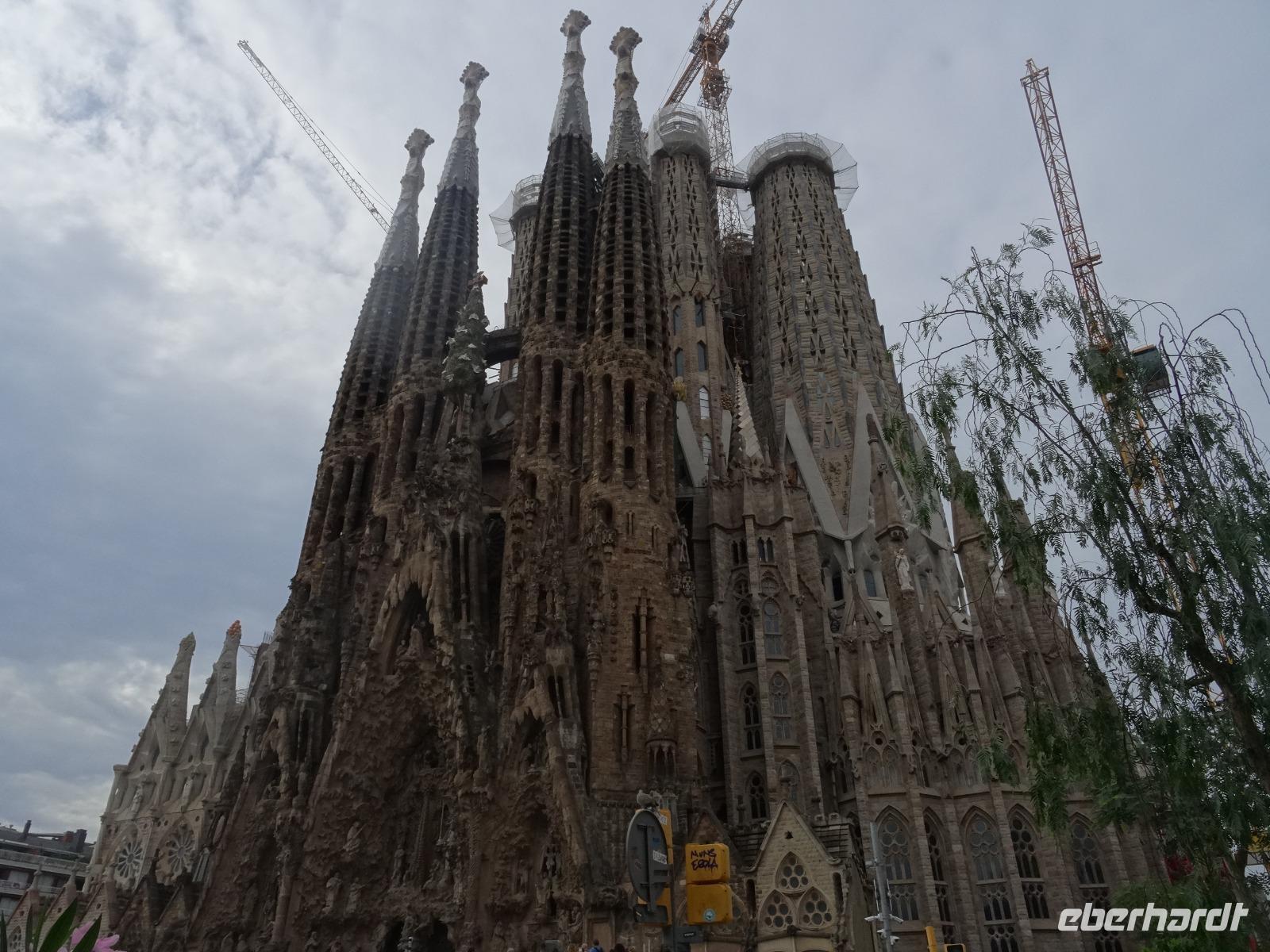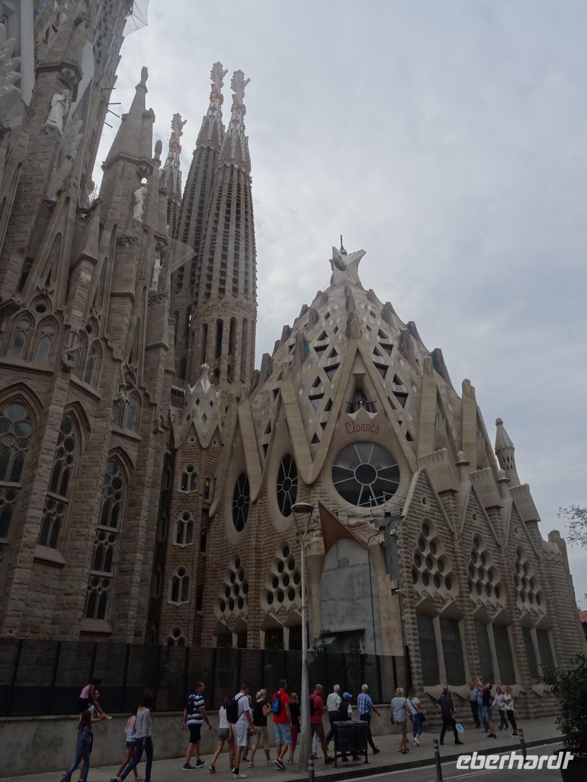 Und schon standen wir vor dem "Sühnetempel der heiligen Familie" = Sagrada Familia. Weit sichtbar das bekannteste Wahrzeichen Barcelonas. Mit ihren drei Großfassaden und den 18 spitzen Glasmosaiktürmchen ist sie ein Glanzstück der in Katalonien entwickelten Kunstrichtung - Modernismus. Seit 1882 wird an der Sagrada Familia gebaut und gearbeitet und zum 100. Todesjahres von Gaudi im Jahre 2026 soll der Bau frühestens abgeschlossen sein.