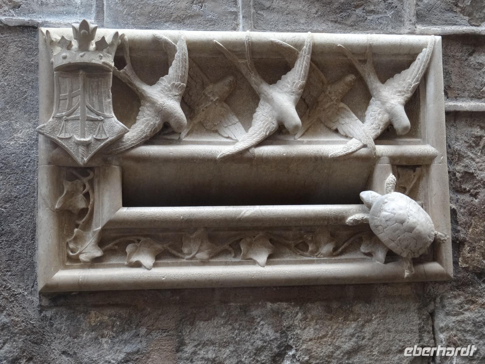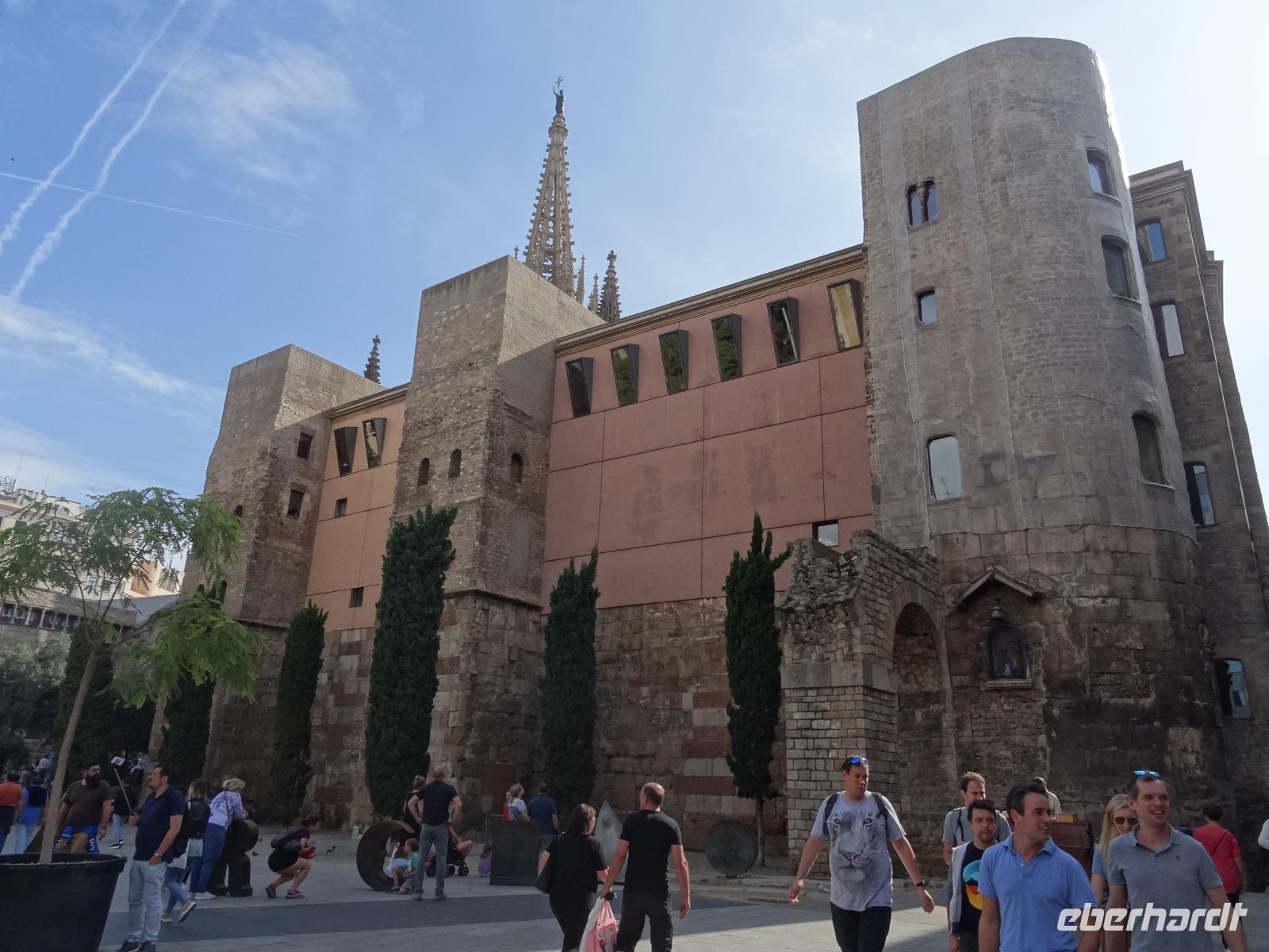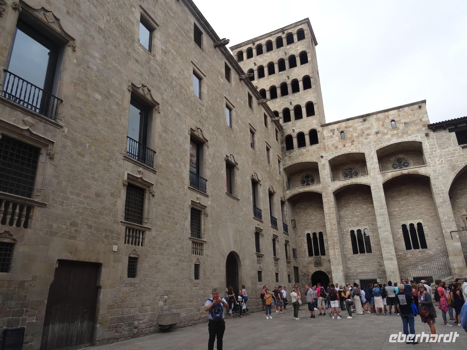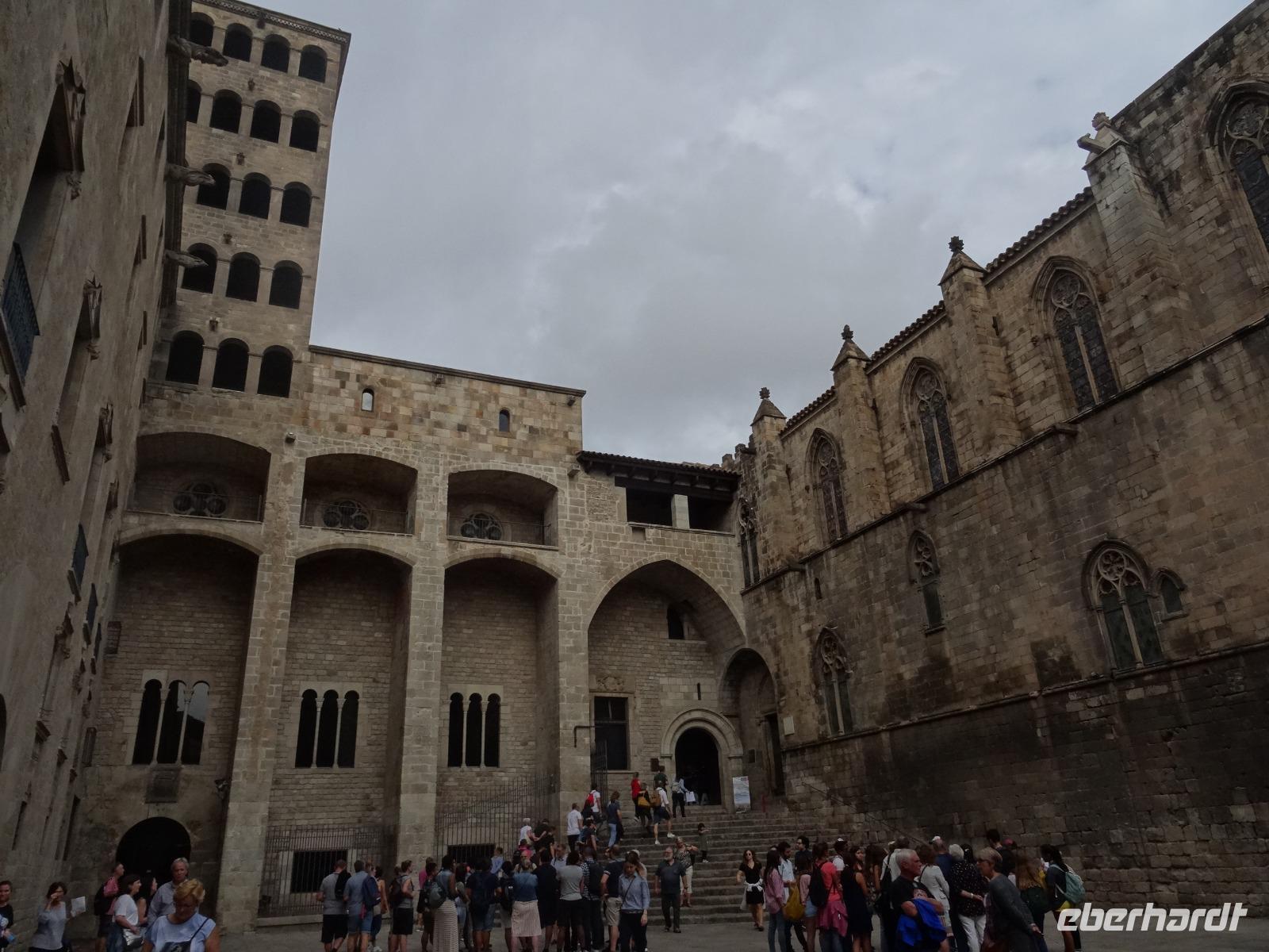 Im Anschluss spazierten wir durch das gotische Viertel = Barri Gotic, dem Kern des alten Barcelonas. Wir liefen vorbei am Ajuntament, seit 1372 Rathaus der Stadt und erreichten in der Folge den ehemaligen Königspalast. Hier soll Kolumbus nach seiner Rückkehr aus Amerika von König Ferdinand und seiner Gemahlin empfangen wurden sein.