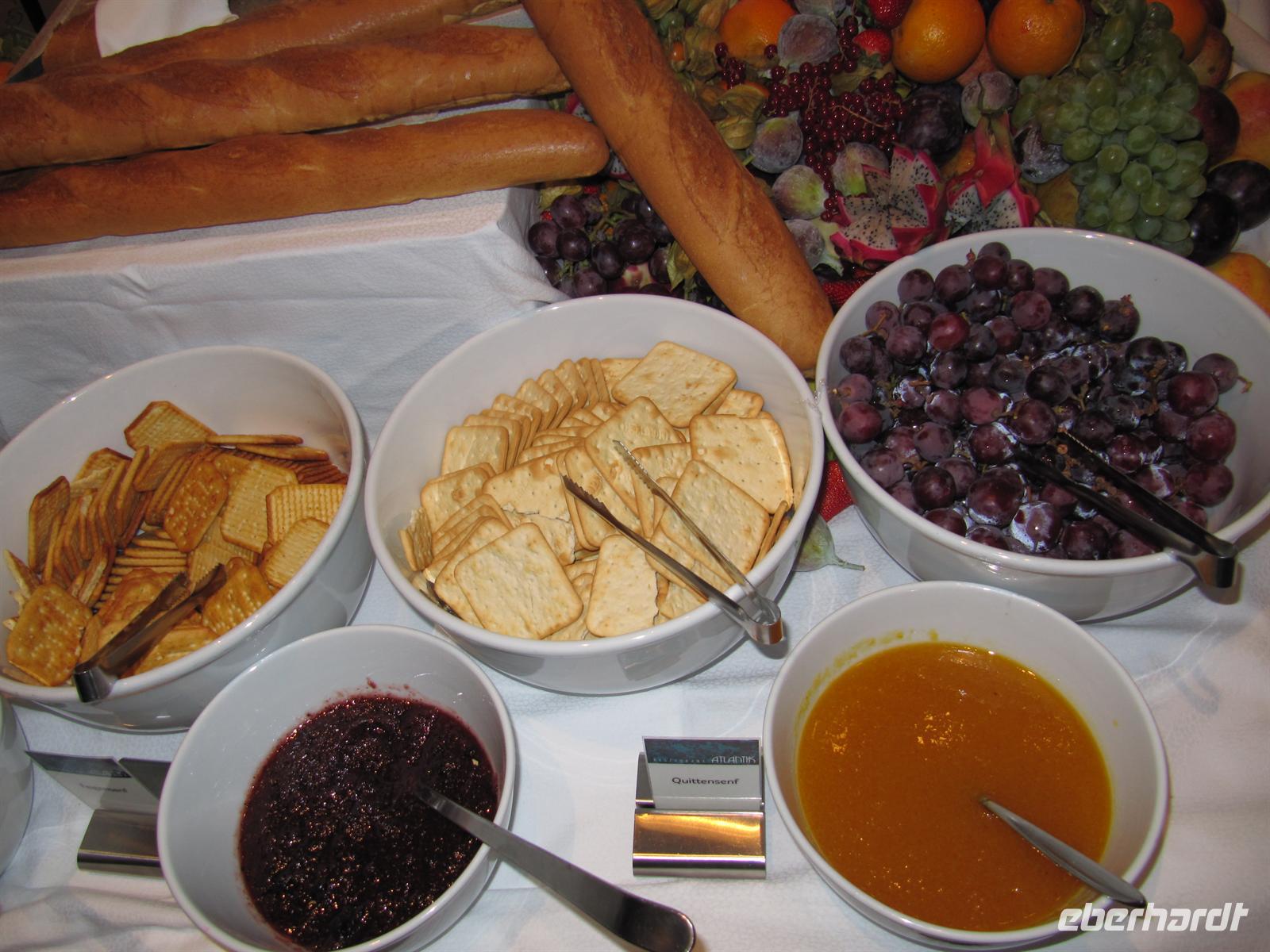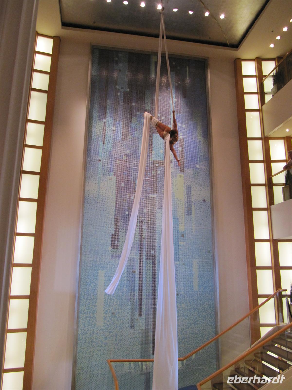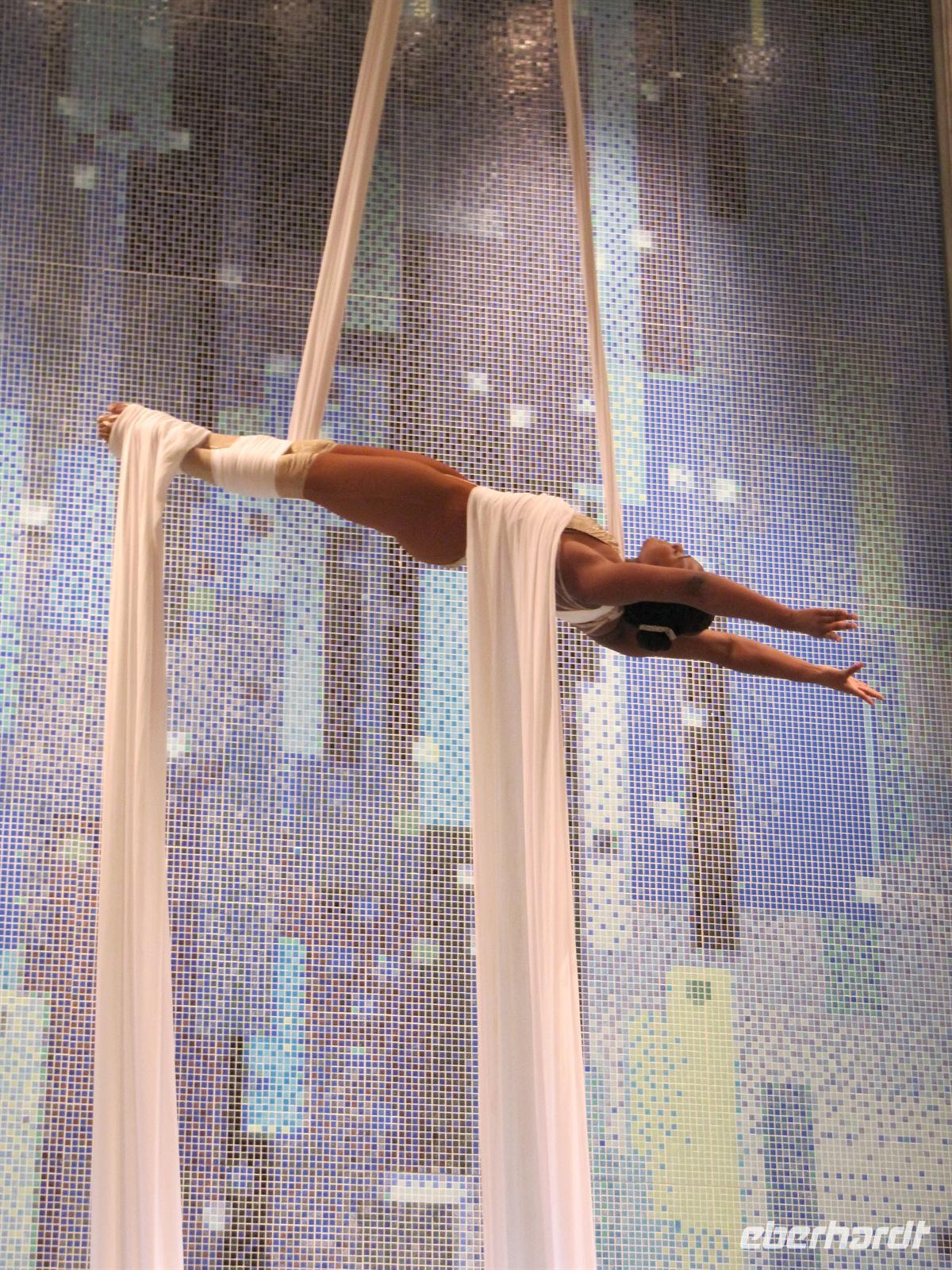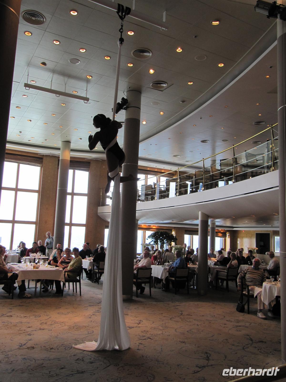 Der Rundgang endet im á la Carte - Restaurant „Atlantik“, so dass uns pünktlich zur Mittagszeit das gekühlte Mangosüppchen als Vorspeise gereicht werden kann. Garniert wird das exzellente Menü im zweistöckigen Restaurant mit einer atemberaubenden Seilakrobatik-Darbietung einer Artistin des Show-Ensembles.