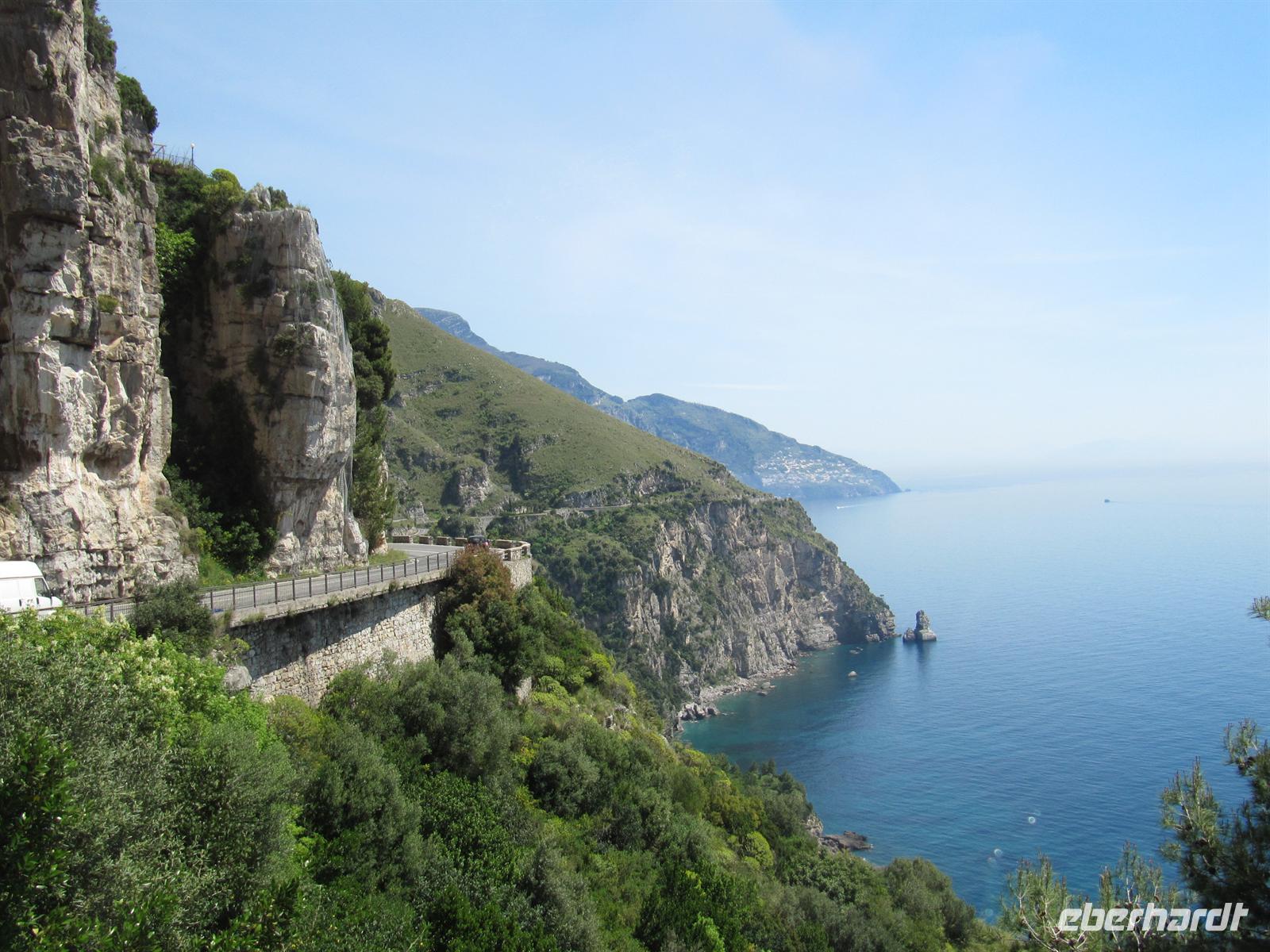 Weiter geht die Busfahrt nun entlang der Amalfitana, die zu einer der zehn schönsten Küstenstraßen der Welt gehört! Der Ausblick auf die Landschaft sowie der Blick aus dem Fenster die Steilküste hinab rauben uns nahezu den Atem. Unbeschreiblich schön schmiegen sich die kleinen Küstenstädtchen und -dörfer zwischen die steilen Felsklippen. Hinter jedem Berg taucht eine neue Bucht auf, eine neue Perle zeigt sich dem Betrachter. Ein weiteres Juwel ist Positano, welches wir bei einem Halt fotografieren können. Zitronenhaine, bunte Städtchen bieten herrlichen Kontrast zum türkisfarbenen Meer.
