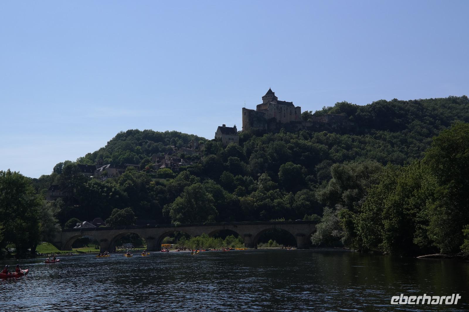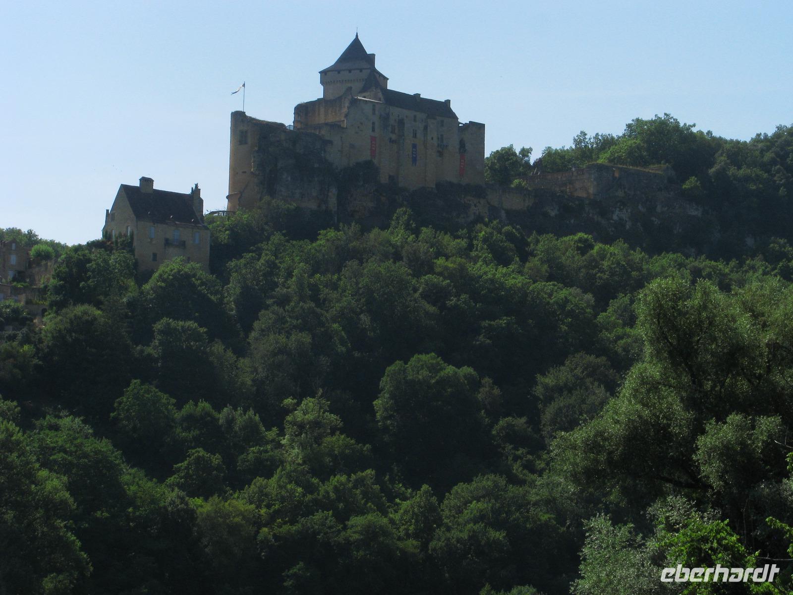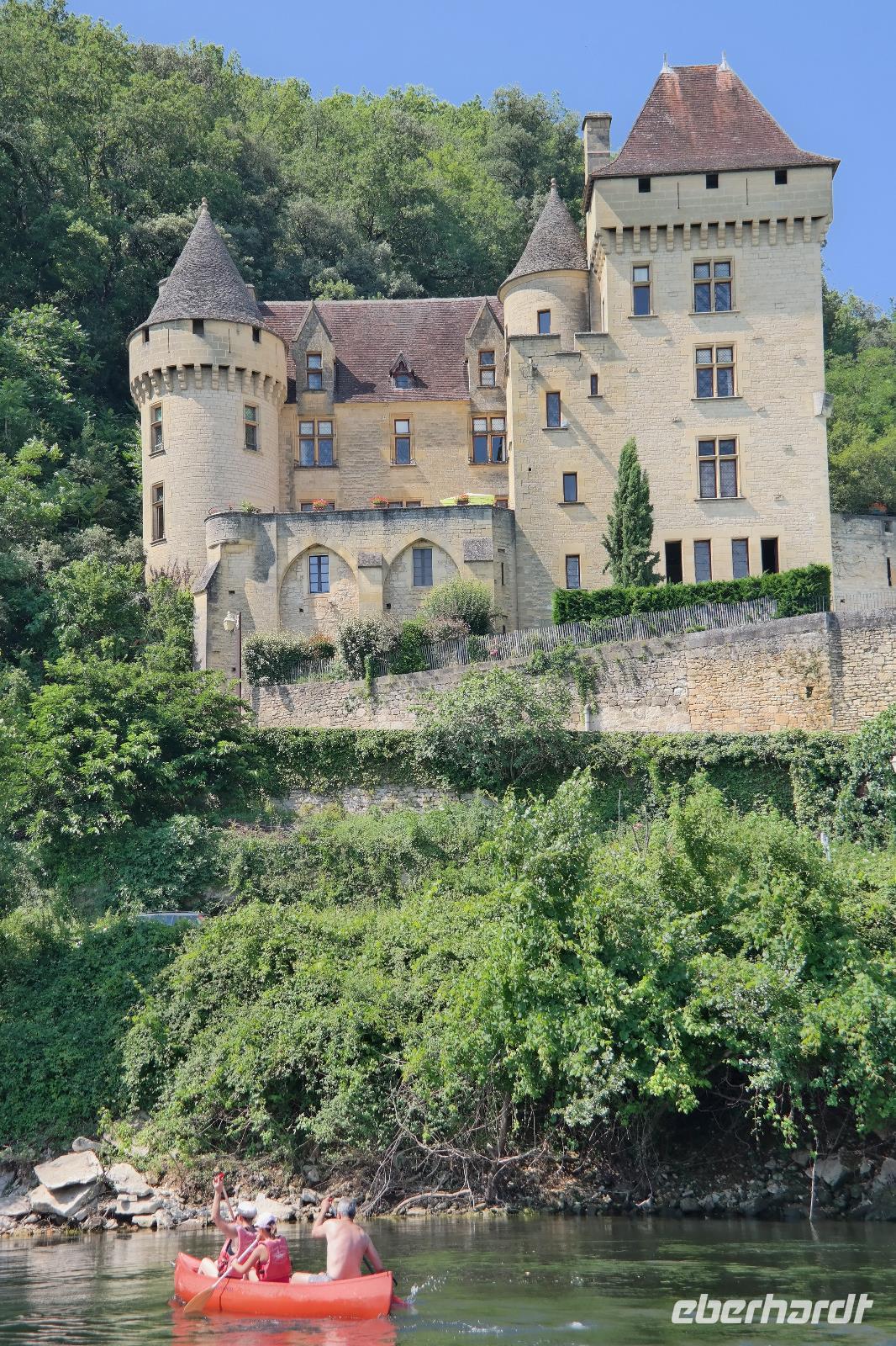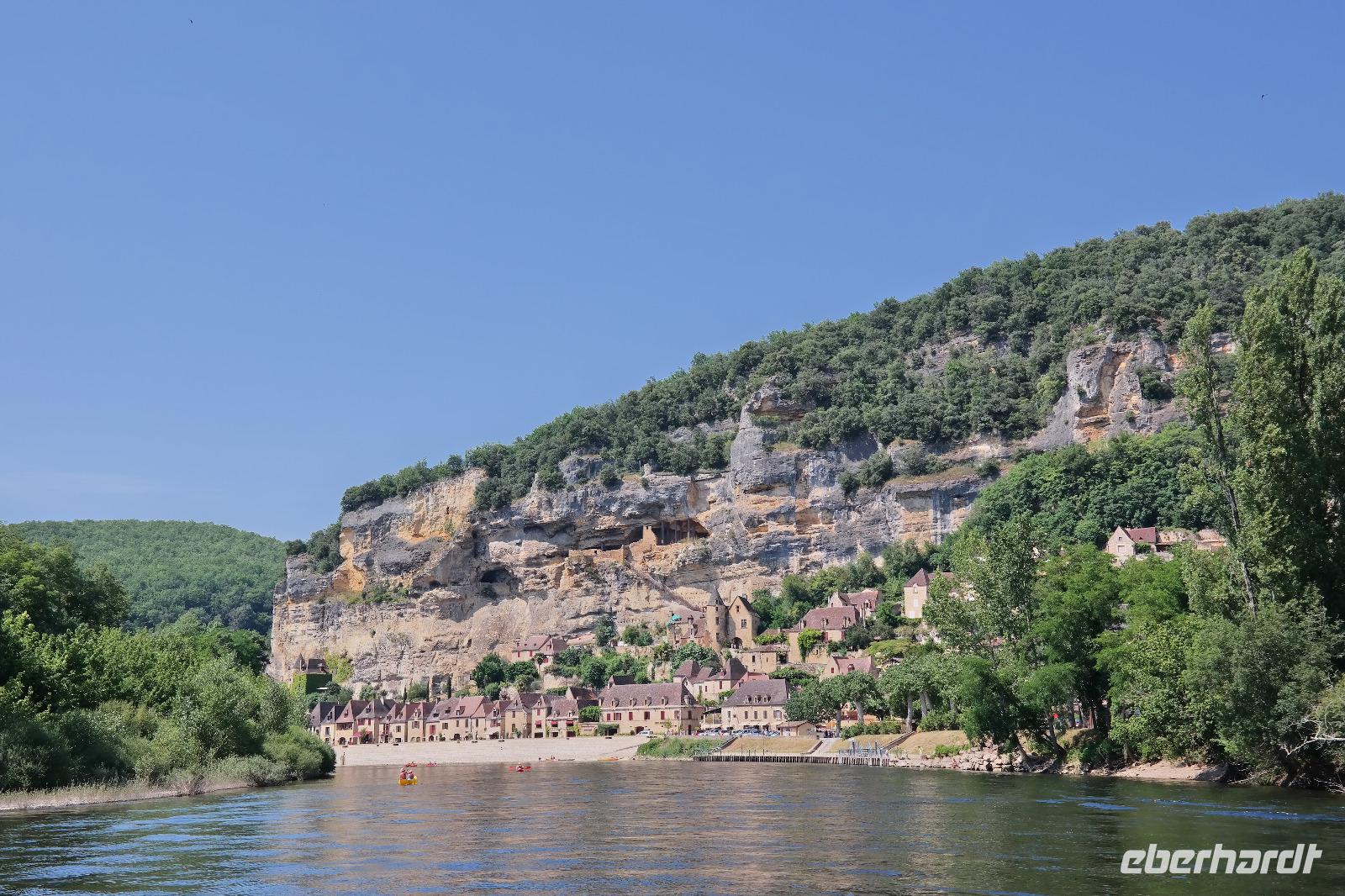 Das Dorf La Roque-Gageac, welches den Felsen an dem es klebt schon im Namen trägt, ist der Einstieg für unsere Bootsfahrt auf der Dordogne. Mit Sonnensegeln gut geschützt, genießen wir die wundervollen Ausblicke und den erfrischenden Fahrtwind. So mancher blickt jedoch neidvoll auf das Treiben im Wasser, denn hier tummeln sich die Kajaks und zahlreiche Schwimmer im kühlen Nass. Aber wir wollen nicht grollen und springen vor dem Abendessen noch in unseren Hotel-Pool.