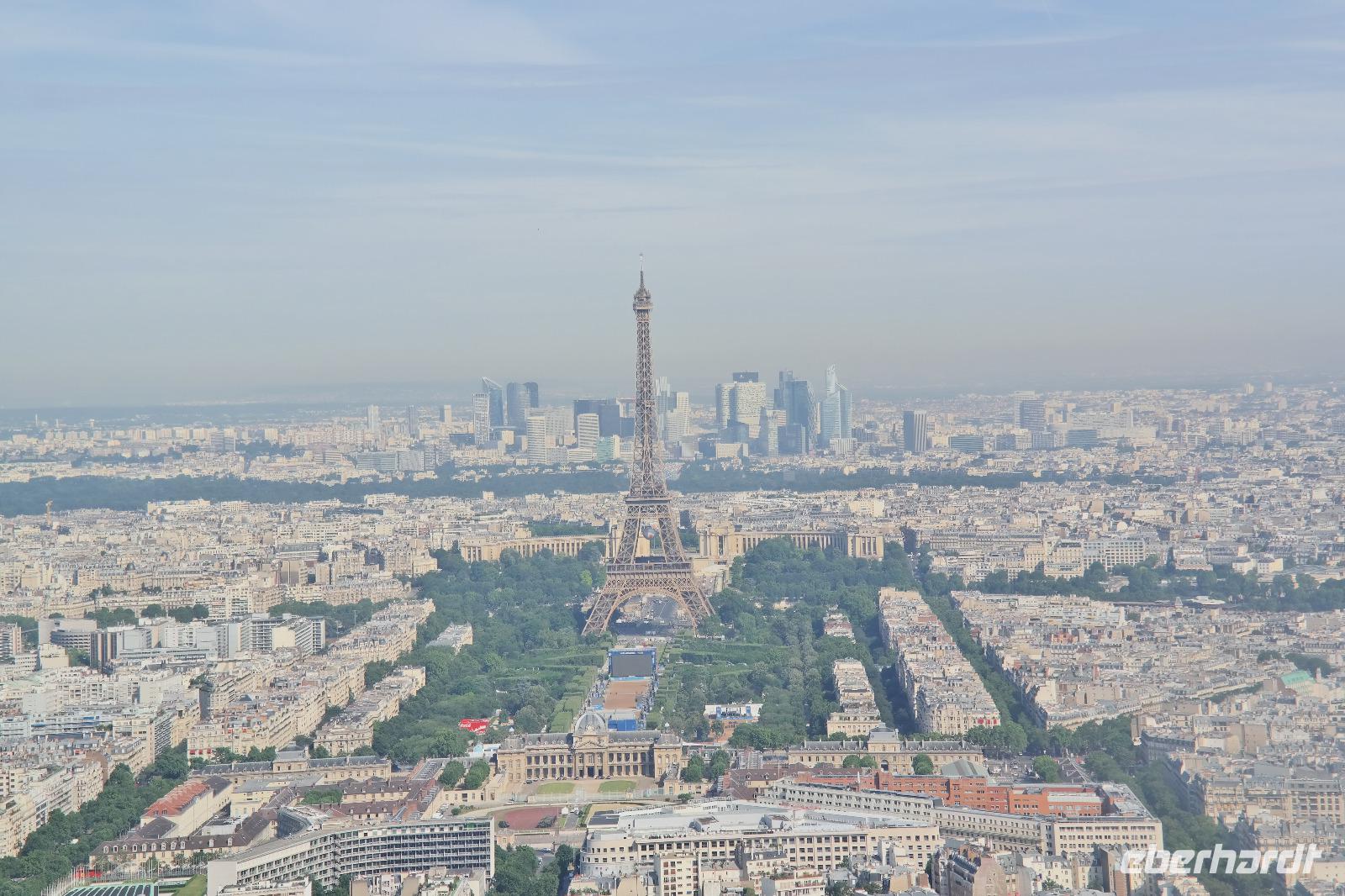 Der stehende Verkehr auf der Ringautobahn um Paris macht es möglich: Maik entscheidet sich für die Route durch die Stadt. Hier geht es immerhin voran und, sehr zur Freude der Gäste, wir machen eine außerplanmäßige Stadtrundfahrt. Vorbei an der blumengeschmückten Place de la Republique und dem Marais. Einst auf Sumpfland erbaut, zählt das traditionsreiche jüdische Viertel zu den Ausgehzentren der Stadt. Es folgt der Louvre. Als Residenz für die französischen Könige erbaut, beherbergt er einzigartige Kunstschätze und und führt die Liste der meistbesuchten Museen der Welt an. Links die Tuilleries, rechts Angelina, eine Institution in Sachen heißer Schokolade. Wir biegen ab, haben nun den Obelisque direkt vor uns. Nach rechts geblickt, L'Arc de Triomphe und schon sehen wir die goldene Kuppel des Invalidendoms, sowie den Eiffel-Turm. Auch das eigentliche Ziel unserer Fahrt, der Gare de Montparnasse, kündigt sich schon an. Der nur einen Steinwurf davon entfernte Tour de Montparnasse ragt imposant aus dem Häusermeer empor. Mit kleinem Gepäck, das große reist mit Maik und Madlen im Bus nach Bordeaux, bleibt uns noch Zeit einen Blick auf Paris zu werfen. Der Aufzug des Tour de Montparnasse bringt uns zügig auf die Aussichtsplattform: Paris aus der Vogelperspektive.