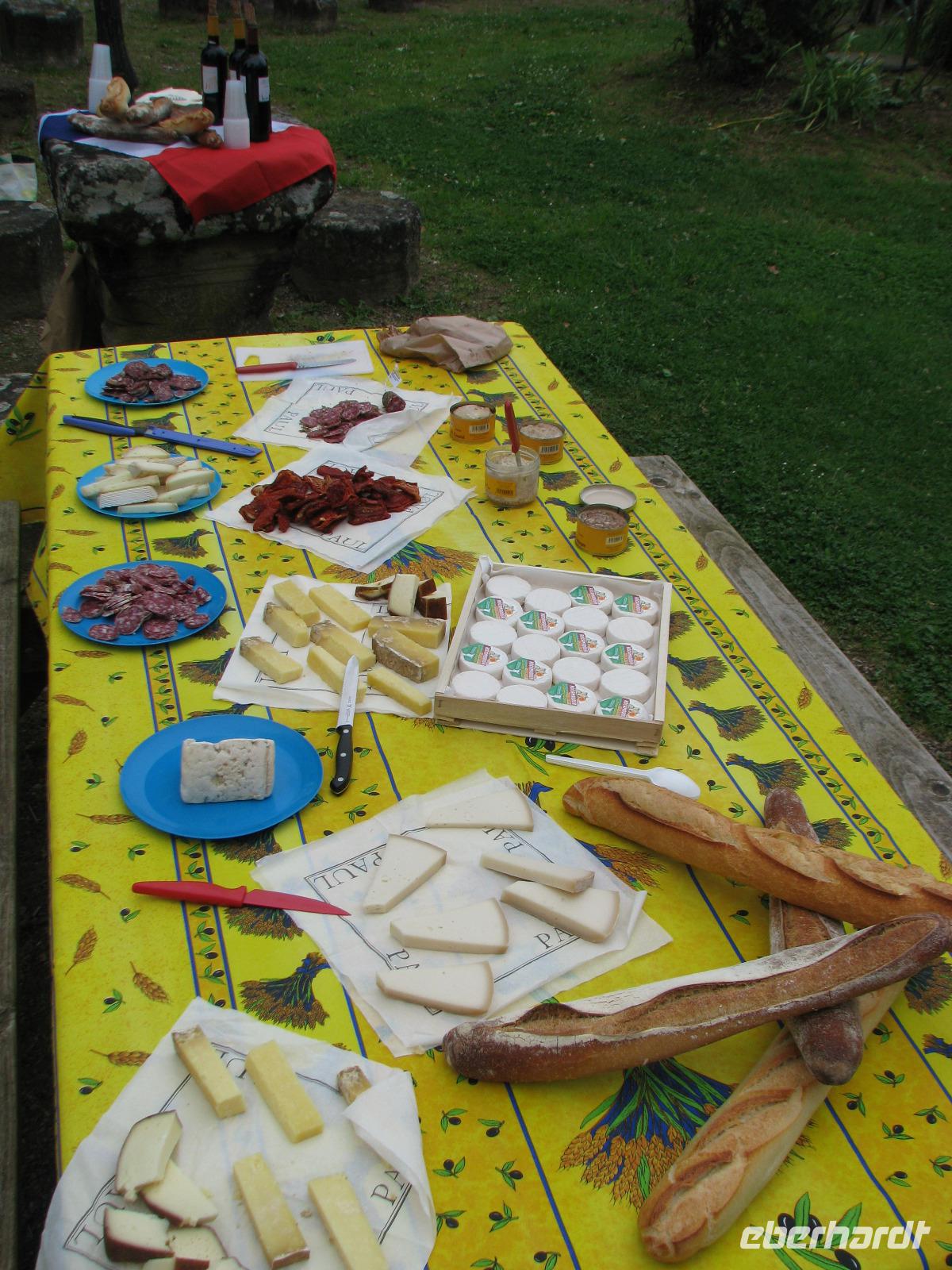 Mit Rocamadour lernen wir einen herausragenden Wallfahrtsort auf dem Jakobsweg kennen. Der Ort, der sich direkt am Felsen entlang erhebt, weist eine deutlich Dreiteilung auf: Unten die Häuser der Einwohner, darüber befindet sich der Klosterbezirk und über allem thront die Burg, die den Schutz des Ortes sicherte. Auch kulinarisch hat Rocamadour einiges zu bieten, schließlich kommt der gleichnamige Ziegenkäse hierher, den wir bei unserem Picknick im Anschluss an unsere Besichtigung genießen wollen. Bereits im vergangenen Jahr erweiterte sich zum Picknick unsere Gruppe um einen Überraschungsgast. War er damals noch rotblond, hat er dieses Jahr sein Fell schwarz gefärbt. In der Hundegemeinde von Rudelles scheint es sich herumgesprochen zu haben, dass an diesem schönen Platz immer etwas „abfällt".