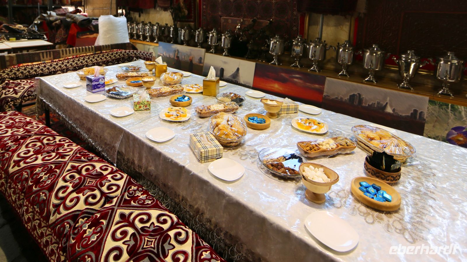 In kurzer Frist ist diese Großstadt inmitten einer endlosen Steppenlandschaft entstanden. Die Sichten begeistern. Nach nicht langer Zeit halten wir an einem Gehöft – Museum, Werk- und Heimstatt einer kasachischen Juweliersfamilie. Wir werden freundlich von der Hausherrin begrüßt und eingeladen, die Ausstellung regionaler und mittelasiatisch-kasachisch-russischer Handwerkskunst zunächst in einer Art Vorraum des Hauses zu besichtigen. Zahlreiche Samoware, Textilien, Geschirr und vieles mehr säumen die Wände. Die erste, hier reich ausgestattete, Jurte lockt zur Begutachtung. Ein gedeckter Tisch mit verschiedenen Backwerk, Käse, Süßigkeiten … kündet zudem: Eine gastliche Stätte!