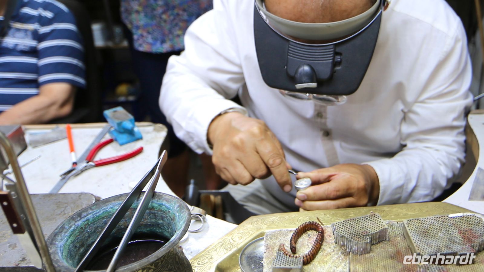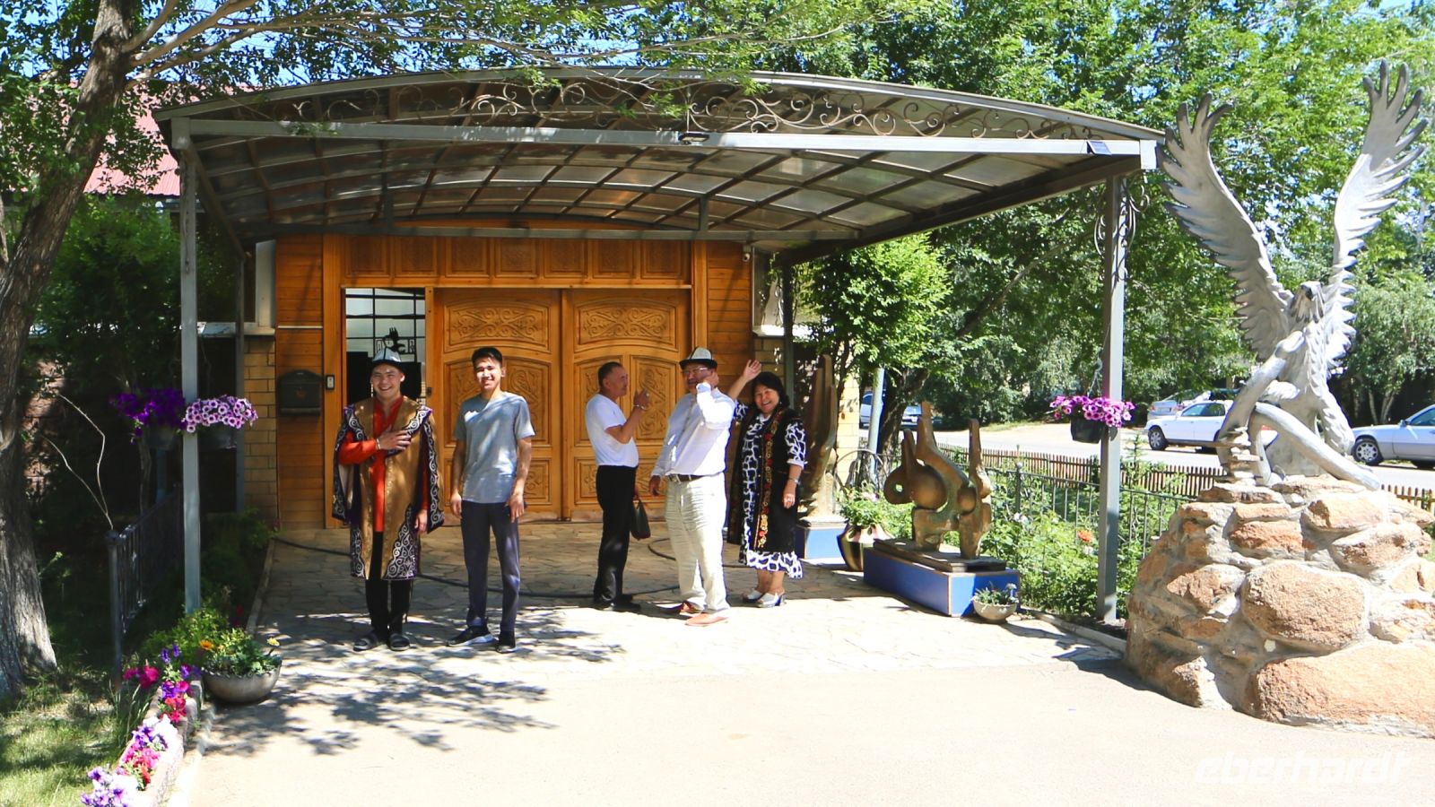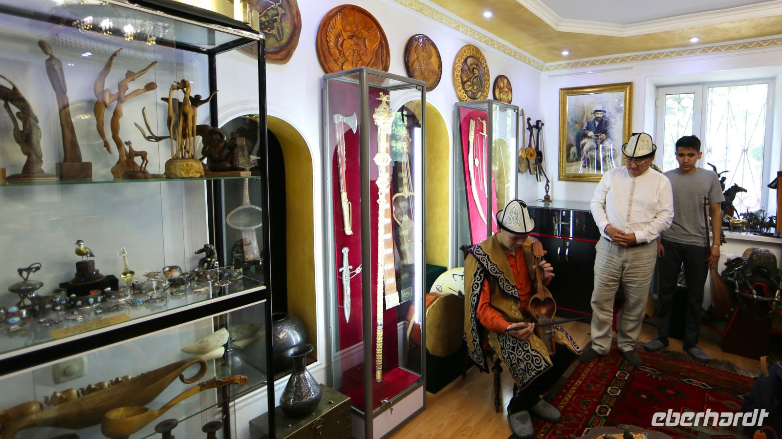 Bei Wein und Tee, den Kumys respektvoll schätzend, verbringen wir eine freundliche Weile. Schließlich lädt die Gastgeberin zur Betrachtung der Juwelierserzeugnisse in die inneren Räumlichkeiten. Der Hausherr, ein erfahrener Juwelier und anerkannter Experte zeigt Stolz gesammeltes und selbst gefertigtes Schmuckwerk. Seine Söhne bringen uns eine kleine Hausmusik unter anderem auf der Dromba zu Gehör, bevor uns der Meister in seiner Werkstatt näher mit seinem Handwerk vertraut zu machen sucht. Anschließend gibt es Gelegenheit, erste Souvenirs aus dem eigenen Sortiment zu erwerben. Dann setzen wir unsere Stadtfahrt fort.