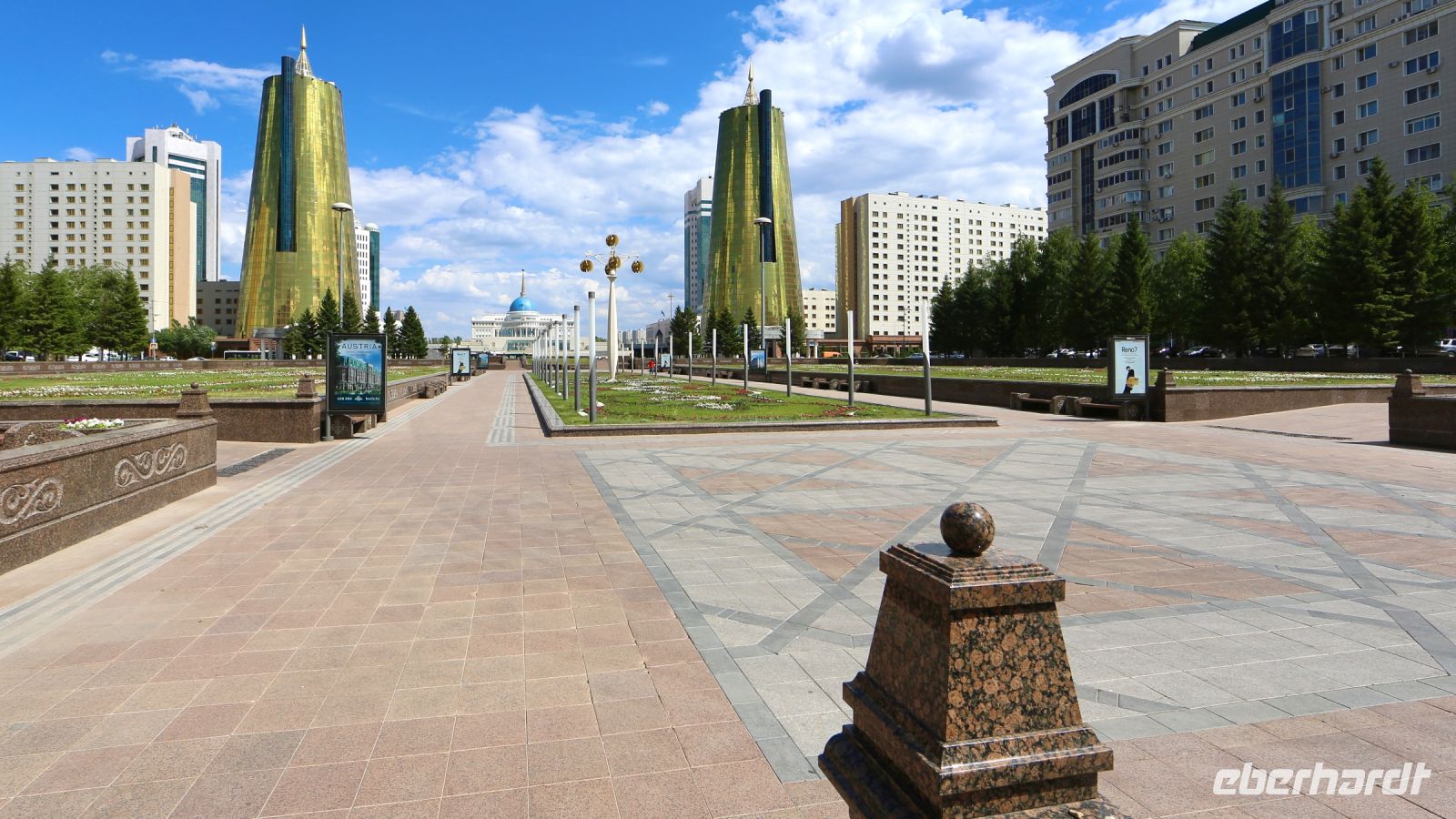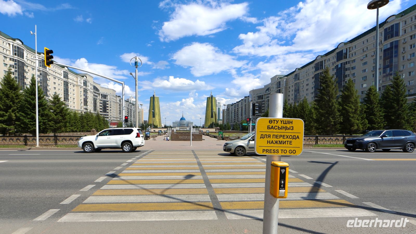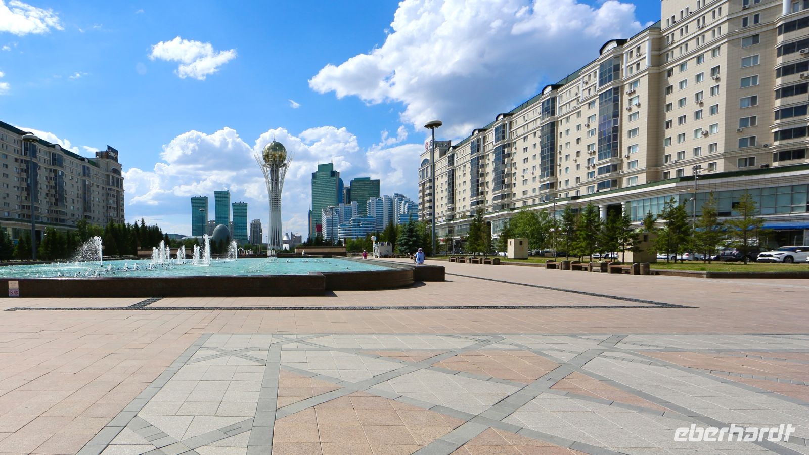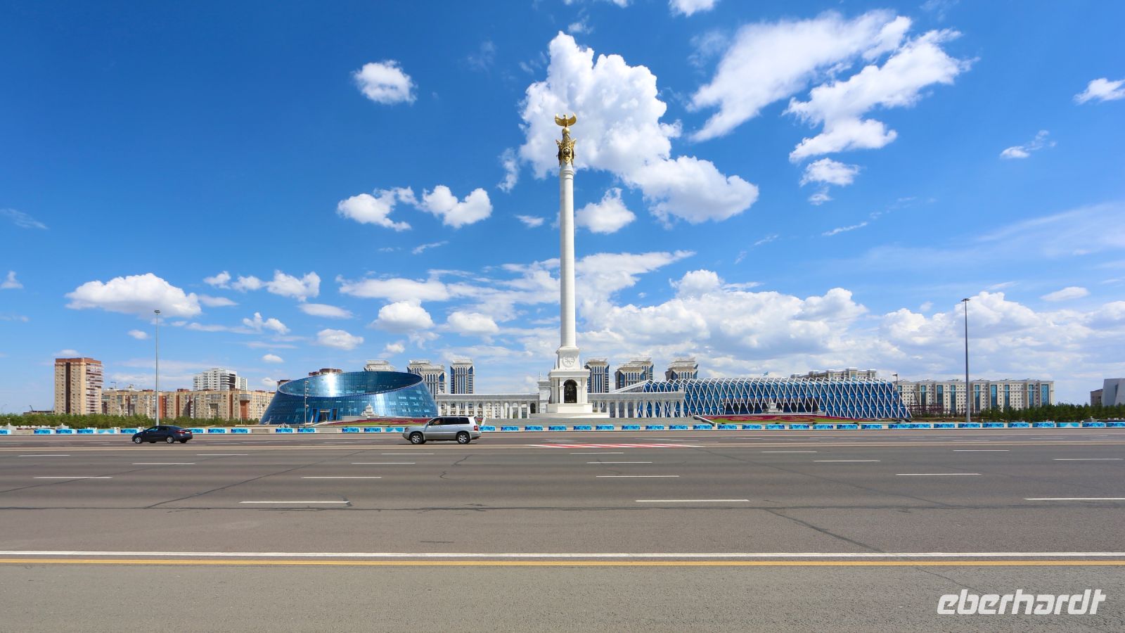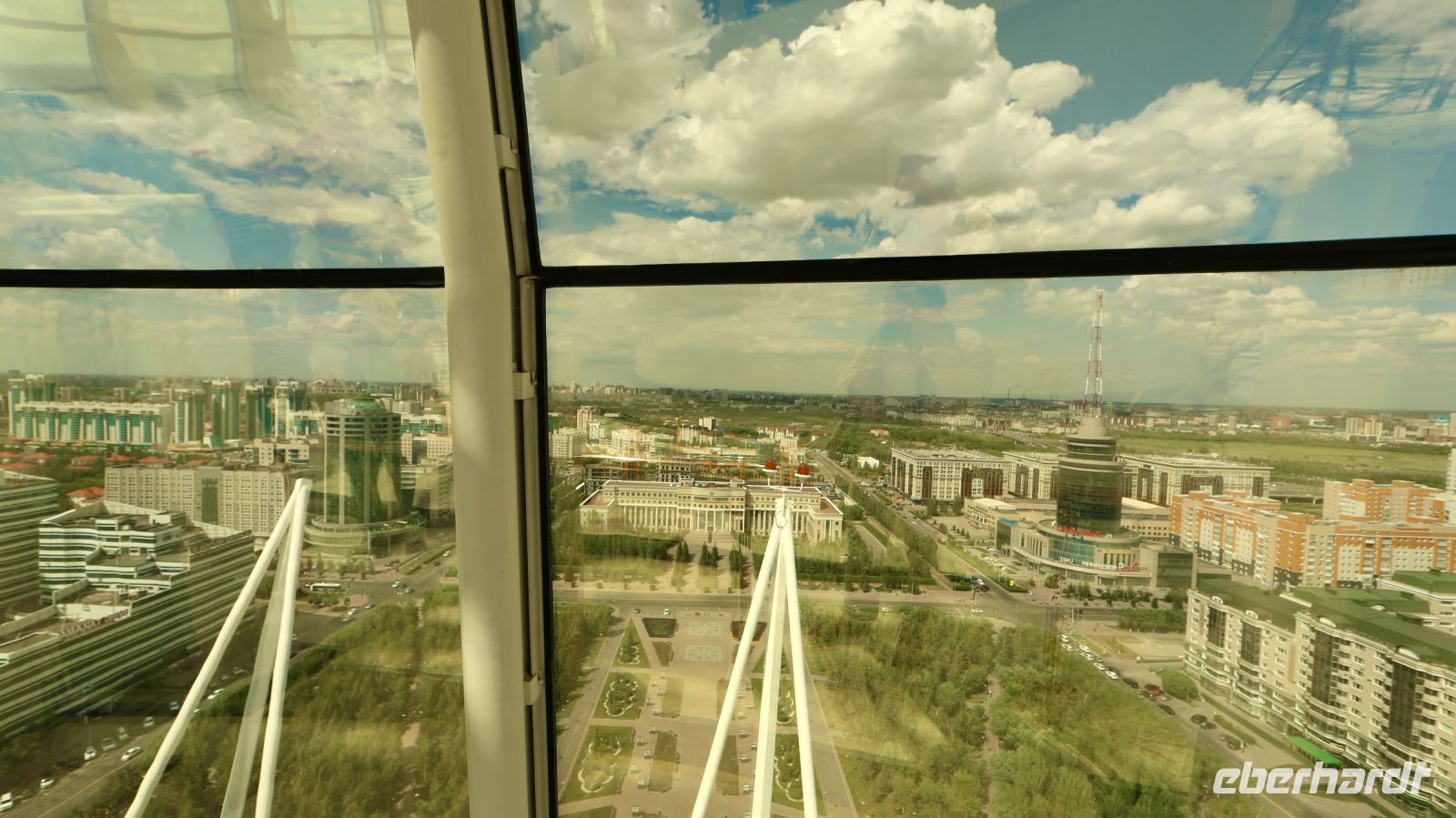 Fotostop – möchte man hier an jeder Ecke machen! Nur-Sultan ist beeindruckend und unerwartet. Im Zentrum steigen wir später zu einem kleinen Rundgang aus. Wir wollen zudem versuchen, auf den Bajterek-Turm zu gelangen. Die benötigten Eintrittskarten gibt's nur für’s Schlange stehen. Dana will das für uns erledigen und hat Erfolg. Nach unserem Rundgang, der uns durch die mächtige Fußgängerzone bis zum Ak-Orda-Präsidentenpalast und zurück führt, fahren wir hinauf, zu Nur-Sultans prächtigster Aussichtsplattform. Der Ausblick lohnt.