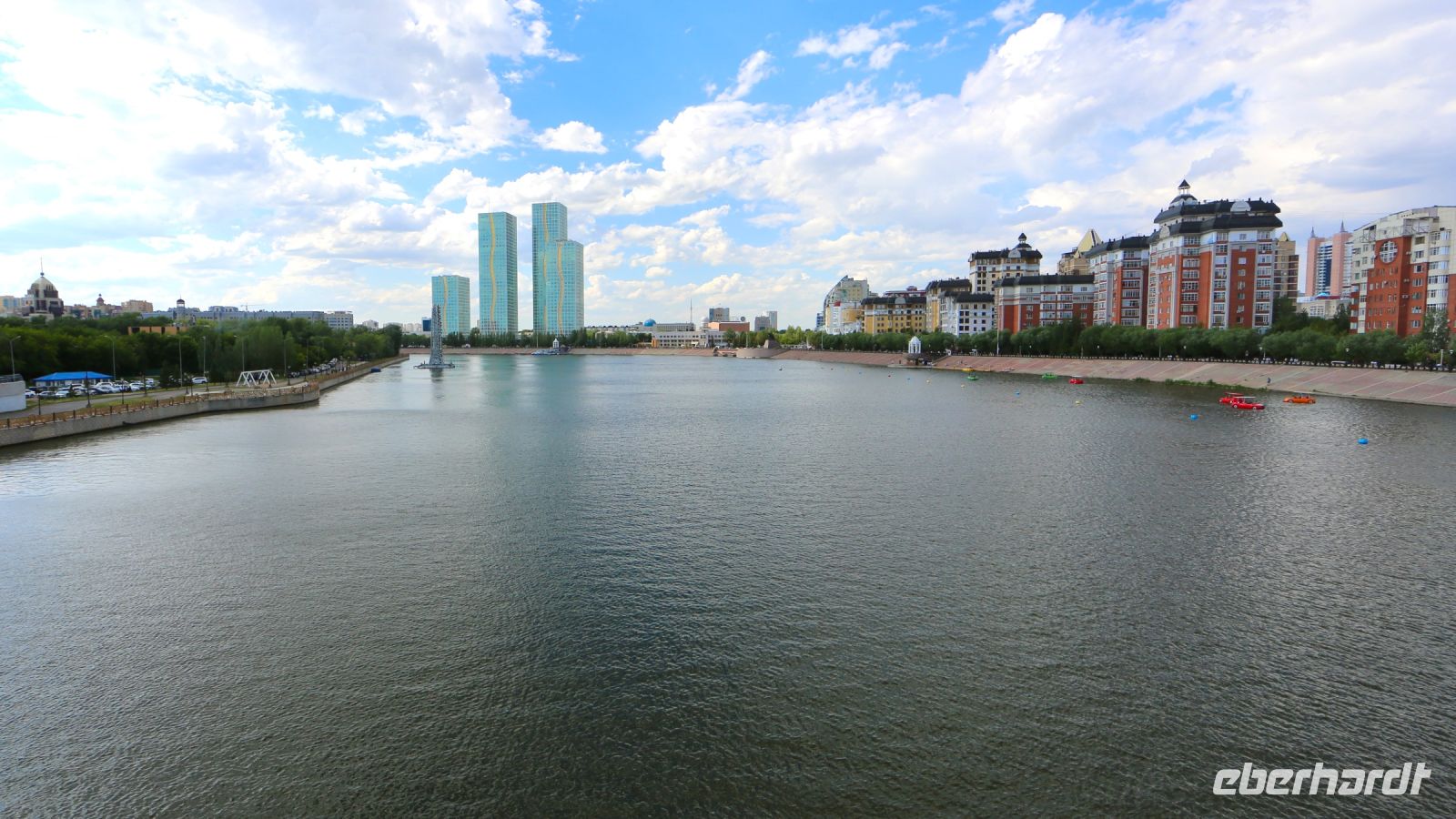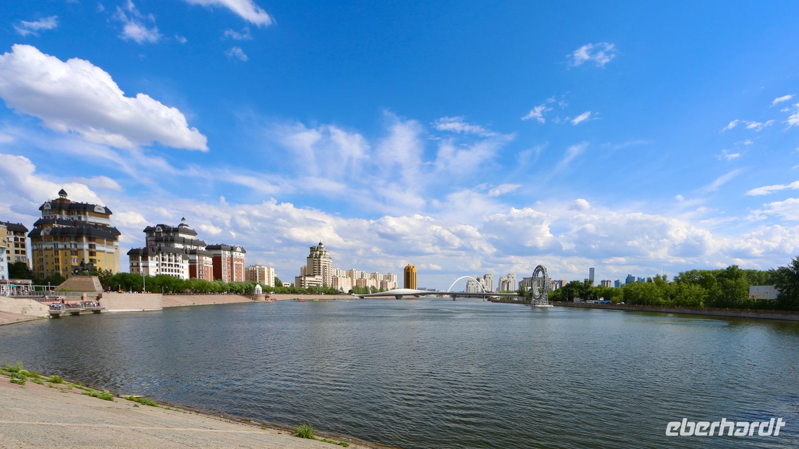 Bevor es dann zurück ins Hotel geht, wählen wir die großzügige Uferpromenade am Ishim für einen beschließenden Spaziergang. Groß und Klein tummelt sich vergnügt an diesem sonnigen Sonntagabend entlang des Flusses. Uns bieten sich ein weiteres Mal beeindruckende Blicke auf die moderne Stadtlandschaft.