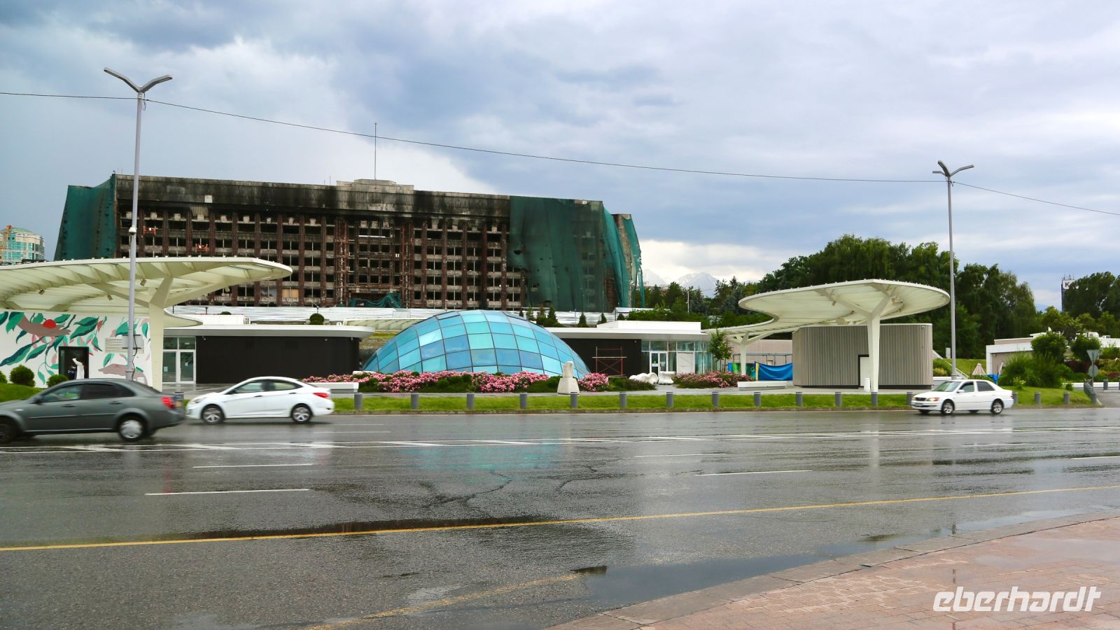 Unsere Exkursion am Nachmittag führt uns zunächst eine weitere Runde durch die Stadt. Wir halten am Unabhängigkeitsdenkmal und am ehemaligen Präsidentenpalast, welcher noch gezeichnet ist, von den jüngsten Unruhen am Jahresanfang. Regen setzt ein. Es stört uns nicht sonderlich. Wir sind gut ausgestattet. Dann geht es zum KokTobe, dem so genannten Hausberg der Stadt. Hinauf bringt uns eine Gondelbahn. Unterwegs gibt es freie Sicht auf Stadt und Umgebung. Auf 1.130 Meter erwartet uns eine Art Vergnügungspark. Die Sicht ist, des Regens wegen, nicht sonderlich. Wir kehren sehr bald wieder um, genießen nochmals den Blick aus der Gondel und machen uns auf den Weg nach Medeo.