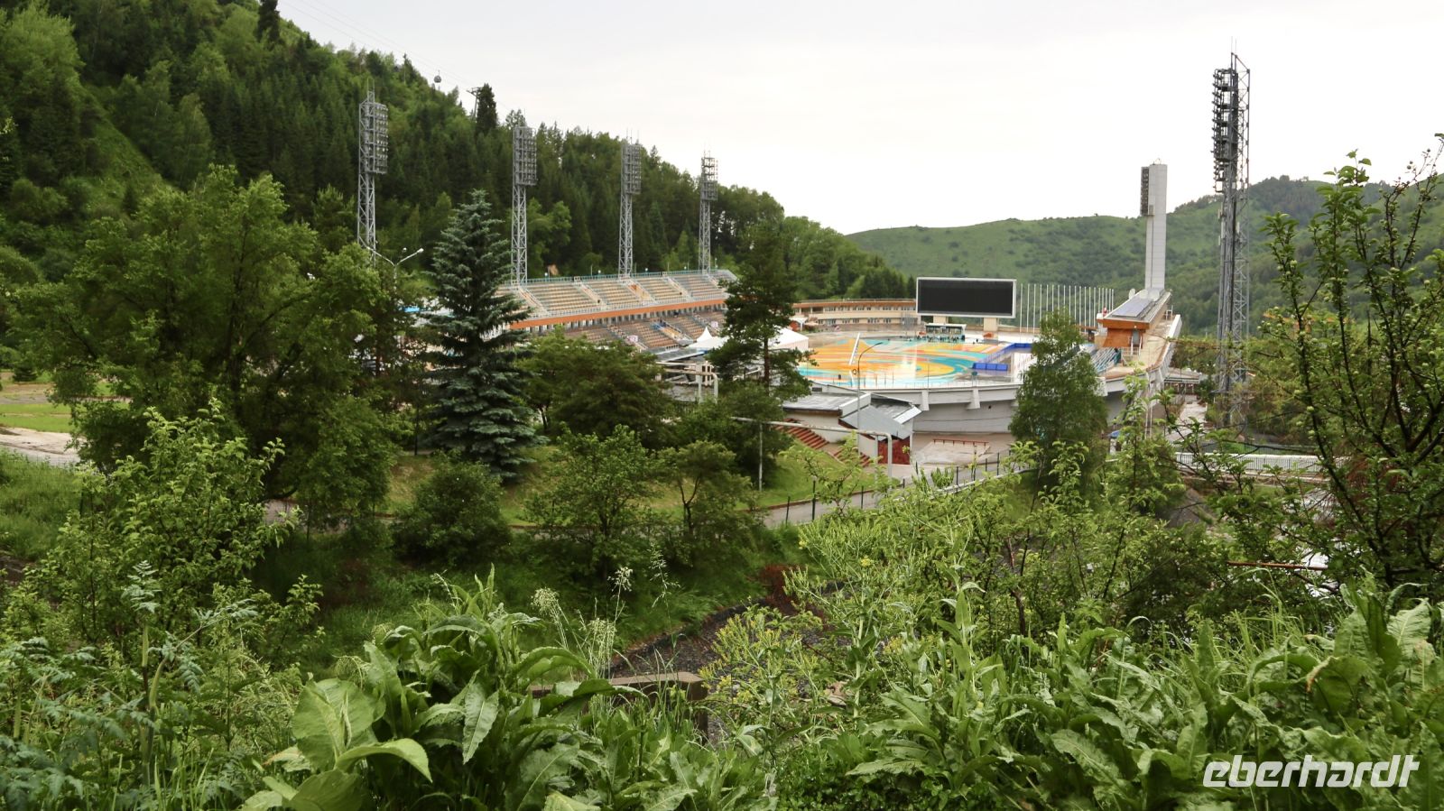 Im Tal von Medeo steht das berühmte Stadion. Auch hier sind die Berge der Umgebung mit Wolken verhangen. Der Regen hat zugenommen. Ein Teil von uns beschließt daher in der Nähe des Busses zu bleiben. Einige möchten zumindest ein Stück in Richtung der riesigen, das Tal sperrenden Staumauer aufsteigen. Bei schönem Wetter bietet sich von ihrem Scheitel bestimmt ein herrlicher Blick. Wir kommen nicht so weit. Beschwerlich ist der Aufstieg, heftig feucht das Wetter und nur kurz die Zeit. Wir können aber unterwegs und von der Anhöhe einen Blick auf die Anlage werfen.